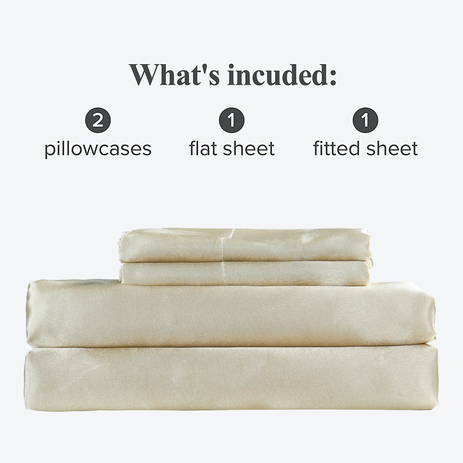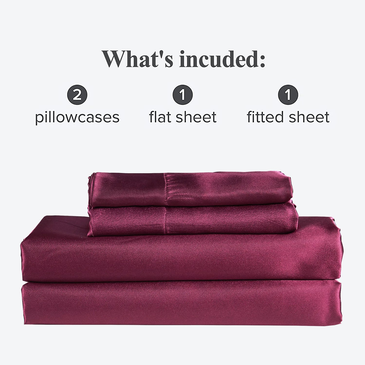- Queen size satin sheet set 4PC includes: 1 flat sheet 90"x102", 1 fitted sheet 60"x80"+14" and 2 pillow sham: 20"x30". King size satin sheet set 4PC includes: 1 flat sheet 102"x105", 1 fitted sheet 60"x80"+14" and 2 pillow sham: 20"x40".