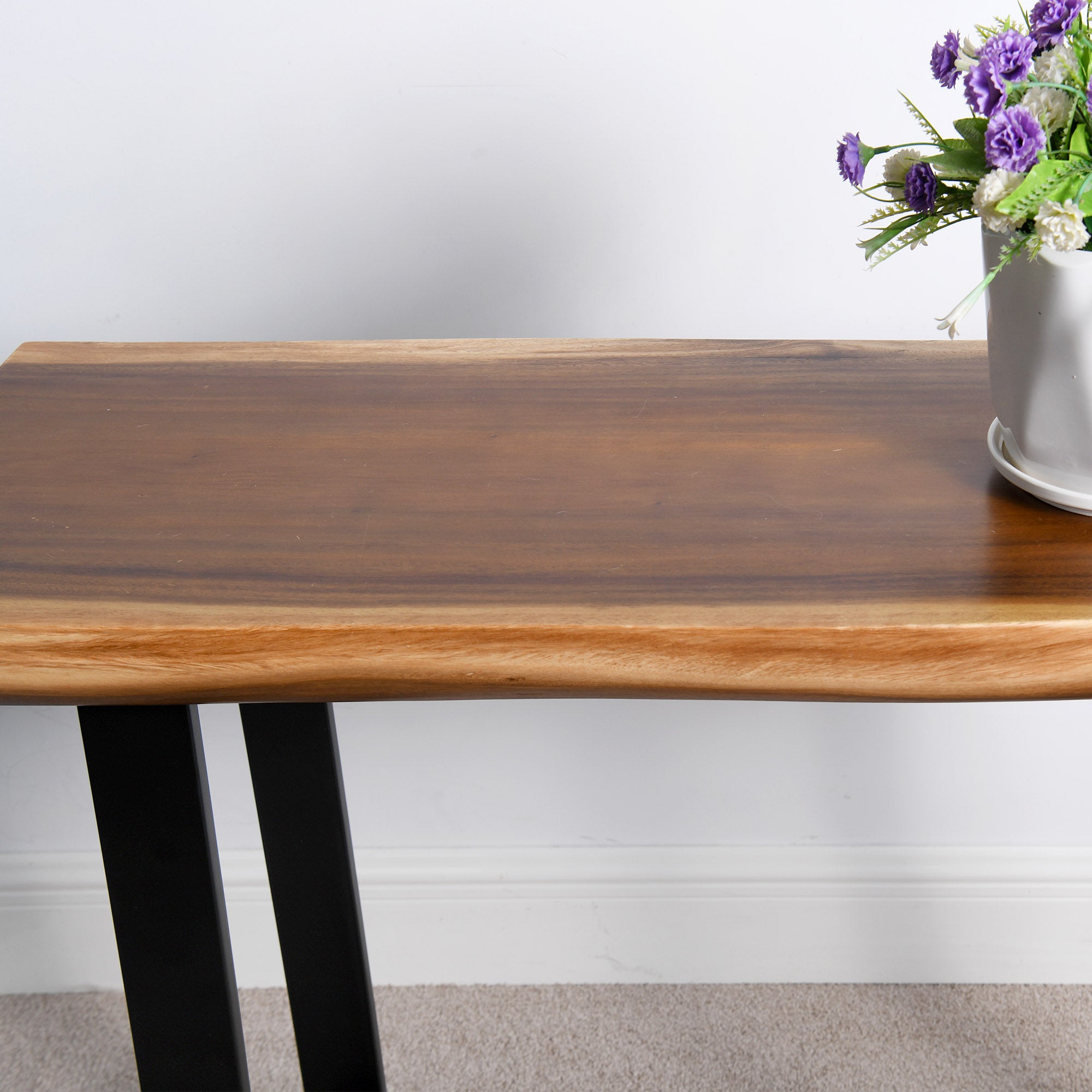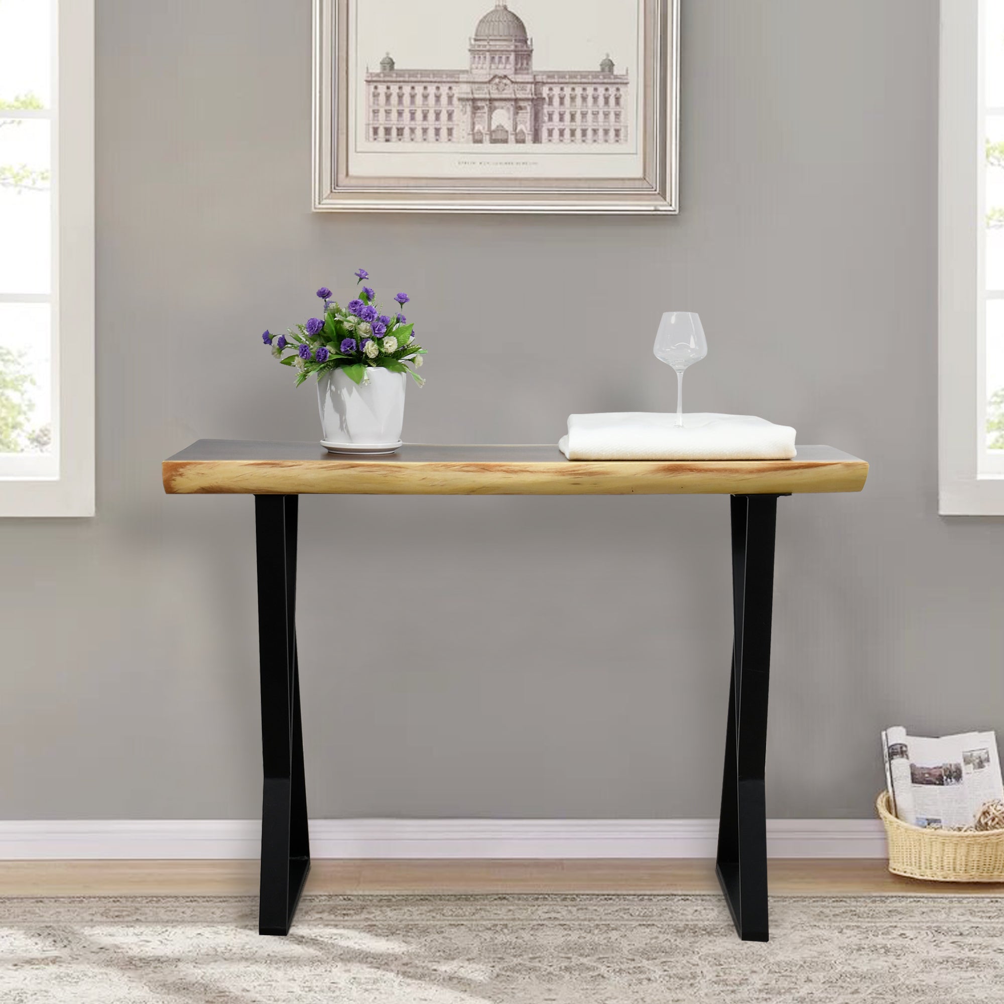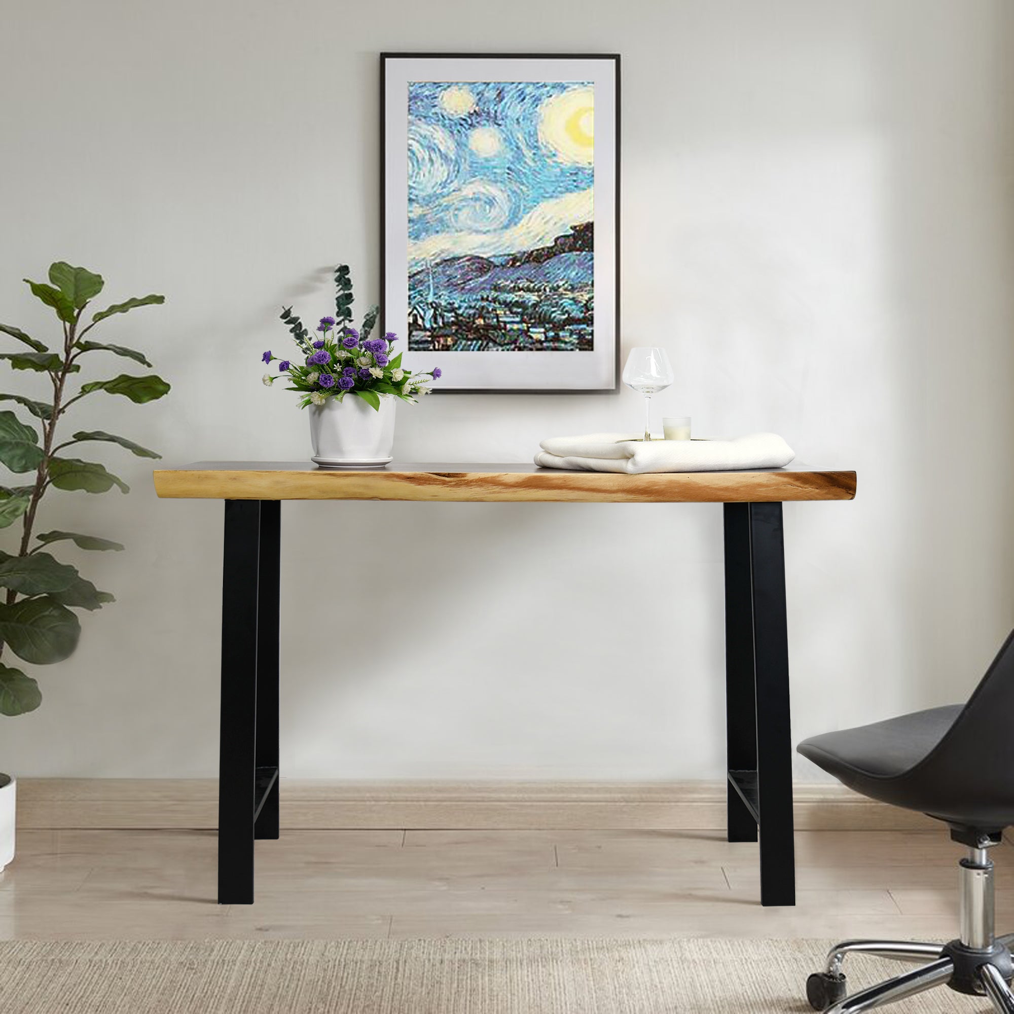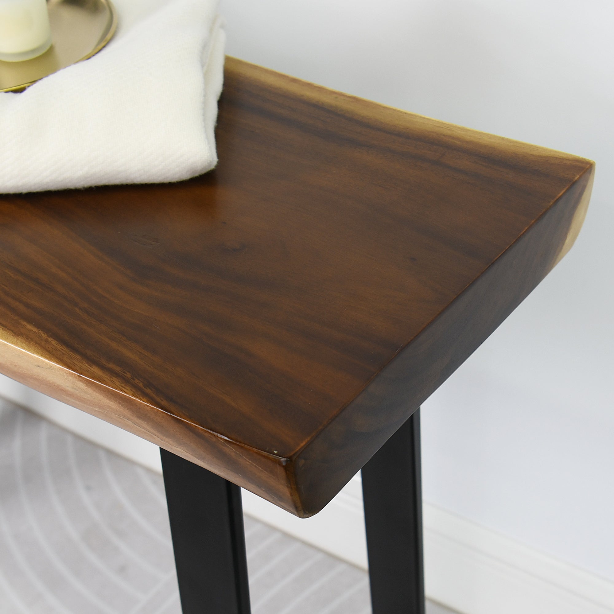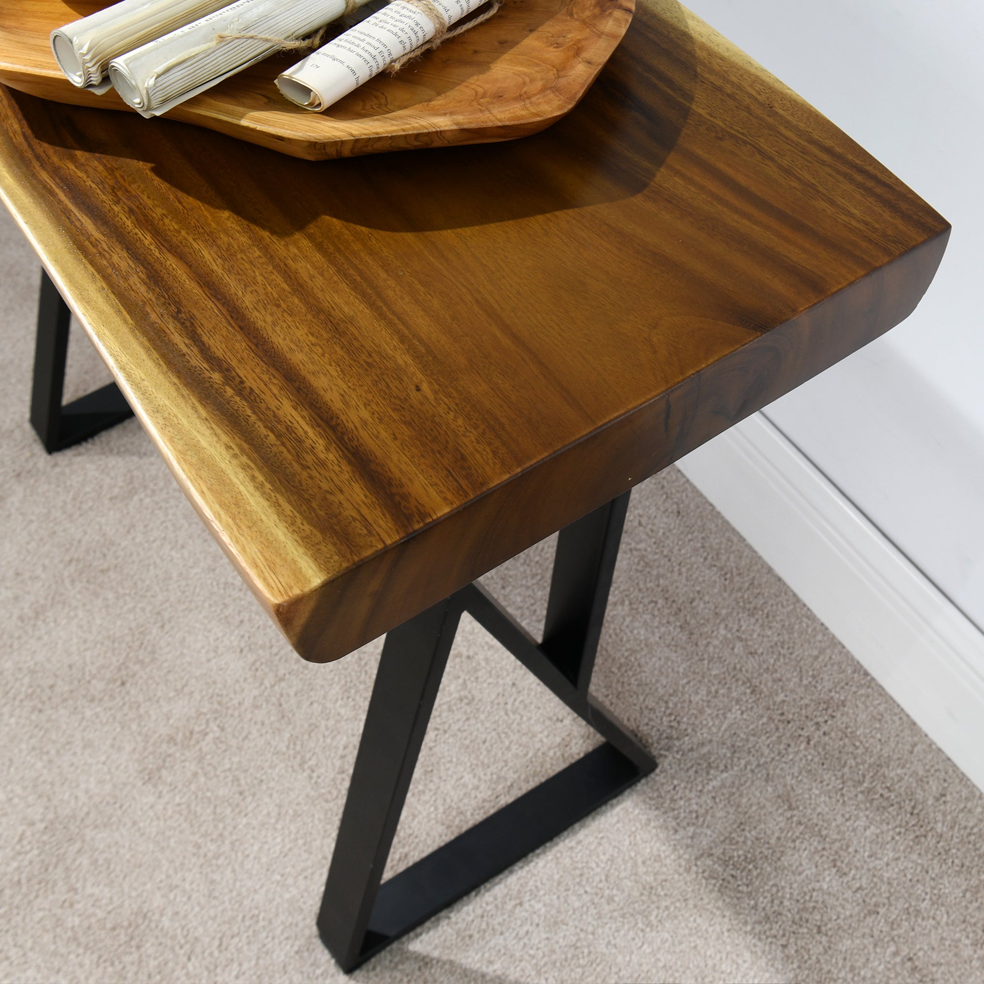 Elevate your living space with this Natural Wood Rectangle Coffee Console Table crafted from suar wood. Each piece is a unique work of art, showcasing its own distinct shape and grain pattern. Suar wood is not only beautiful, but also practical, making it a timeless living accessory. Please note that finished measurements may vary 1-2 inches due to the natural patterns of the wood. Skilled partisans hand-pick and sand down each slab of wood to preserve its natural shape, wood grain patterns, and color. The wood undergoes a meticulous multi-step process that includes recombination, polishing, painting, and waxing, and is finished with a natural lacquer for added durability. With proper care and weight capacities followed, this coffee console table will last a lifetime.