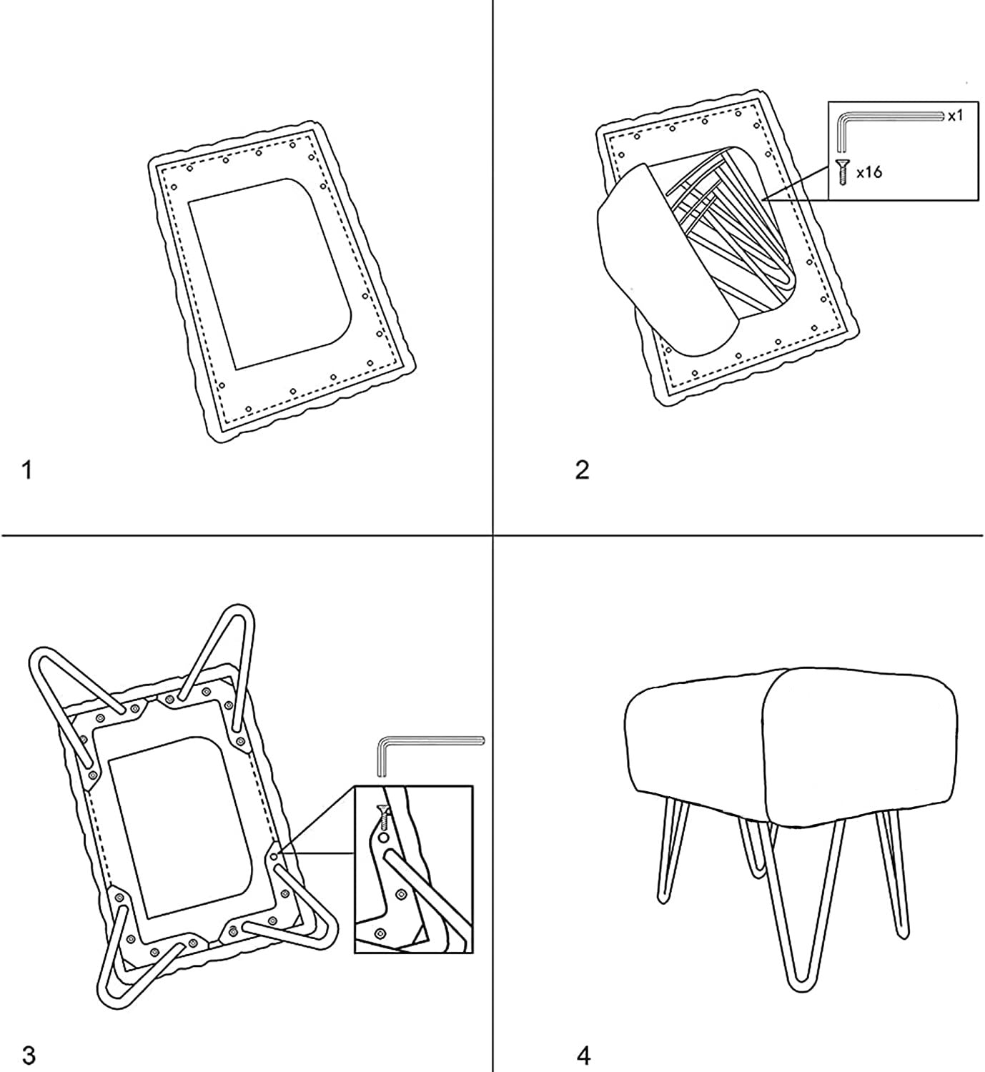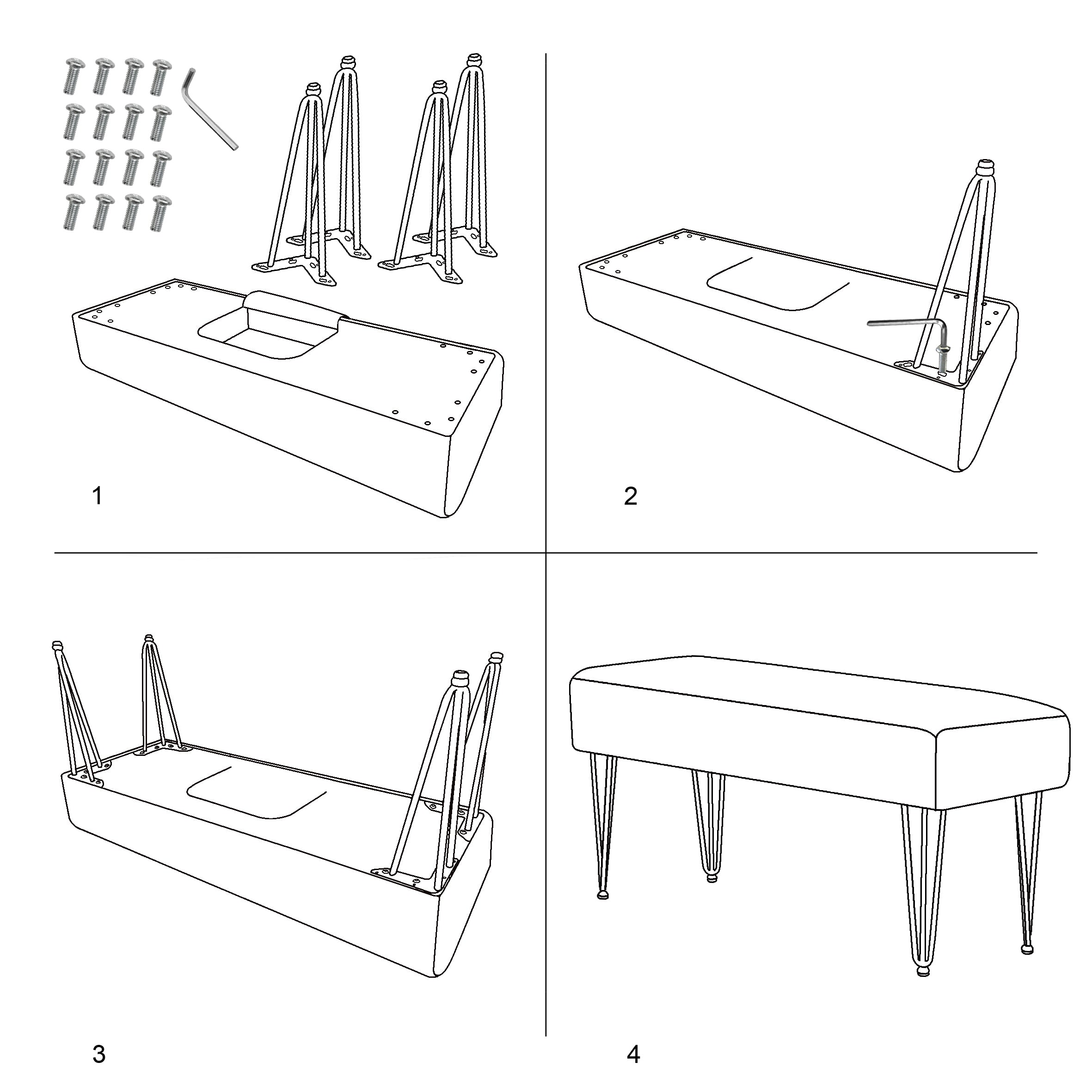 • Easy Assembly: Simply screw the metal hairpin legs into each corner of the ottoman using the provided screws. The hairpin legs and screws are conveniently stored in a hidden zipper compartment under the seat.