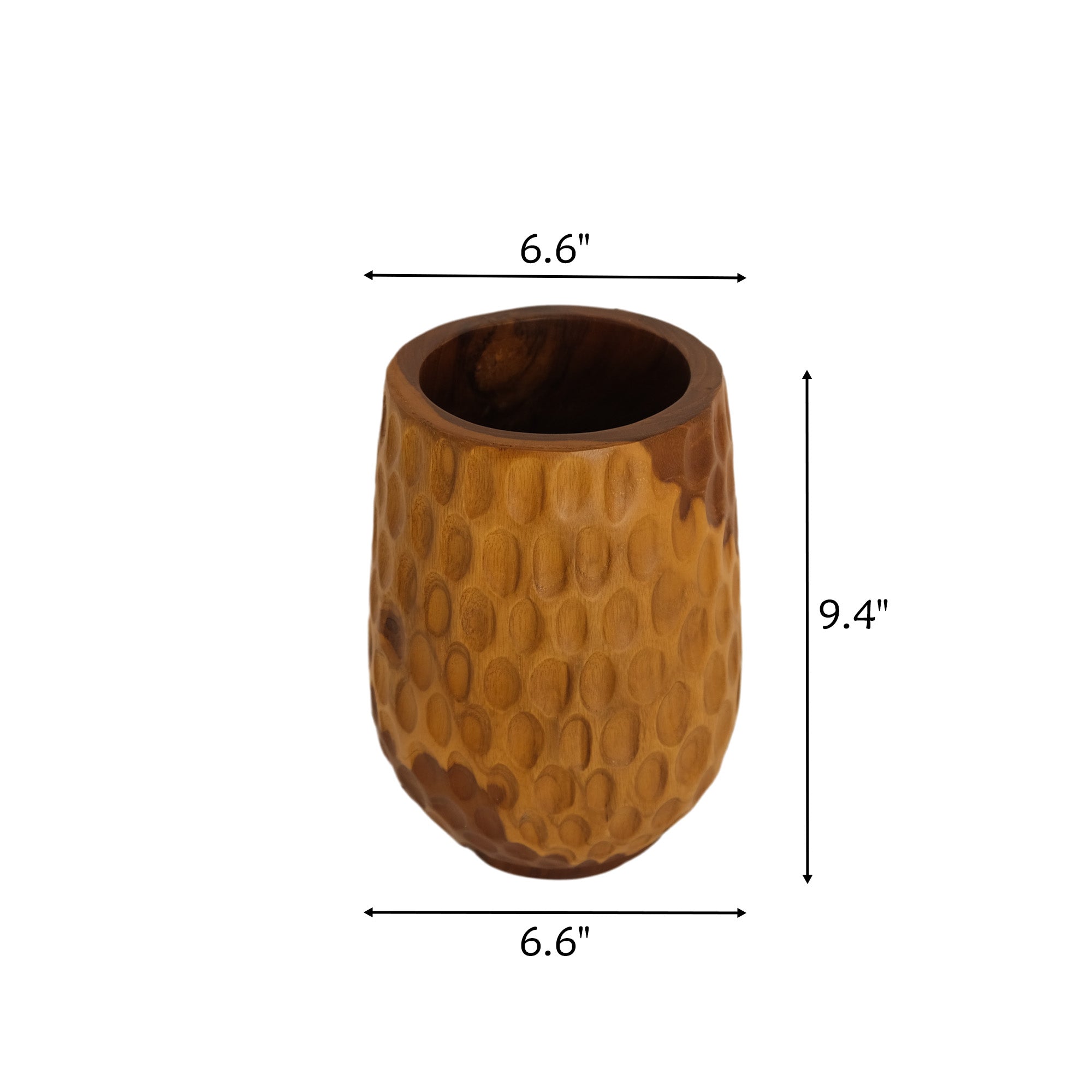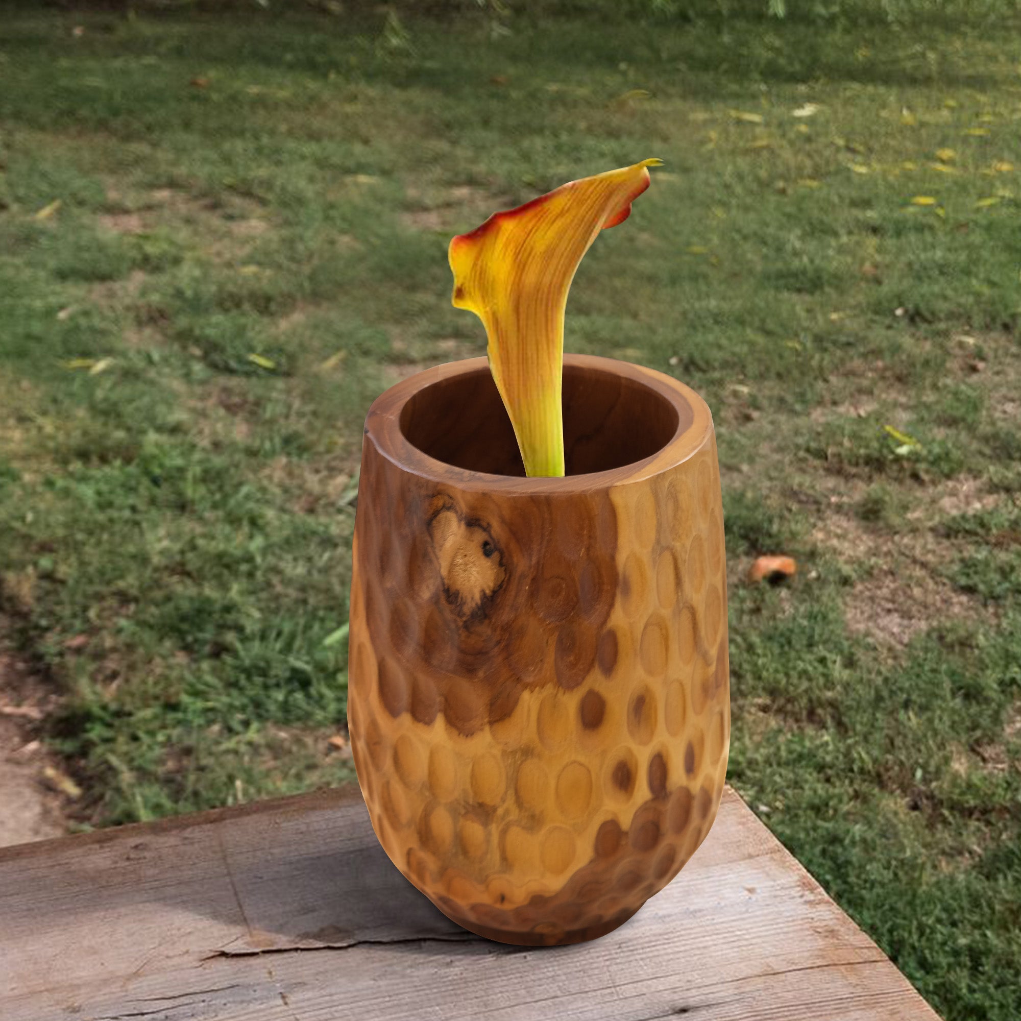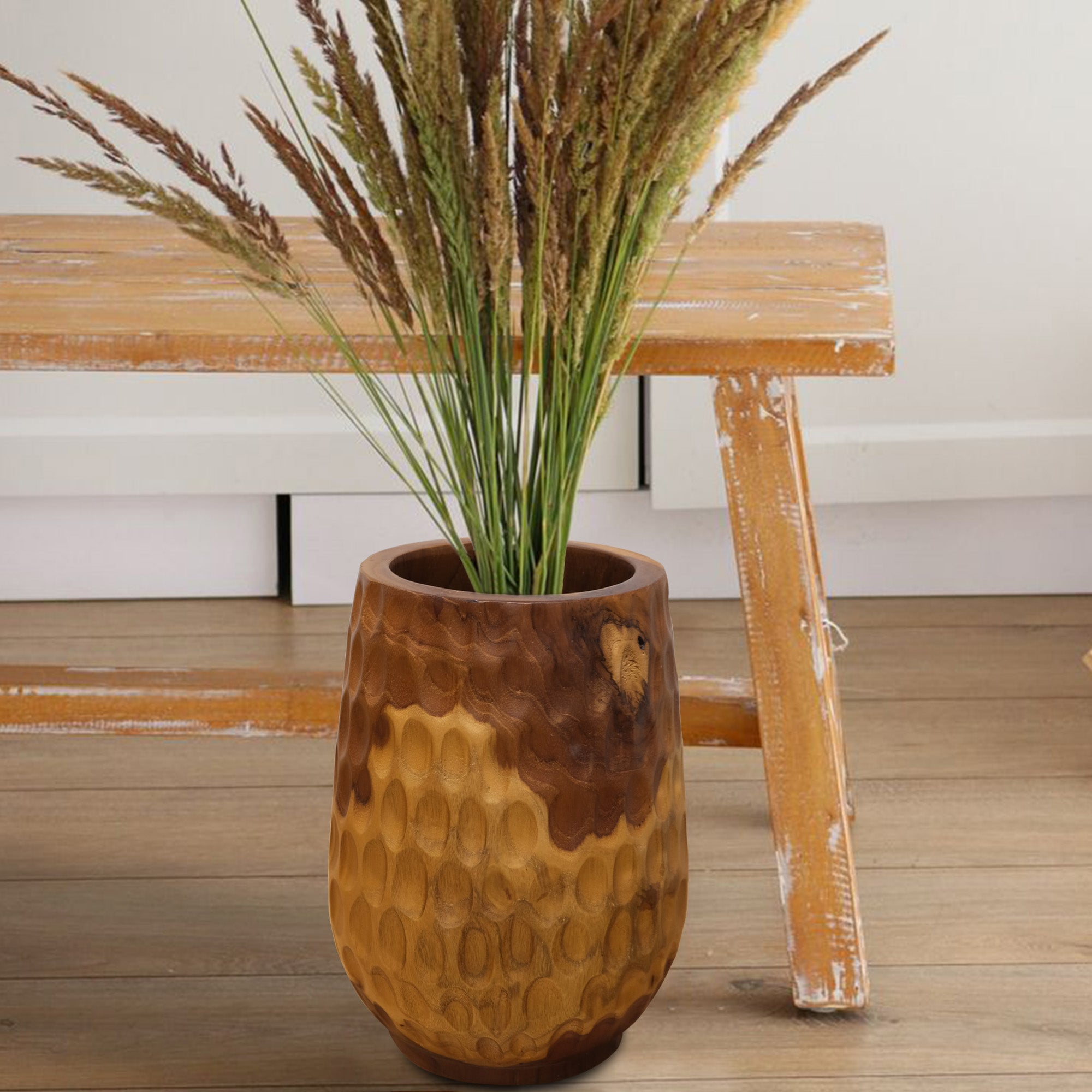 This vase is crafted from teak. It is a practical wood with beautiful grain patterns. It is meticulously handcrafted by skilled artisans.