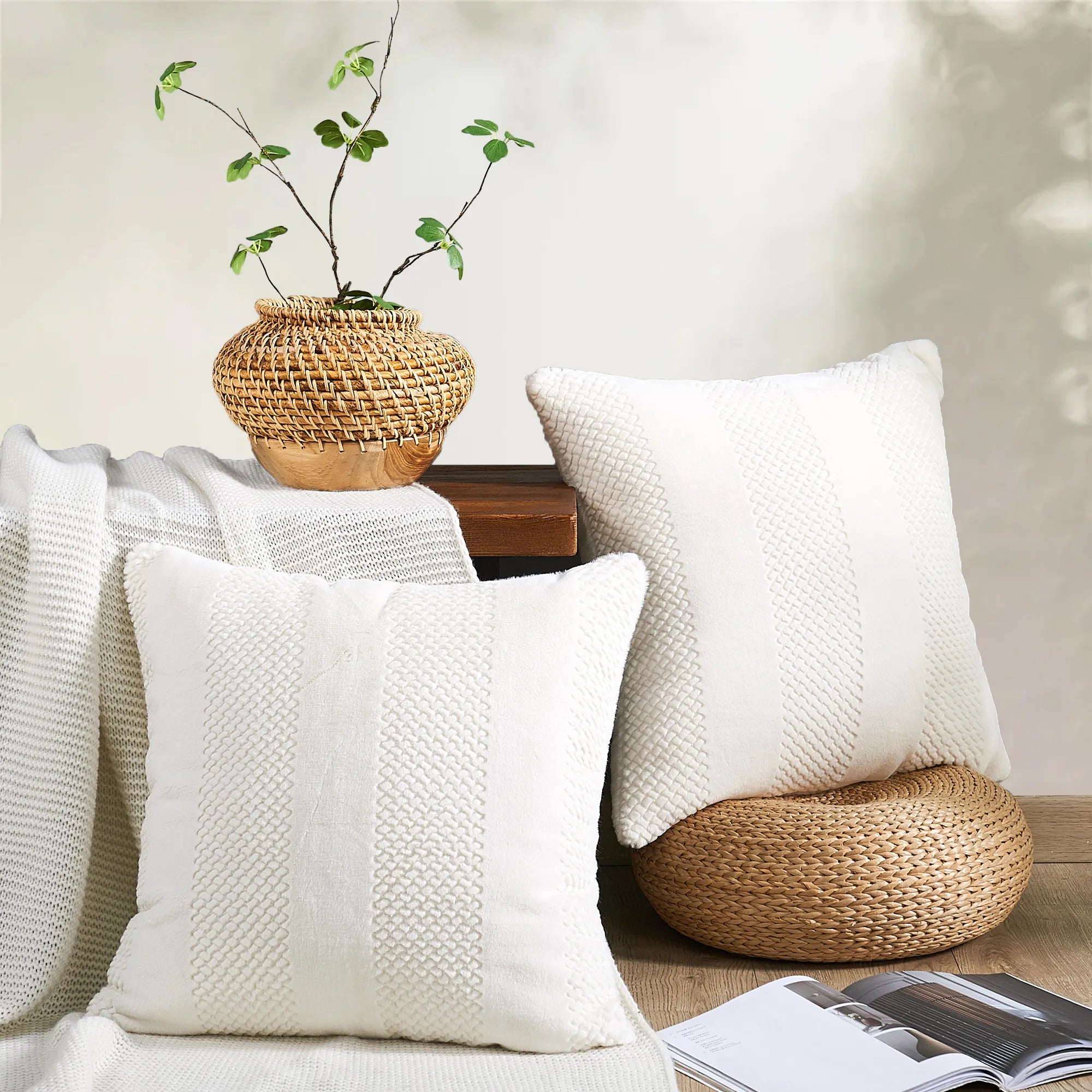 This decorative pillow cover showcases a sophisticated ivory tone with a beautifully textured striped pattern, seamlessly blending elegance with simplicity. The alternating smooth and textured stripes create a timeless design, making it the perfect accent for your bed, sofa, or favorite chair. The back is crafted from soft micromink fabric, providing a contrasting texture and added comfort.