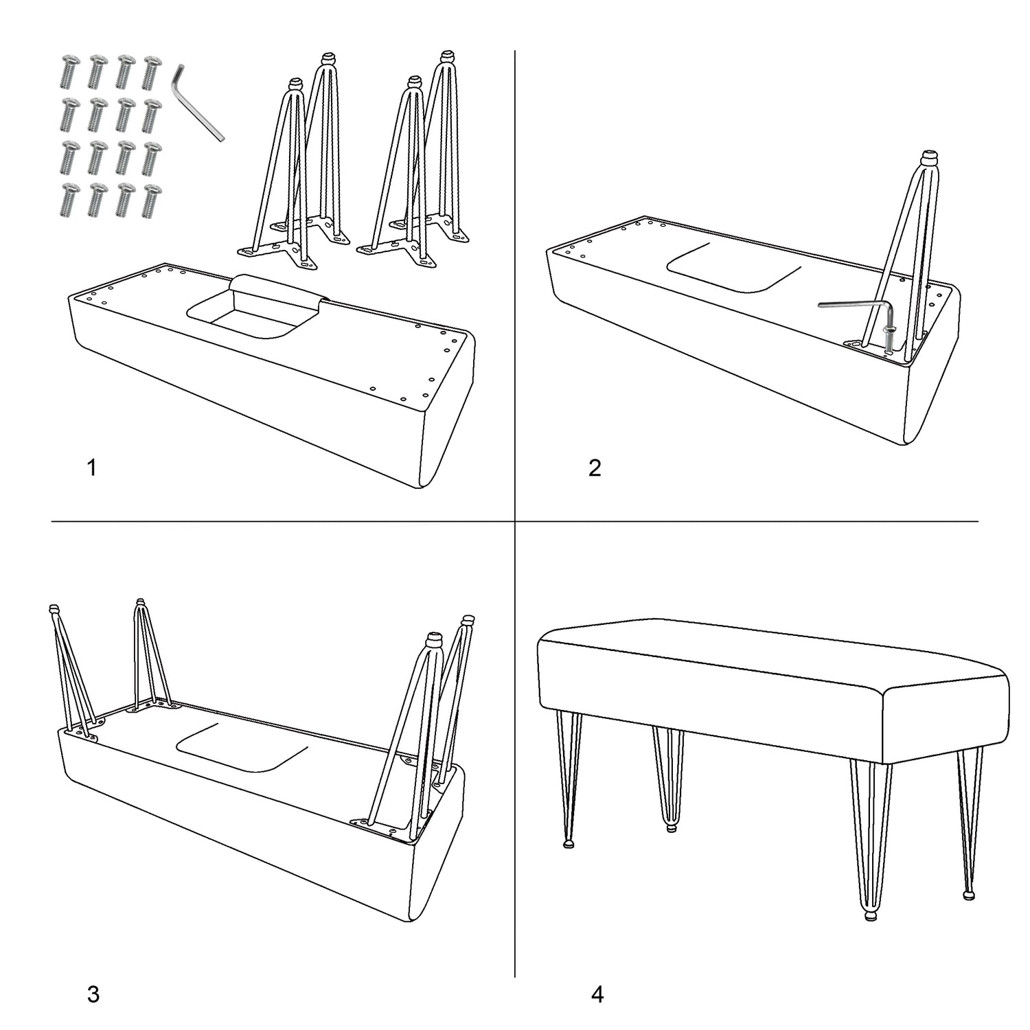 • Easy Assembly: Simply screw the metal hairpin legs into each corner of the ottoman using the provided screws. The hairpin legs and screws are conveniently stored in a hidden zipper compartment under the seat.