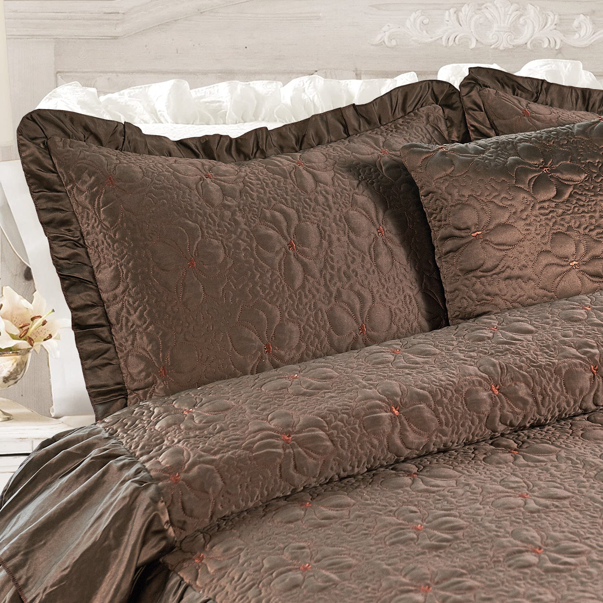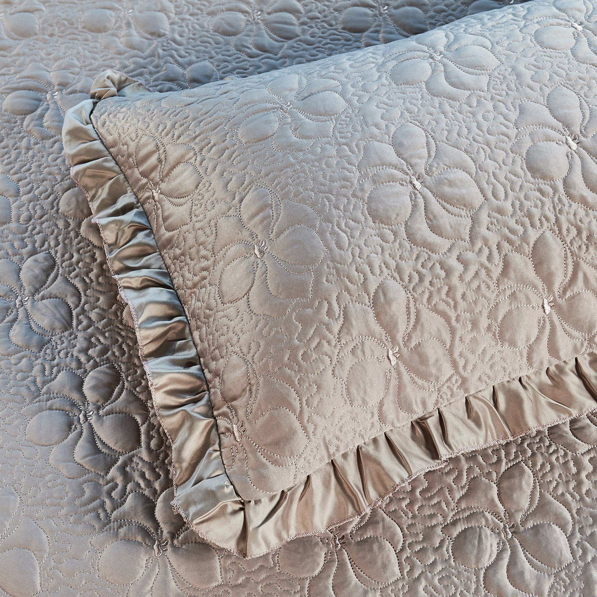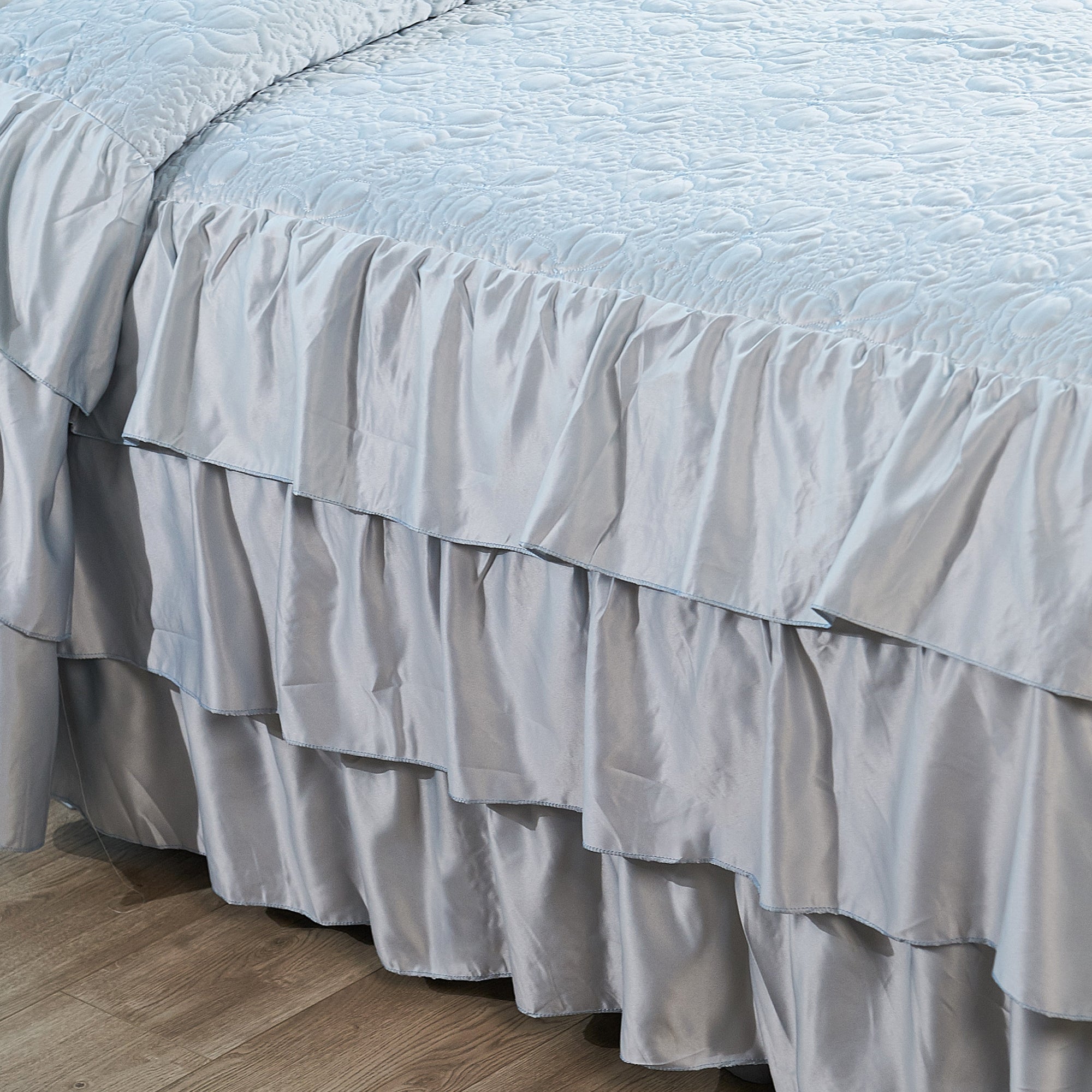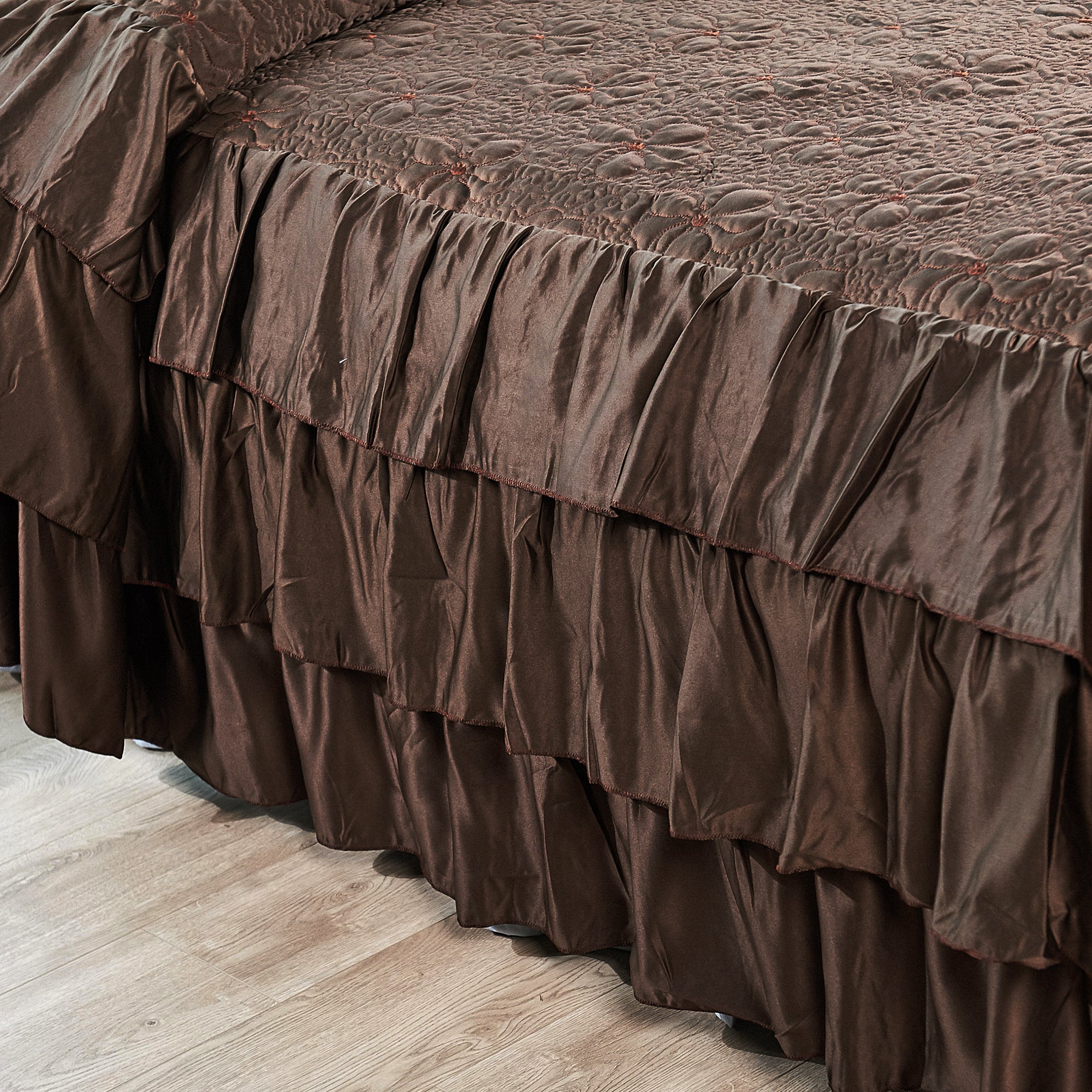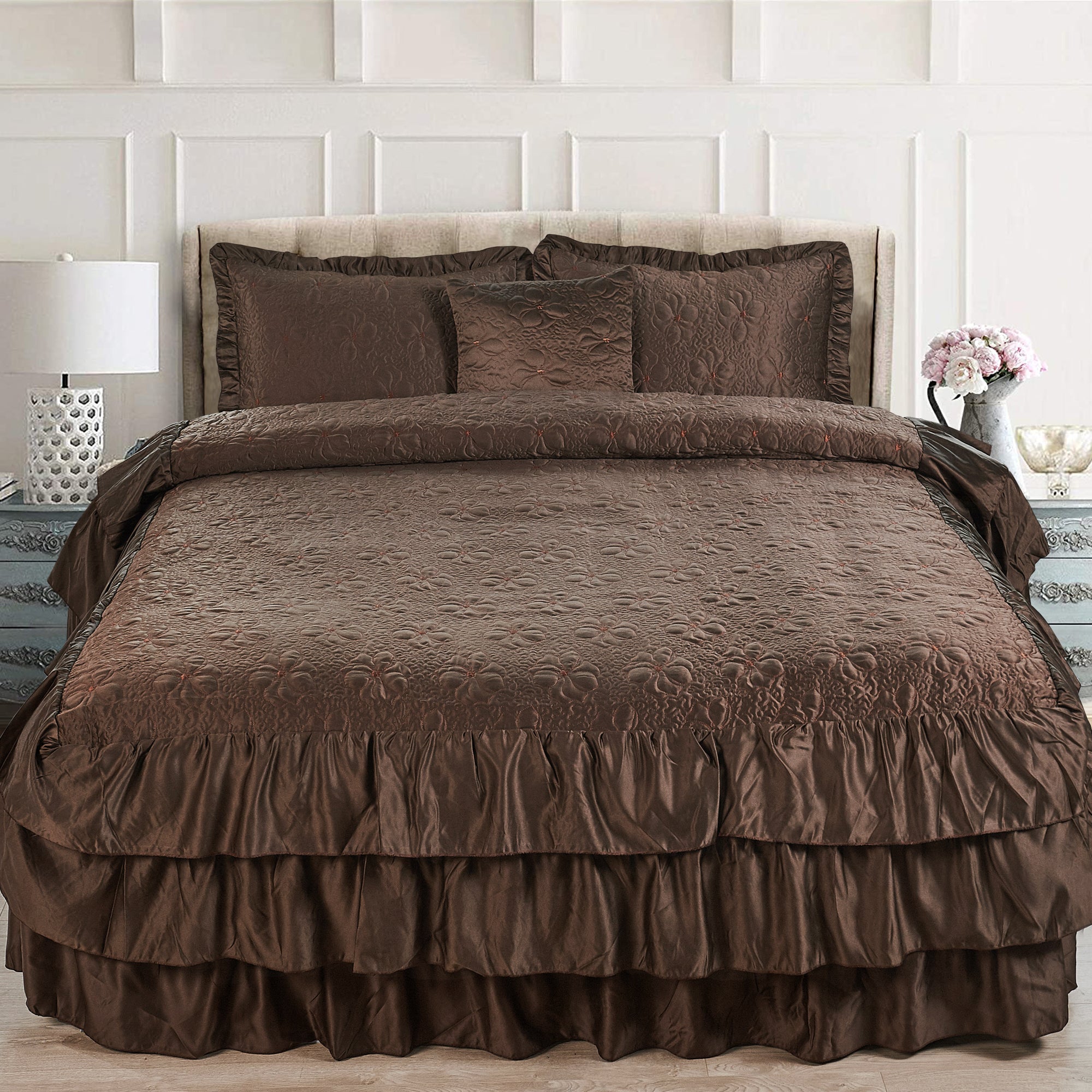 - The Matte Satin Ruffle Set is a beautiful embroidered quilted set. The coverlet, two Shams, and the Accent Pillow all have the same solid base with an accented flower quilted pattern. Each bedspread has 24 Inches of ruffles that run from the end of the mattress top to the floor. PLEASE CHECK DIMENSIONS FOR SPECIFIC SIZE. Queen Coverlet - 60 x 80 + 24 Inches. (2) Shams - 26 x 26 + 2 Inches. Accent Pillow. 16 x 16 Inches.