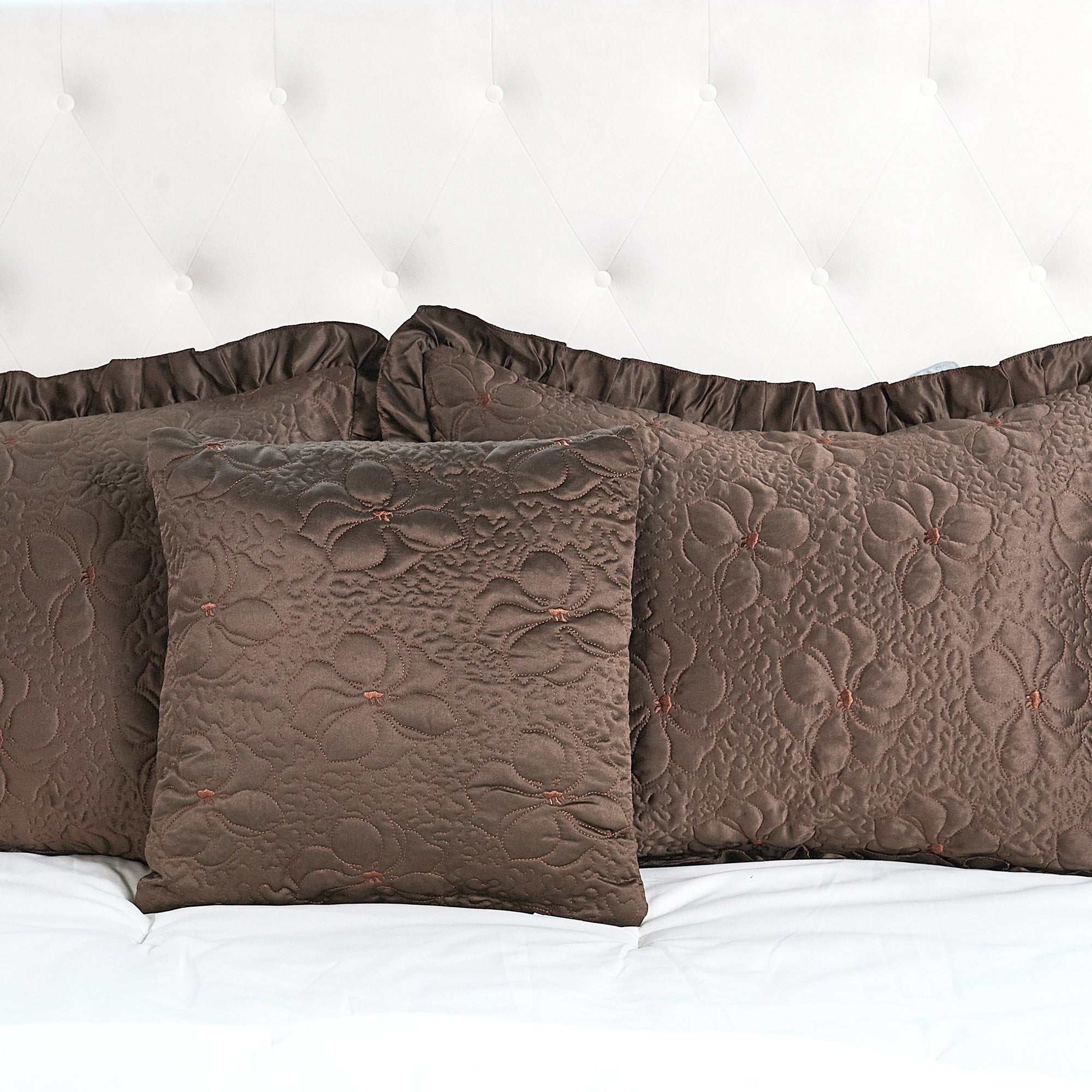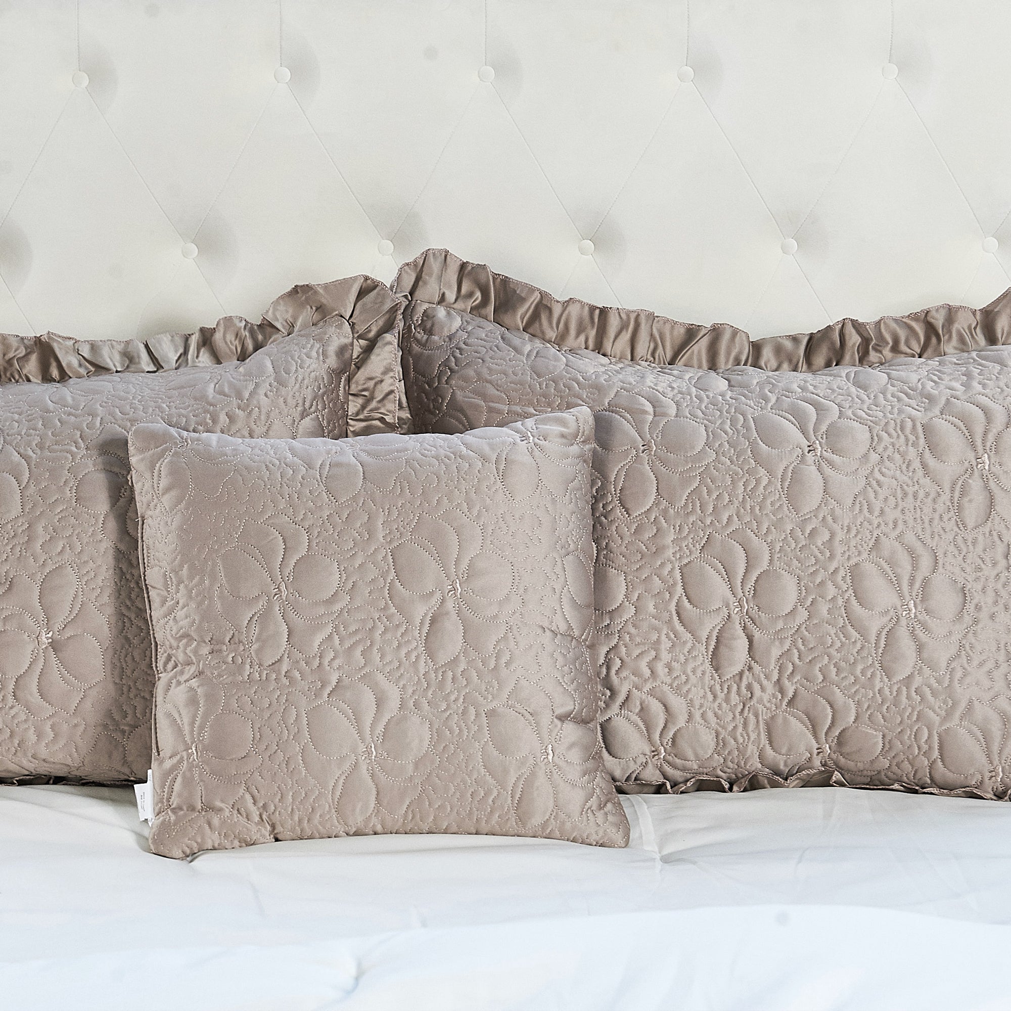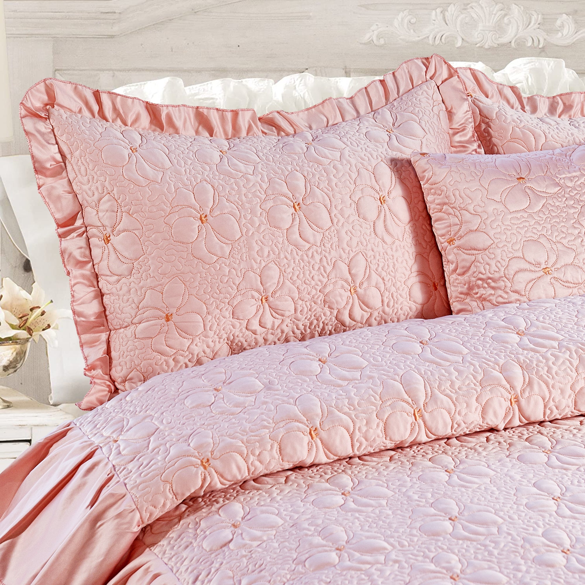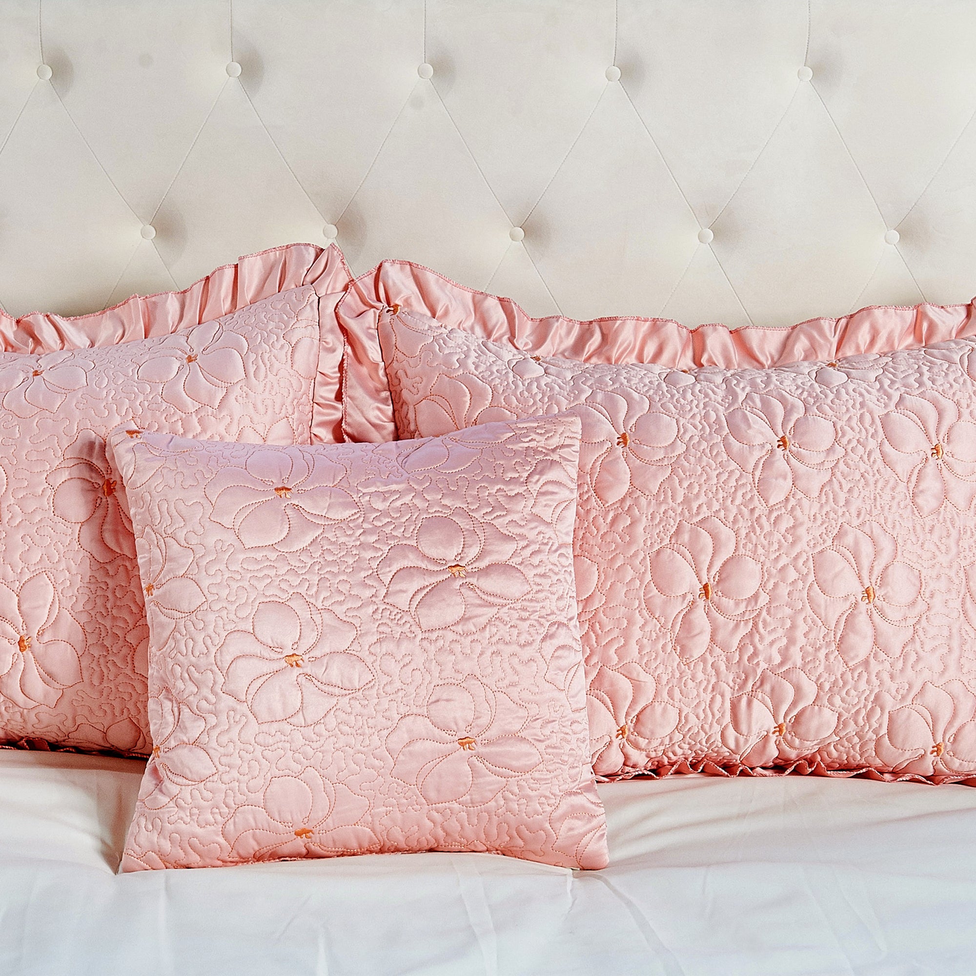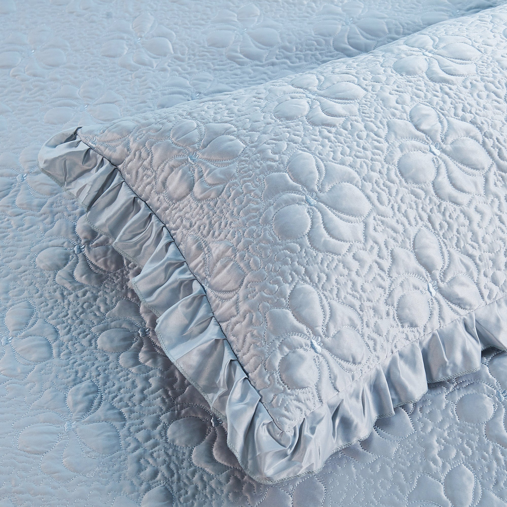 - The Matte Satin Ruffle Set is a beautiful embroidered quilted set. The coverlet, two Shams, and the Accent Pillow all have the same solid base with an accented flower quilted pattern. Each bedspread has 24 Inches of ruffles that run from the end of the mattress top to the floor. PLEASE CHECK DIMENSIONS FOR SPECIFIC SIZE. Queen Coverlet - 60 x 80 + 24 Inches. (2) Shams - 26 x 26 + 2 Inches. Accent Pillow. 16 x 16 Inches.