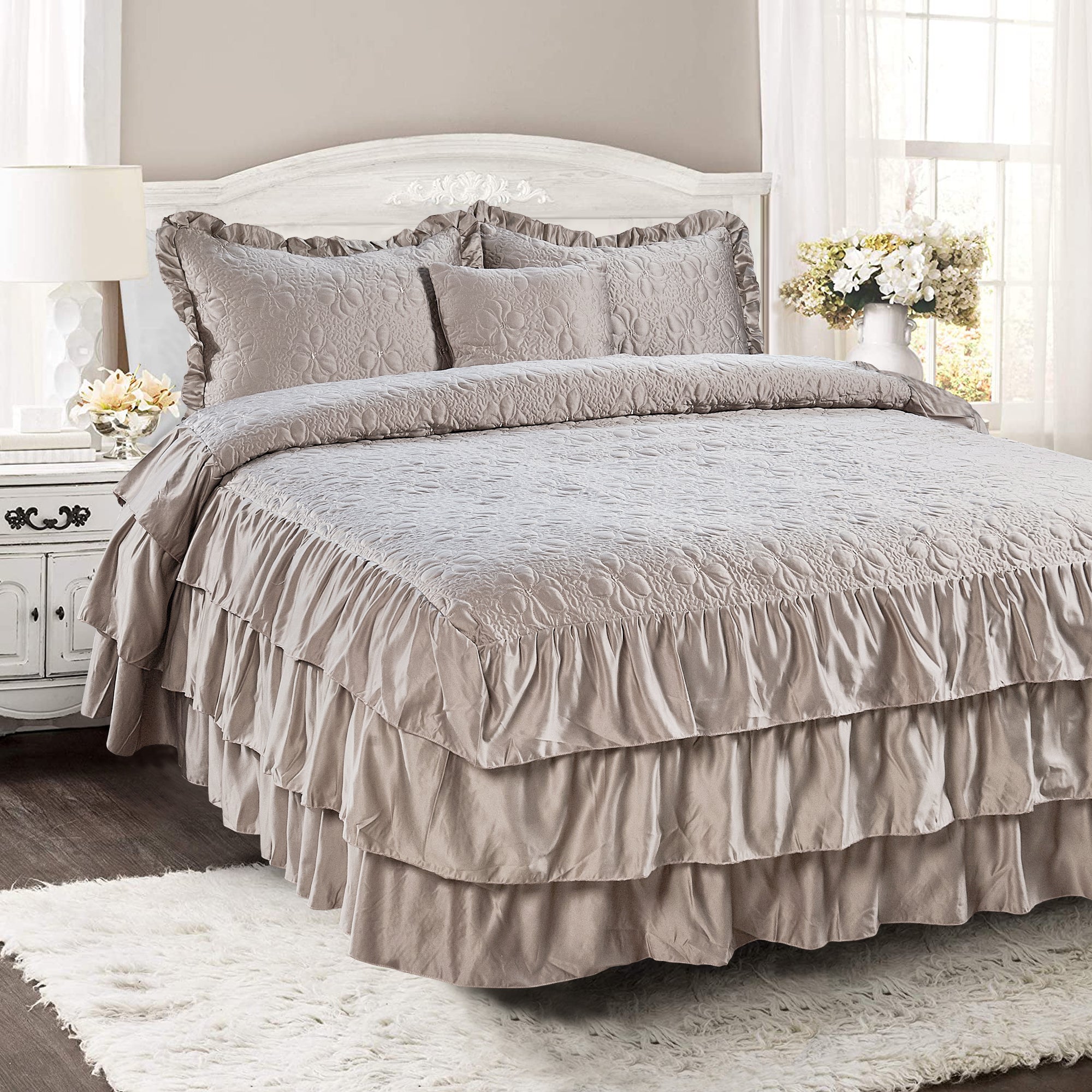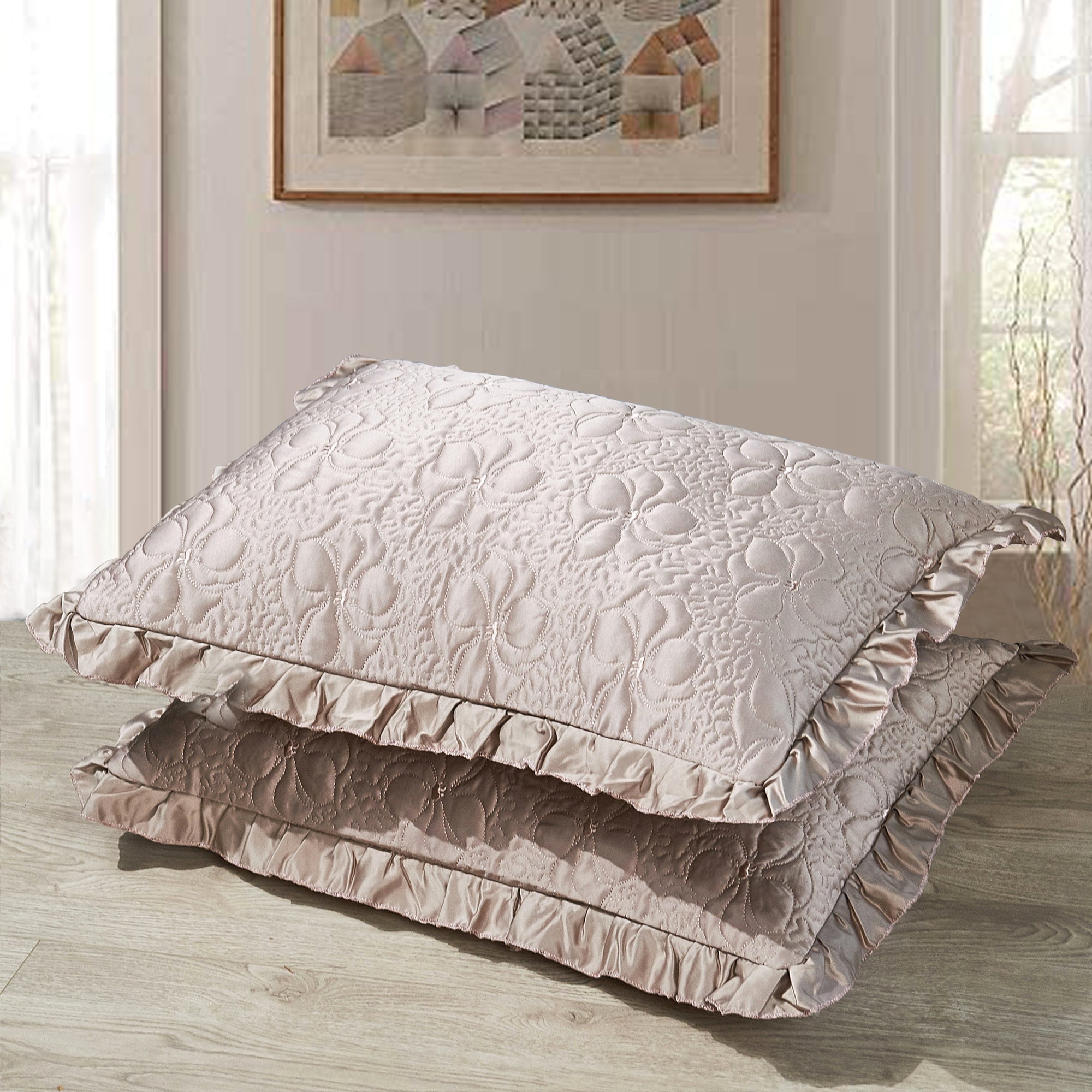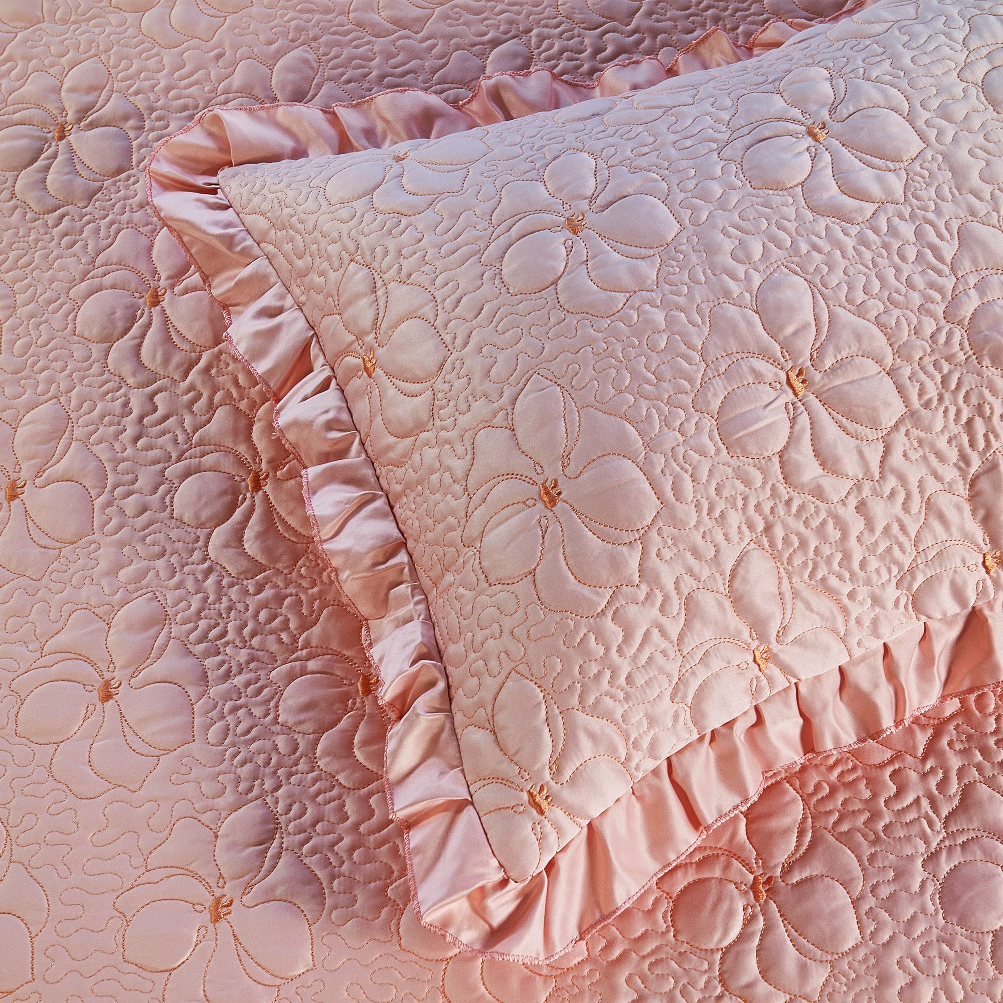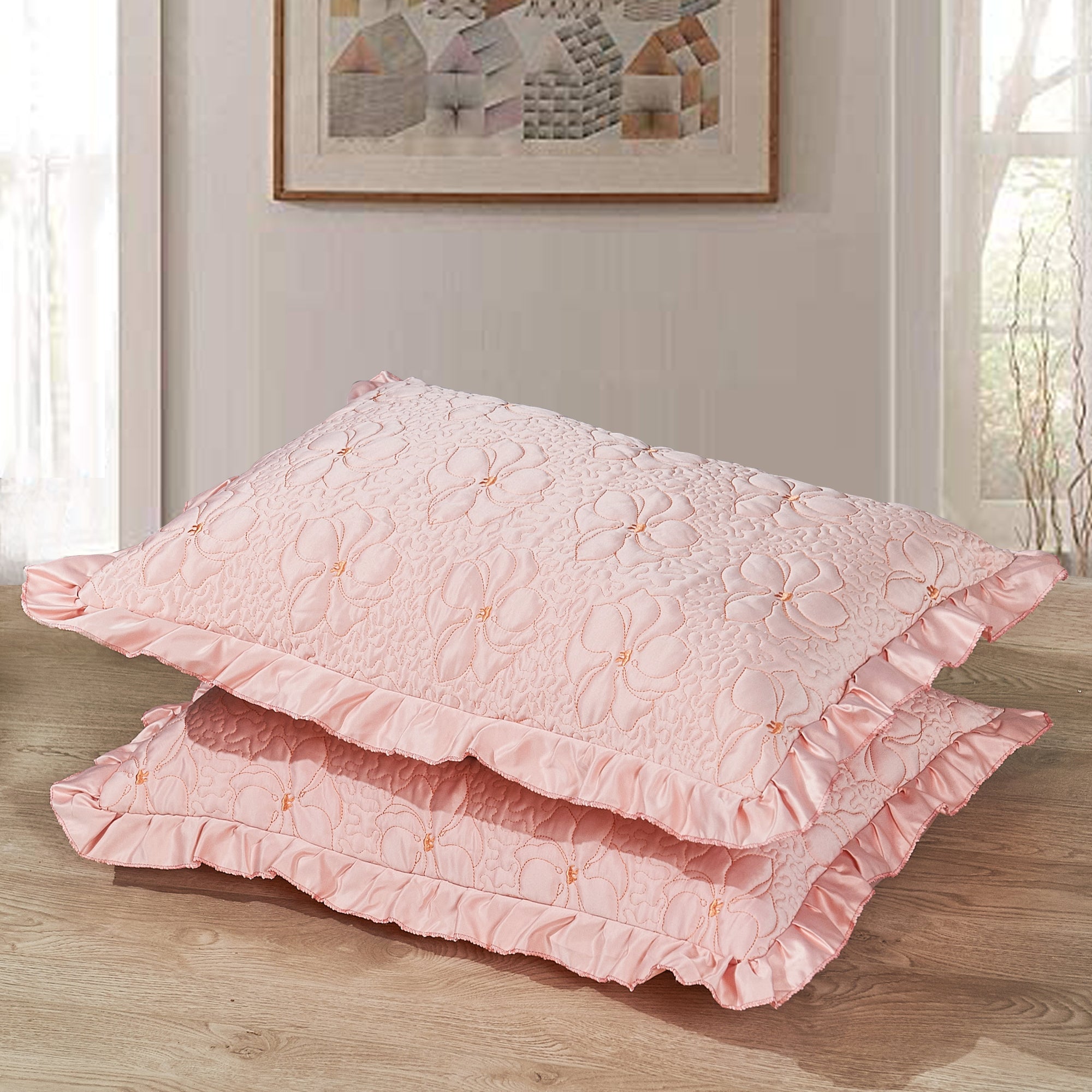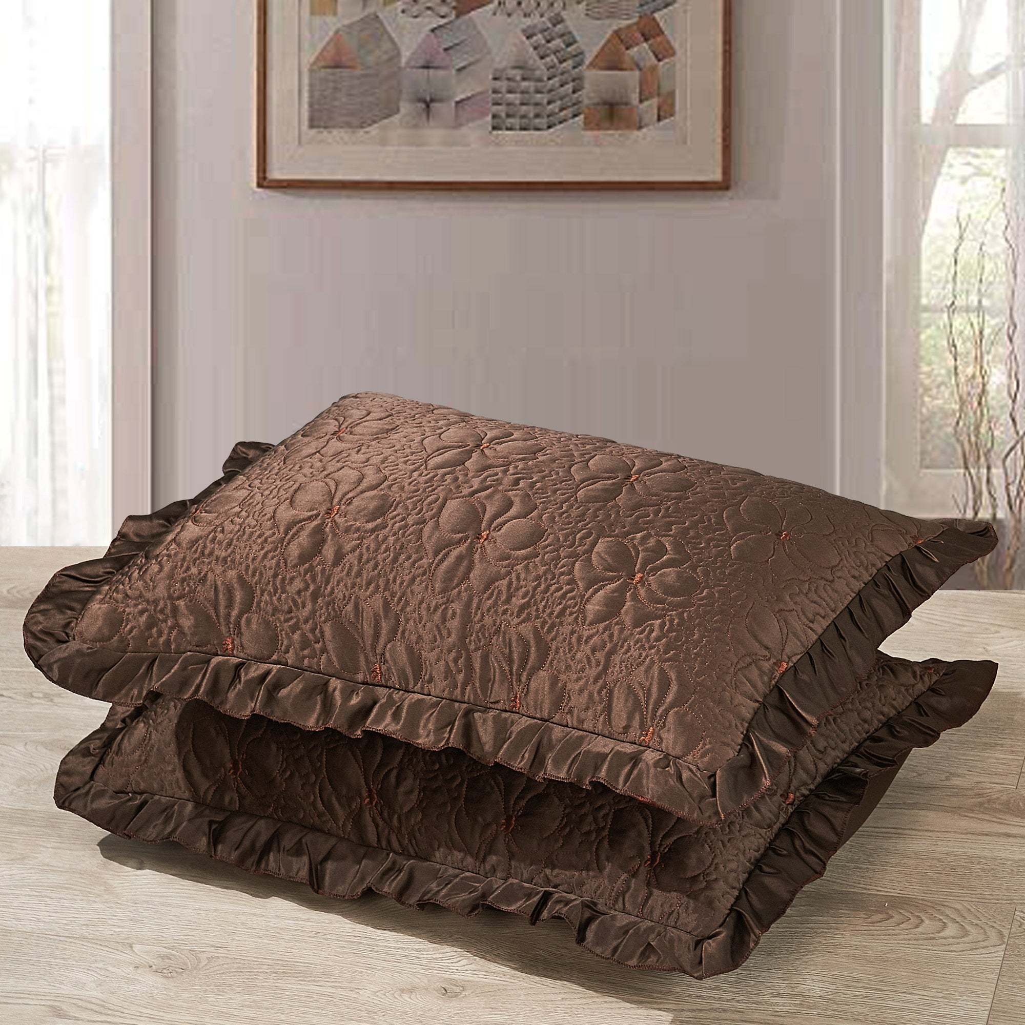- The Matte Satin Ruffle Set is a beautiful embroidered quilted set. The coverlet, two Shams, and the Accent Pillow all have the same solid base with an accented flower quilted pattern. Each bedspread has 24 Inches of ruffles that run from the end of the mattress top to the floor. PLEASE CHECK DIMENSIONS FOR SPECIFIC SIZE. Queen Coverlet - 60 x 80 + 24 Inches. (2) Shams - 26 x 26 + 2 Inches. Accent Pillow. 16 x 16 Inches.