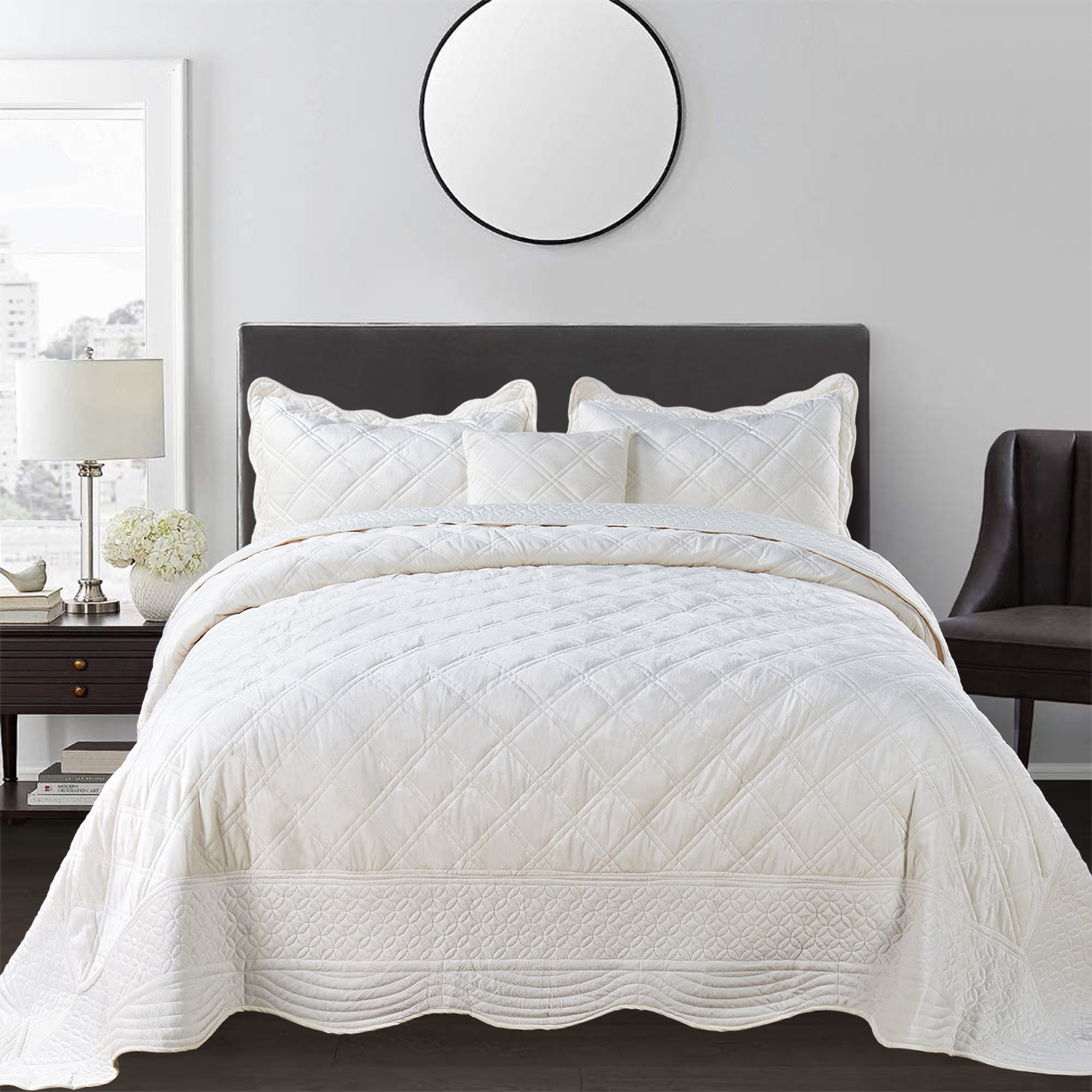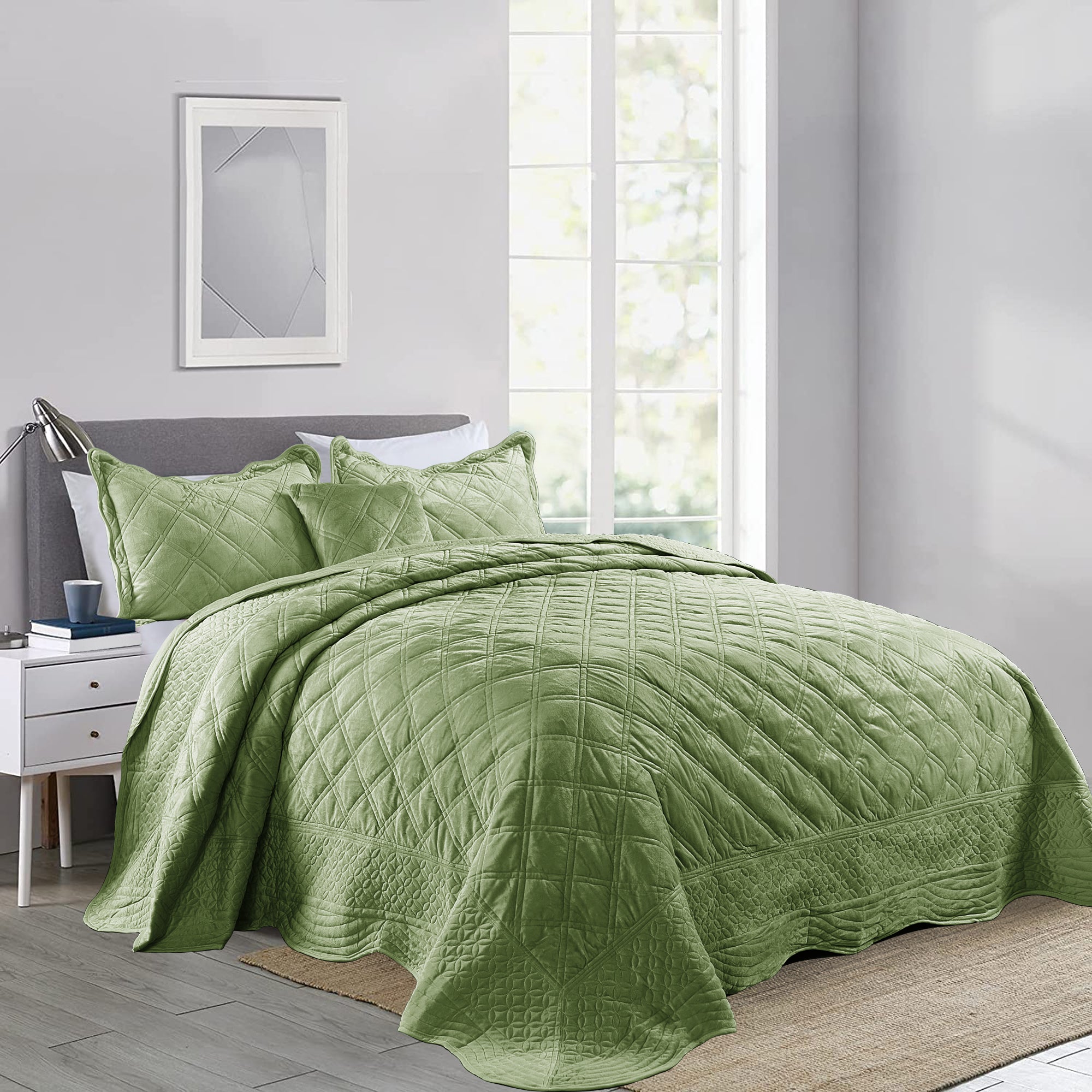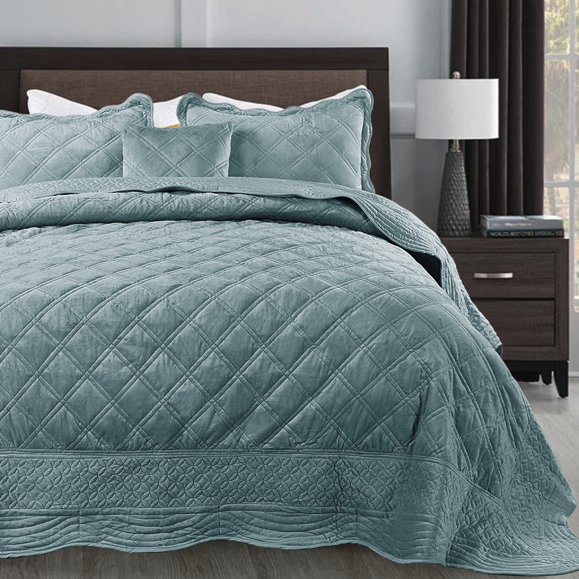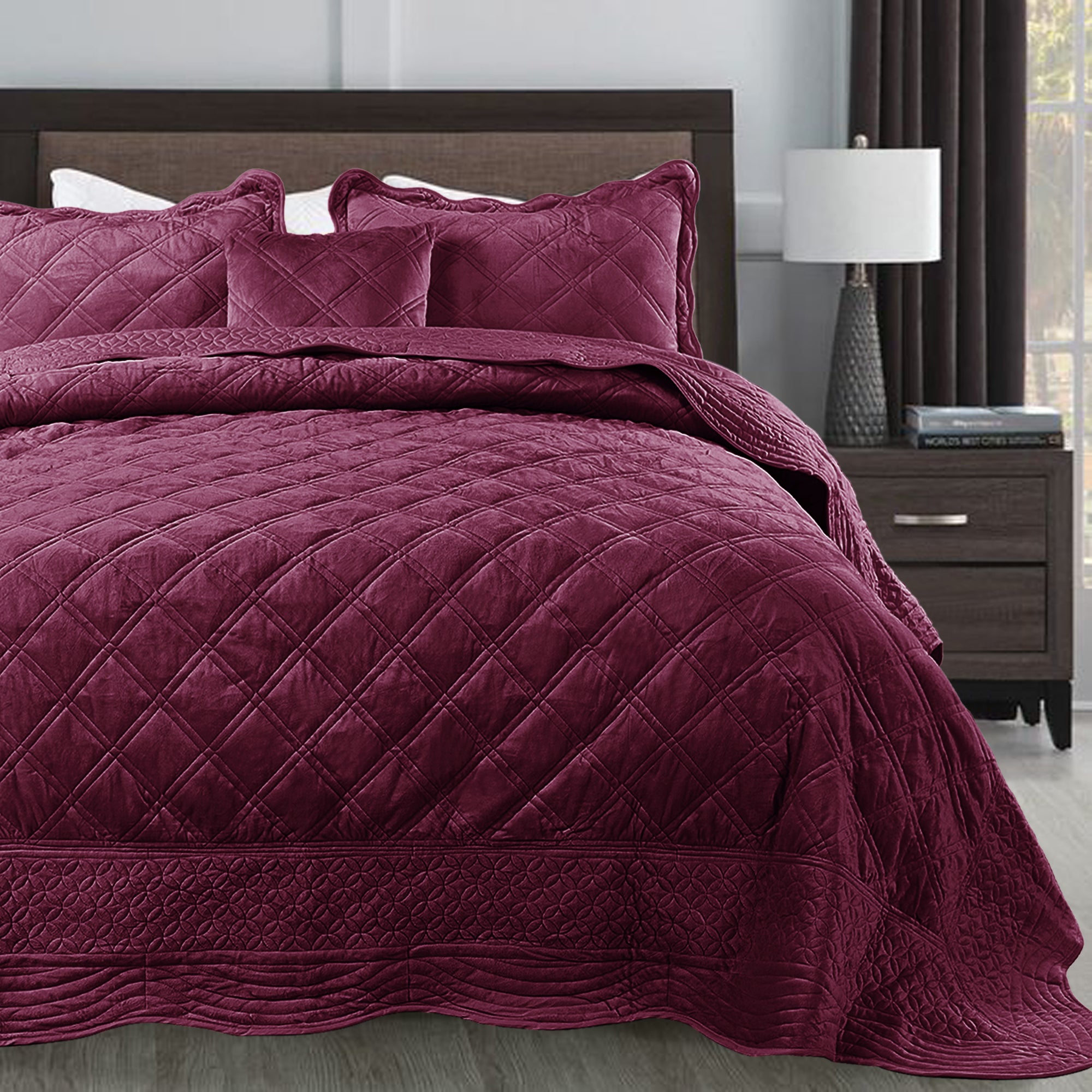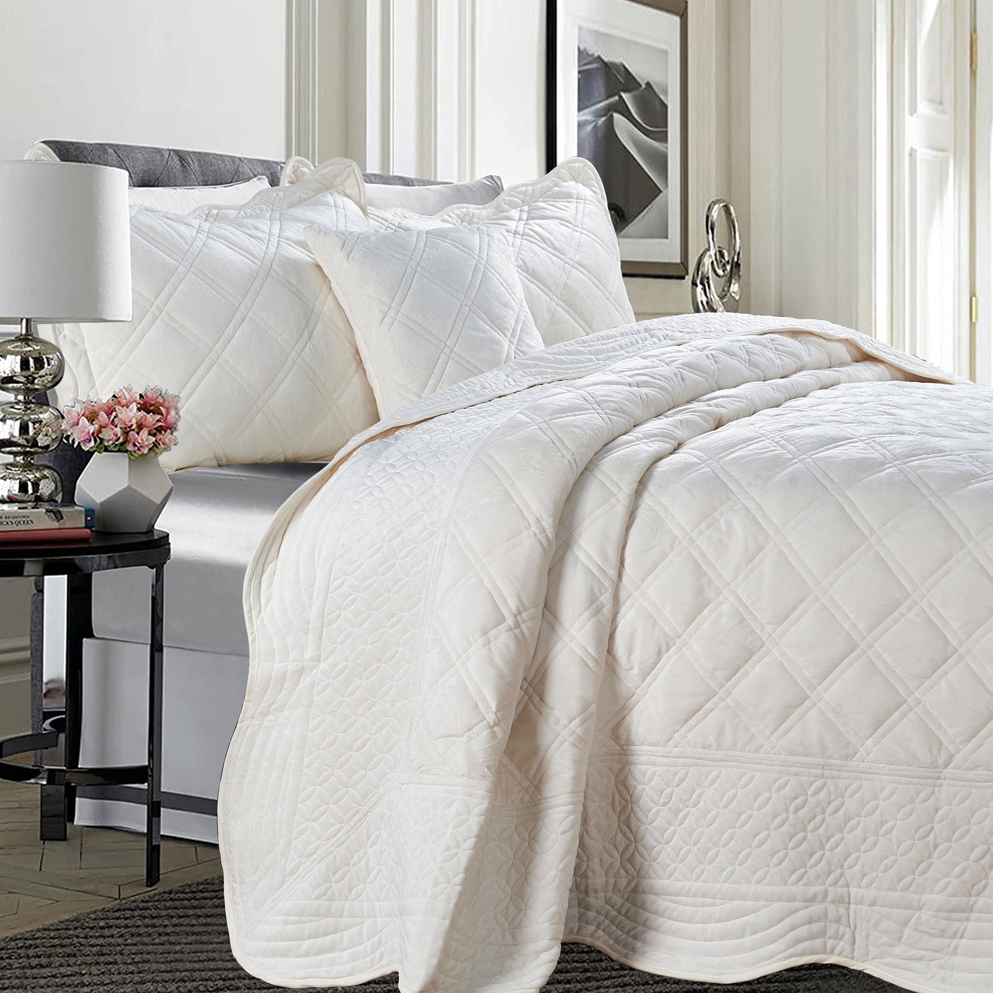 - ELEGANT DIAMOND DESIGN - Beautifully and artfully crafted quilt set features diamond pattern on both sides. Their solid-hued design sets an understated foundation in your bedroom, while scalloped accenting and embroidered details offer a boost of style.