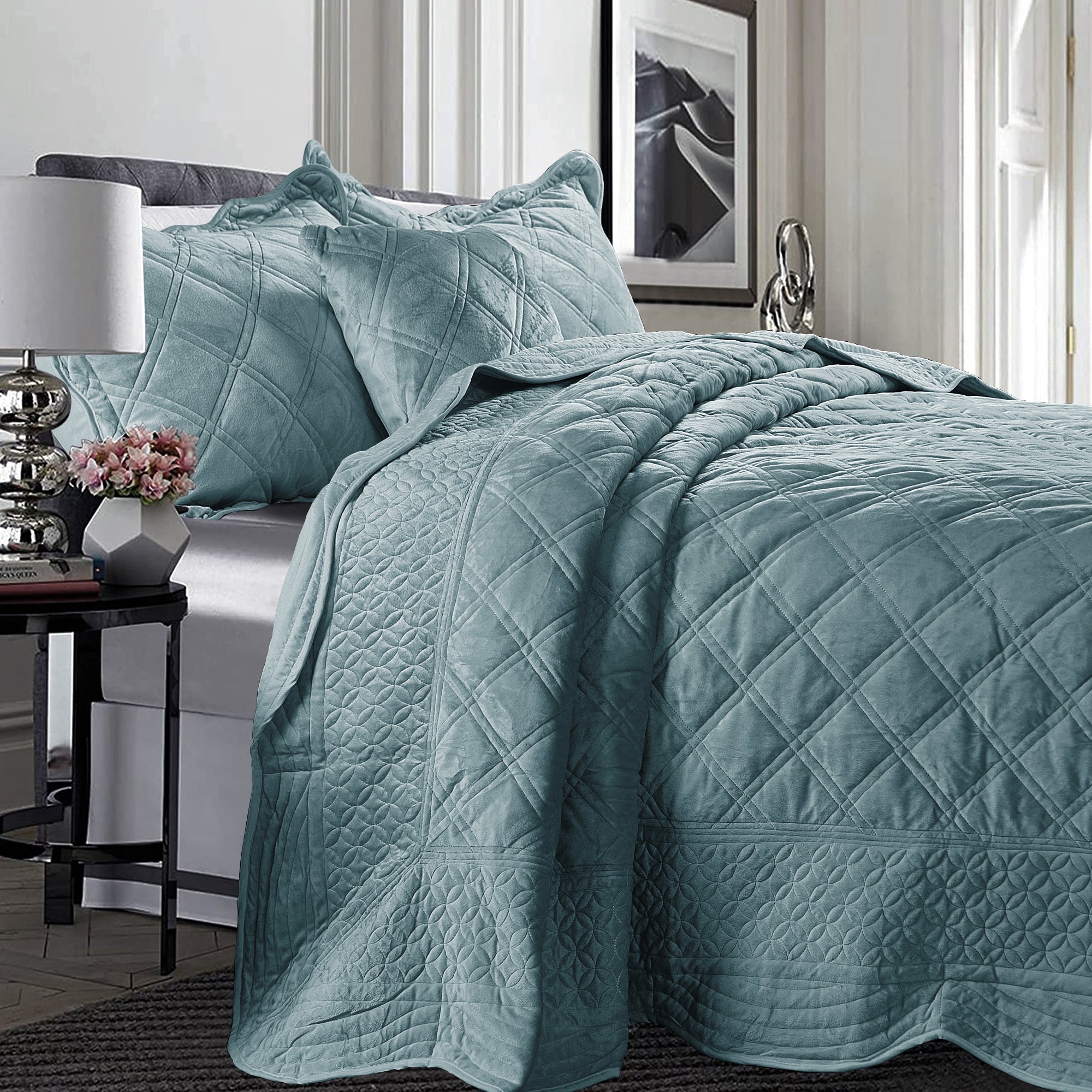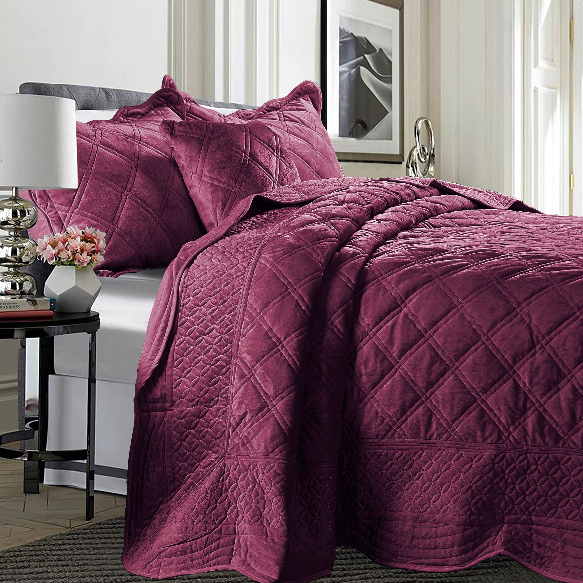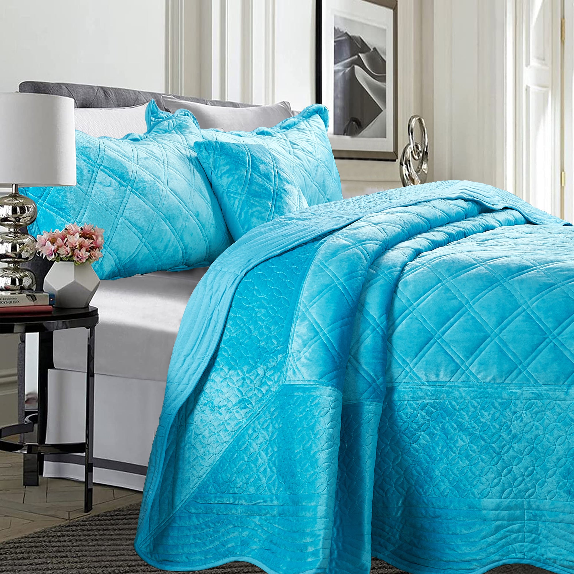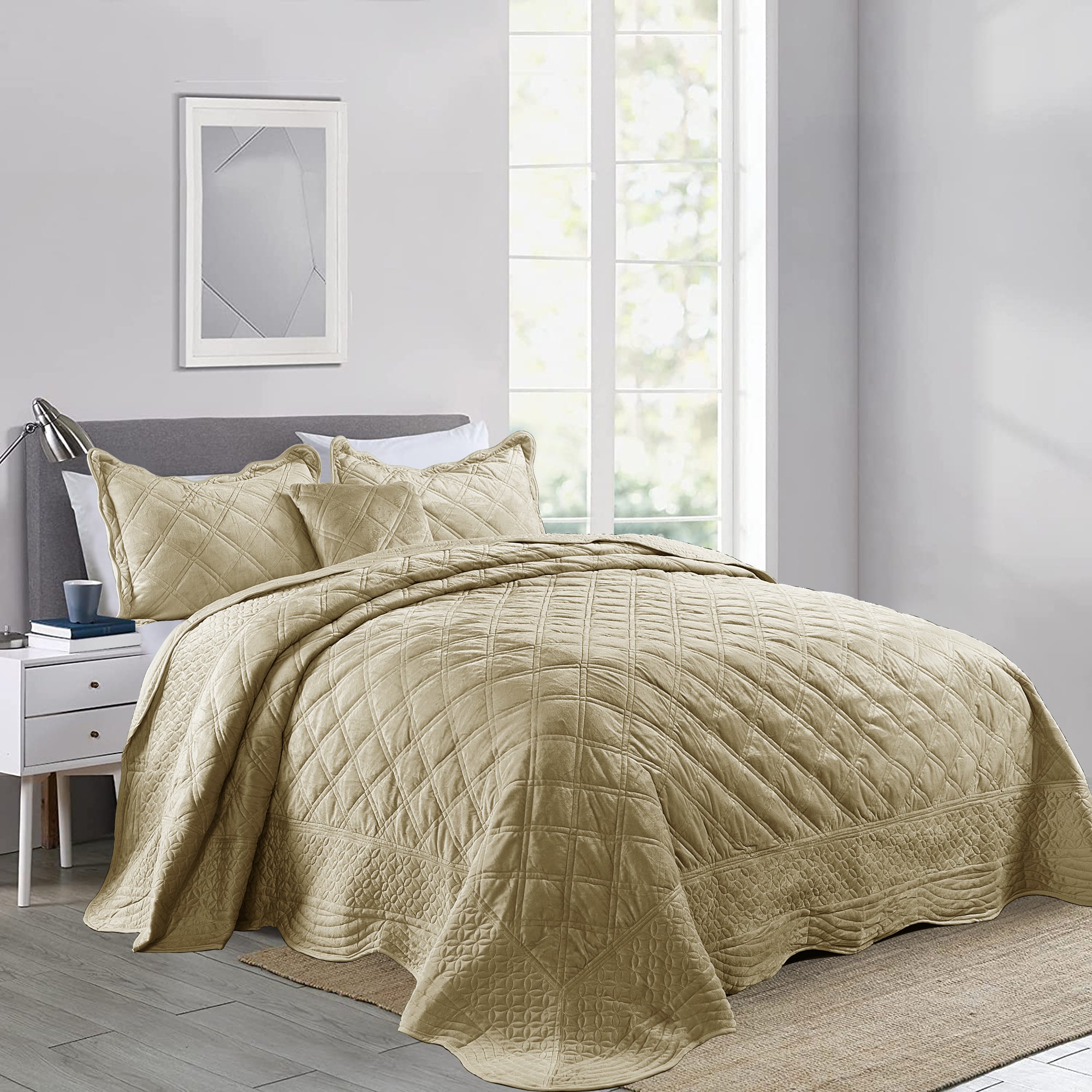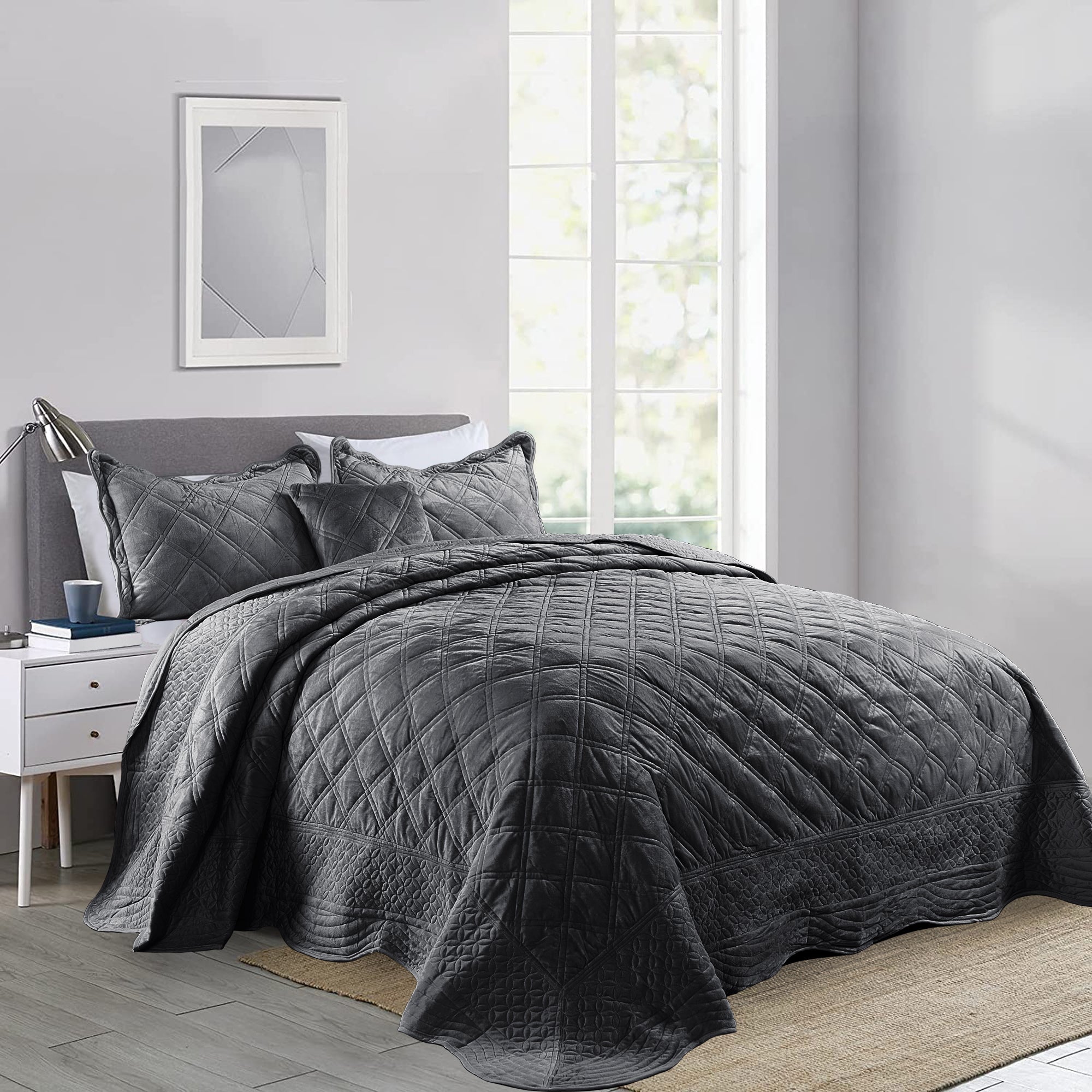 - ELEGANT DIAMOND DESIGN - Beautifully and artfully crafted quilt set features diamond pattern on both sides. Their solid-hued design sets an understated foundation in your bedroom, while scalloped accenting and embroidered details offer a boost of style.
