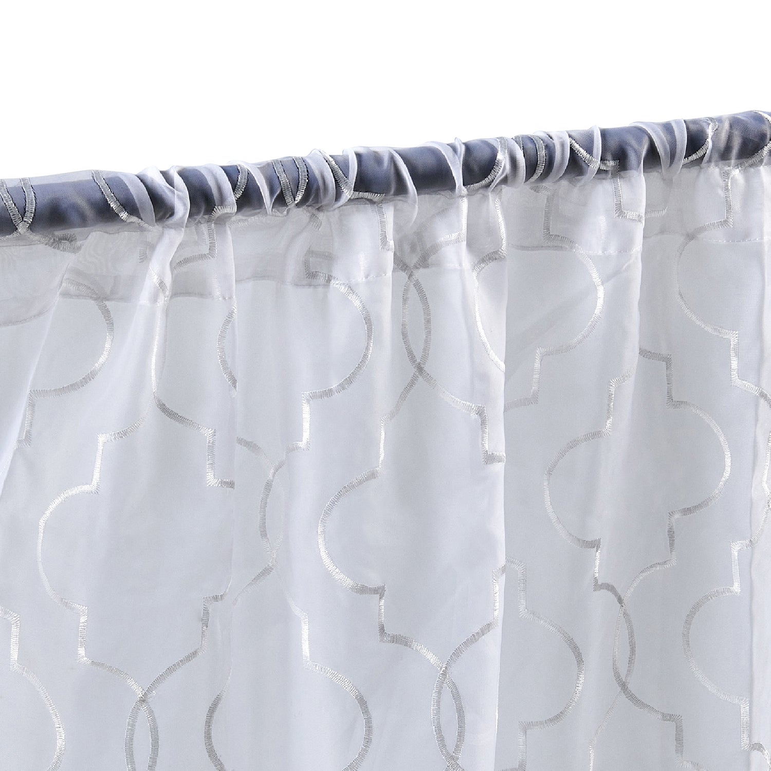 - BRING BEAUTY TO YOUR HOME! Attractive window curtain tier features white embroidered Ogee pattern atop white sheer curtains. Sheer curtains allow light to filter through while still providing the privacy you covet. Sheer curtains also offer natural lighting without the harshness of the sun’s rays. Great for kitchens, laundry rooms and guest bathrooms. Add your own personal style to any room with the Ogee Pattern Tier Curtain set.