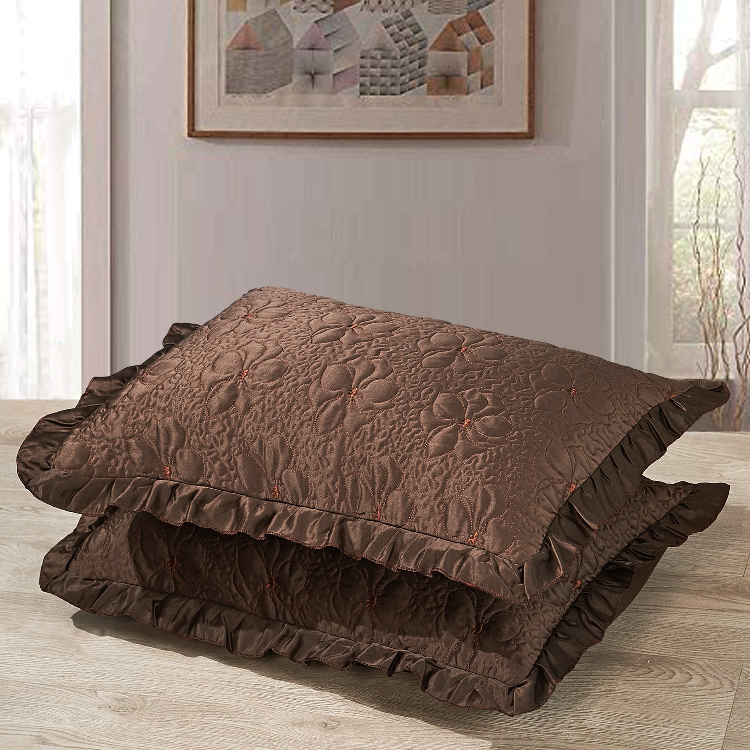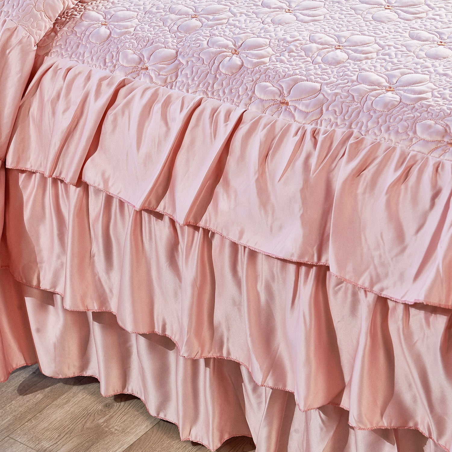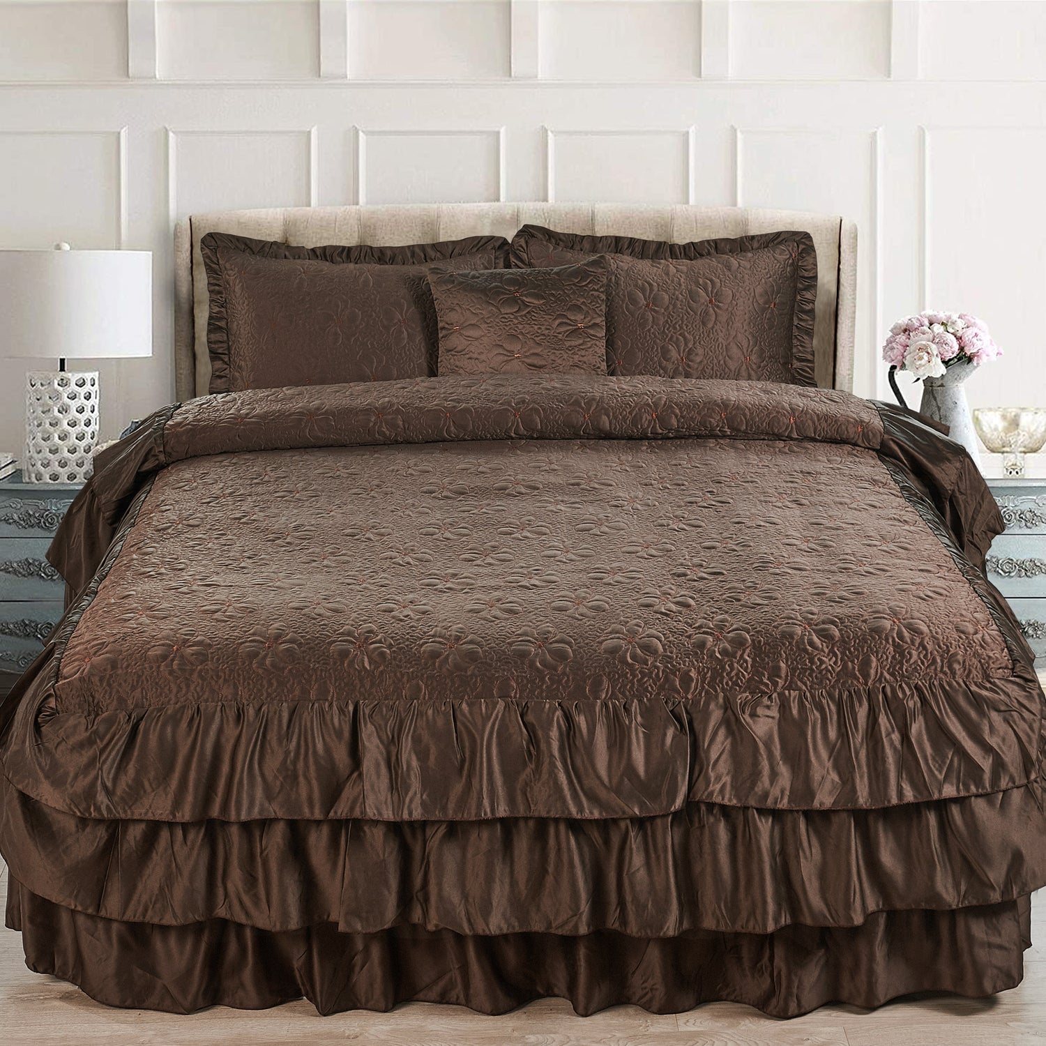 • The Matte Satin Ruffle Set is a beautiful embroidered quilted set. The coverlet, two Shams, and the Accent Pillow all have the same solid base with an accented flower quilted pattern. Each bedspread has 24 Inches of ruffles that run from the end of the mattress top to the floor. PLEASE CHECK DIMENSIONS FOR SPECIFIC SIZE. Queen Coverlet - 60 x 80 + 24 Inches. (2) Shams - 26 x 26 + 2 Inches. Accent Pillow. 16 x 16 Inches.