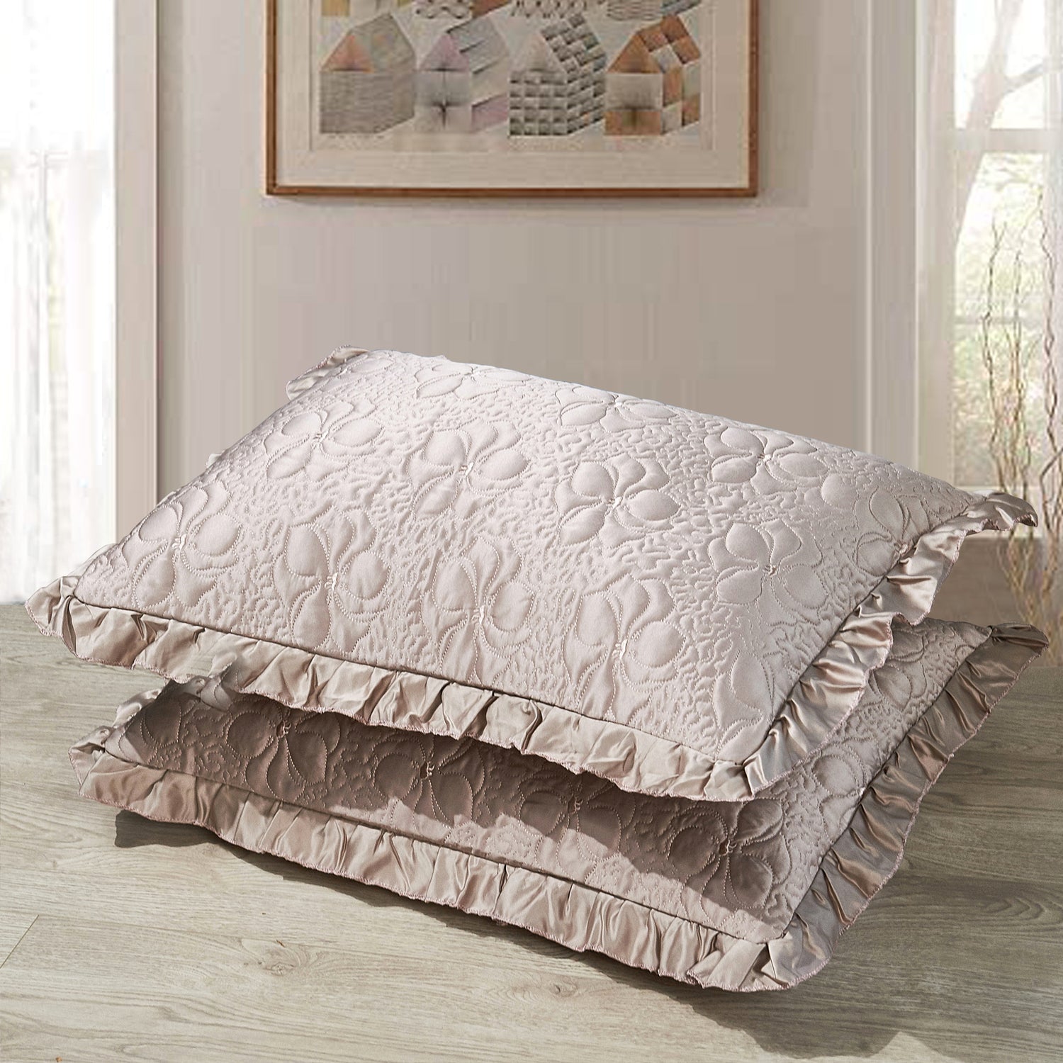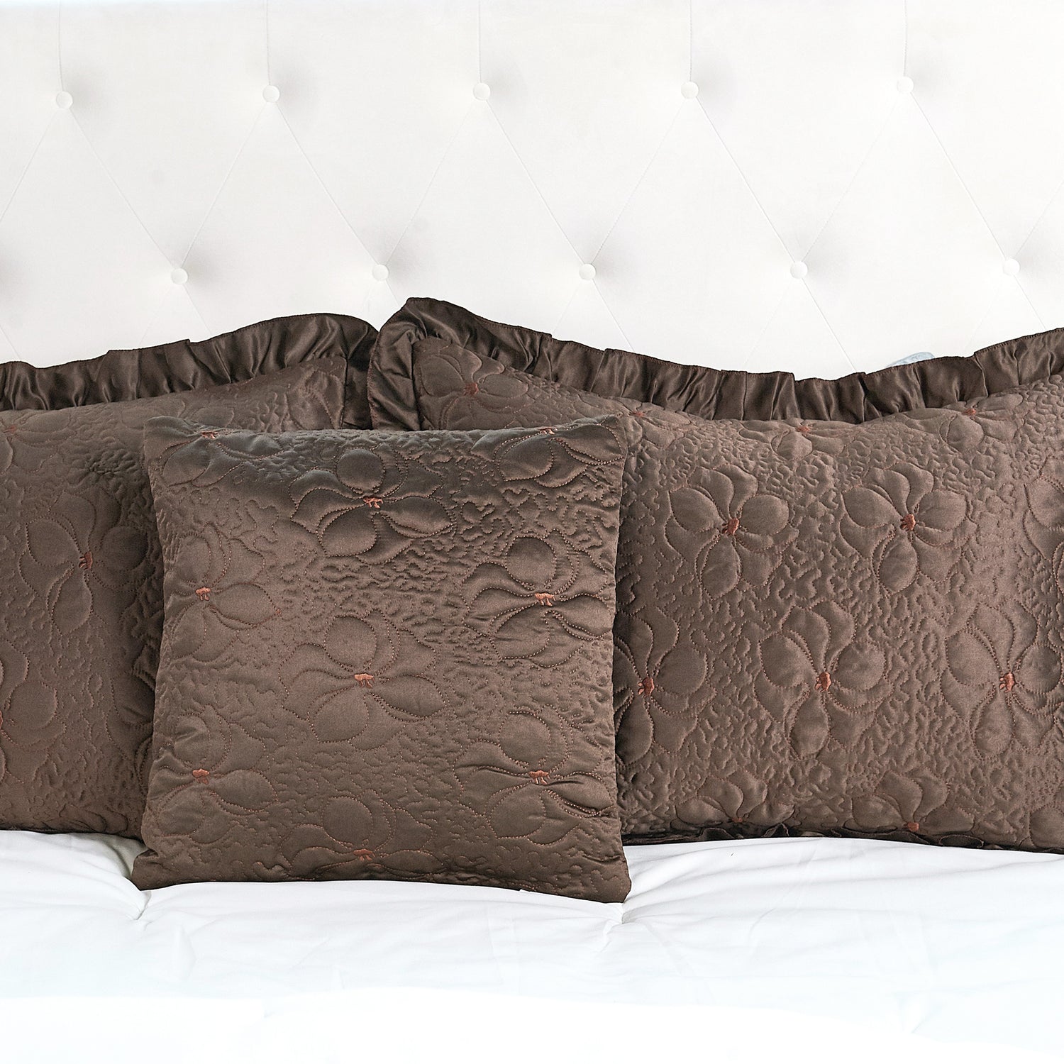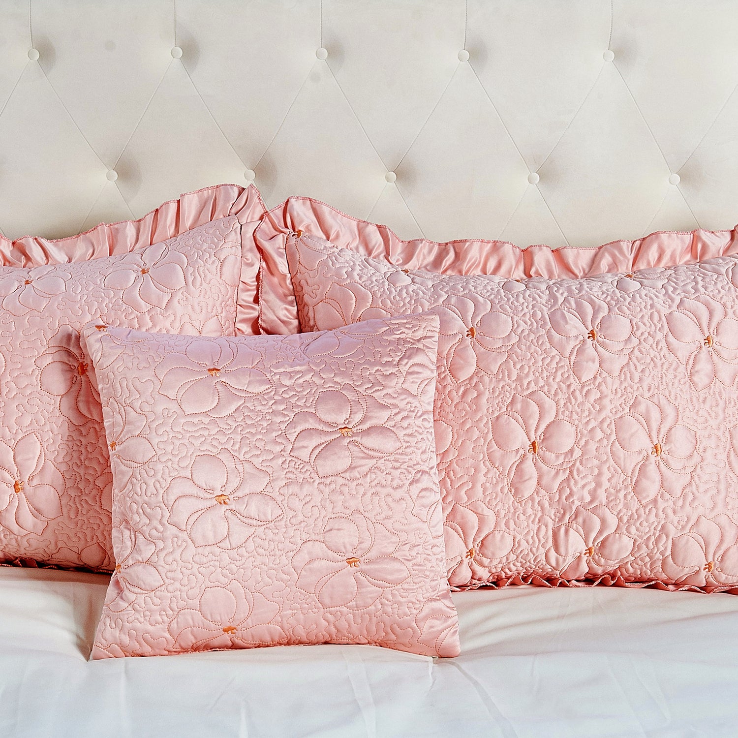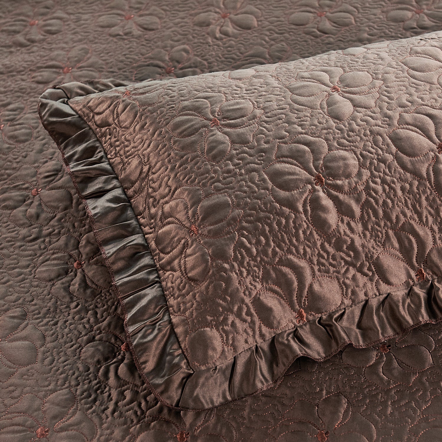 • The Matte Satin Ruffle Set is a beautiful embroidered quilted set. The coverlet, two Shams, and the Accent Pillow all have the same solid base with an accented flower quilted pattern. Each bedspread has 24 Inches of ruffles that run from the end of the mattress top to the floor. PLEASE CHECK DIMENSIONS FOR SPECIFIC SIZE. Queen Coverlet - 60 x 80 + 24 Inches. (2) Shams - 26 x 26 + 2 Inches. Accent Pillow. 16 x 16 Inches.