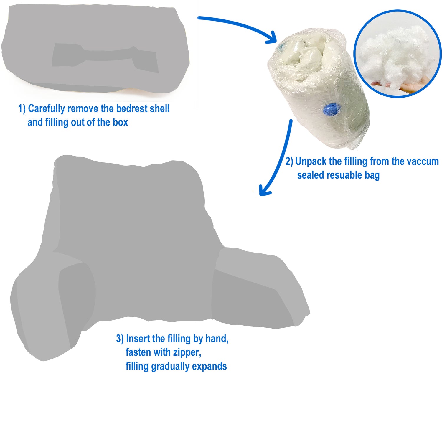 - ASSEMBLY NOTES! Bedrest Cover and Filling Come Separately for Do It Yourself Purpose. Take delight in the DIY filling that is packaged in a vacuum-sealed, space-saving reusable bag. Bed rest shell is included in the box, ready to be filled. Easy fill directions create a fun Do It Yourself atmosphere and allow you to take pride in your new home addition.
