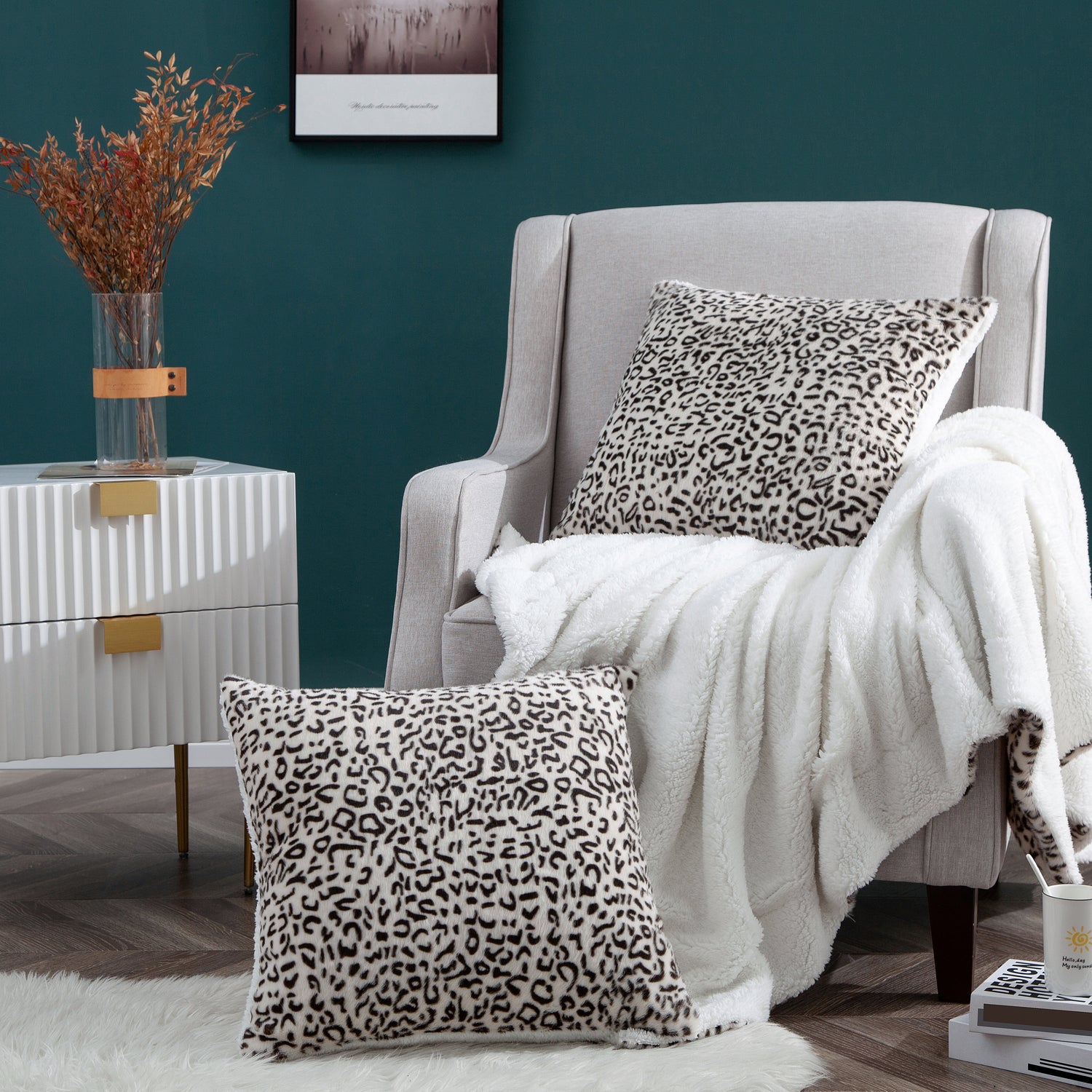 - Face side of these pillow covers is made of 100% Polyester premium faux fur, back side material is sherpa, making this cushion cover extremely soft, skin-friendly, cozy, comfy, thick and warm enough to touch and lay on. With off-white base, chic, rustic and trendy snow leopard design, this pillow covers set can easily coordinate with your home décor. We believe they will upgrade your room and infuse personality to your home.