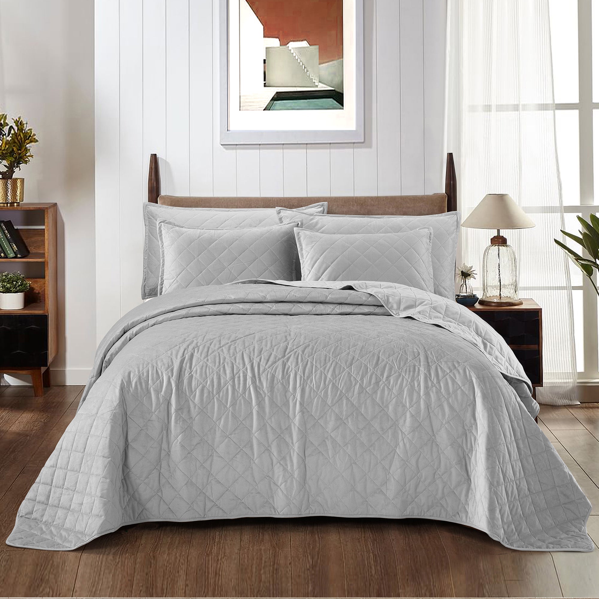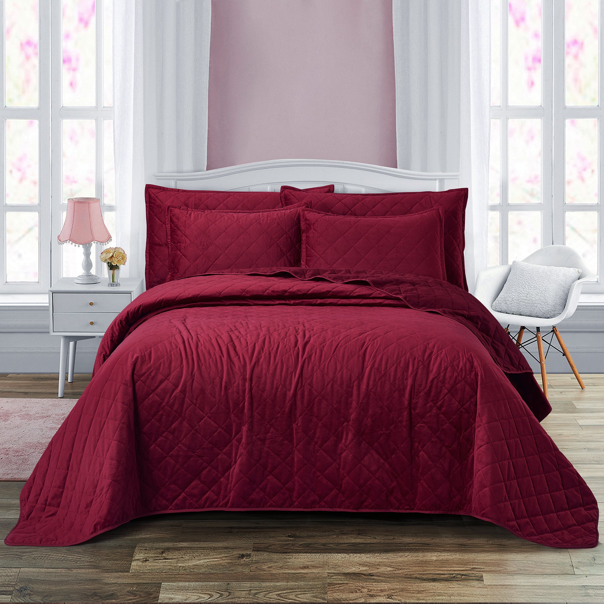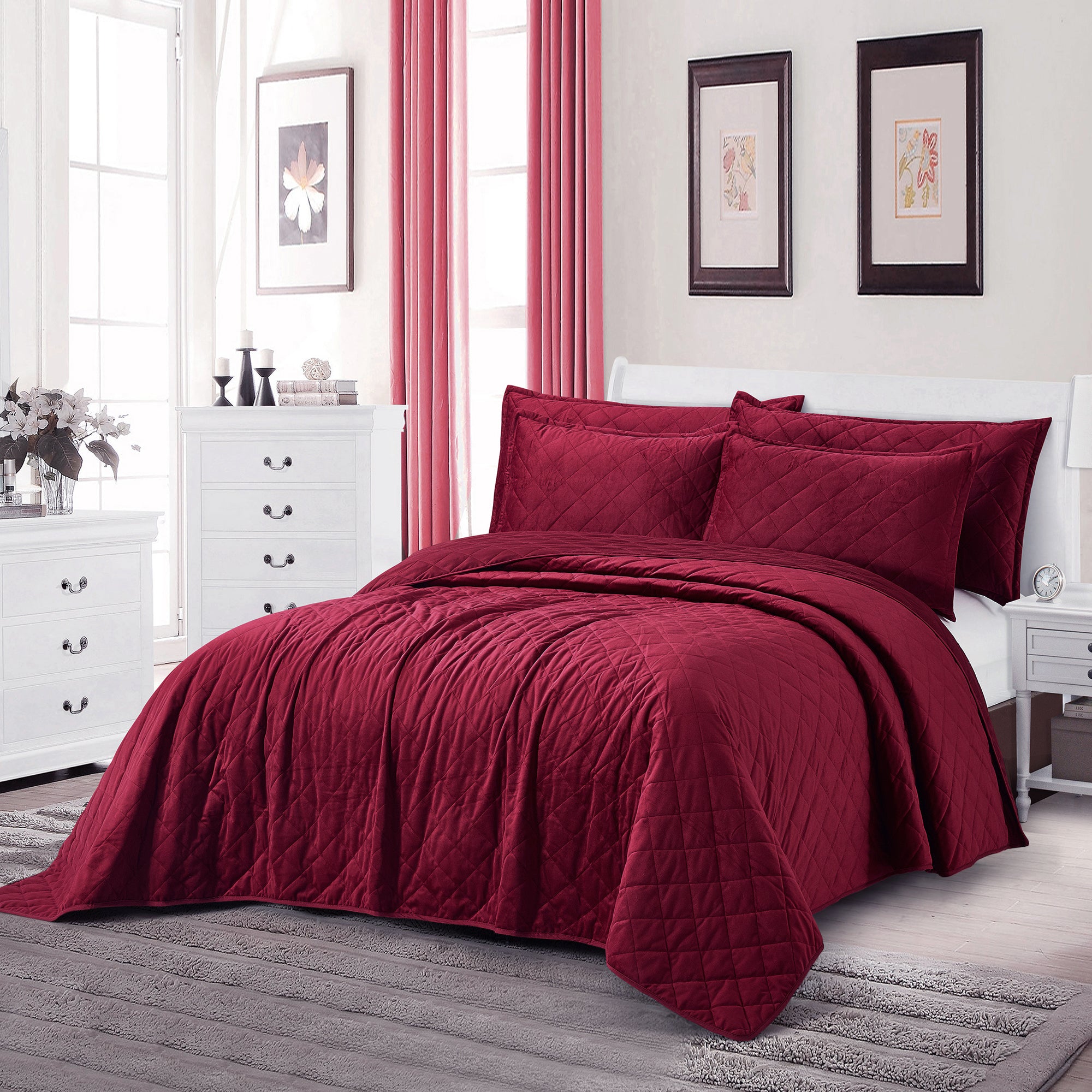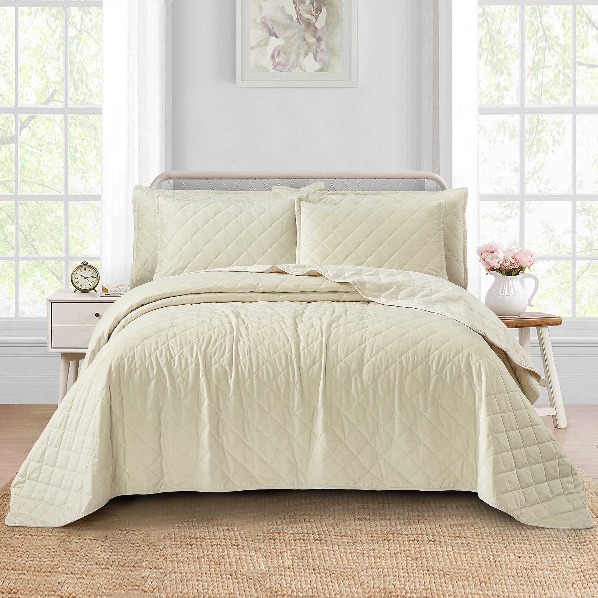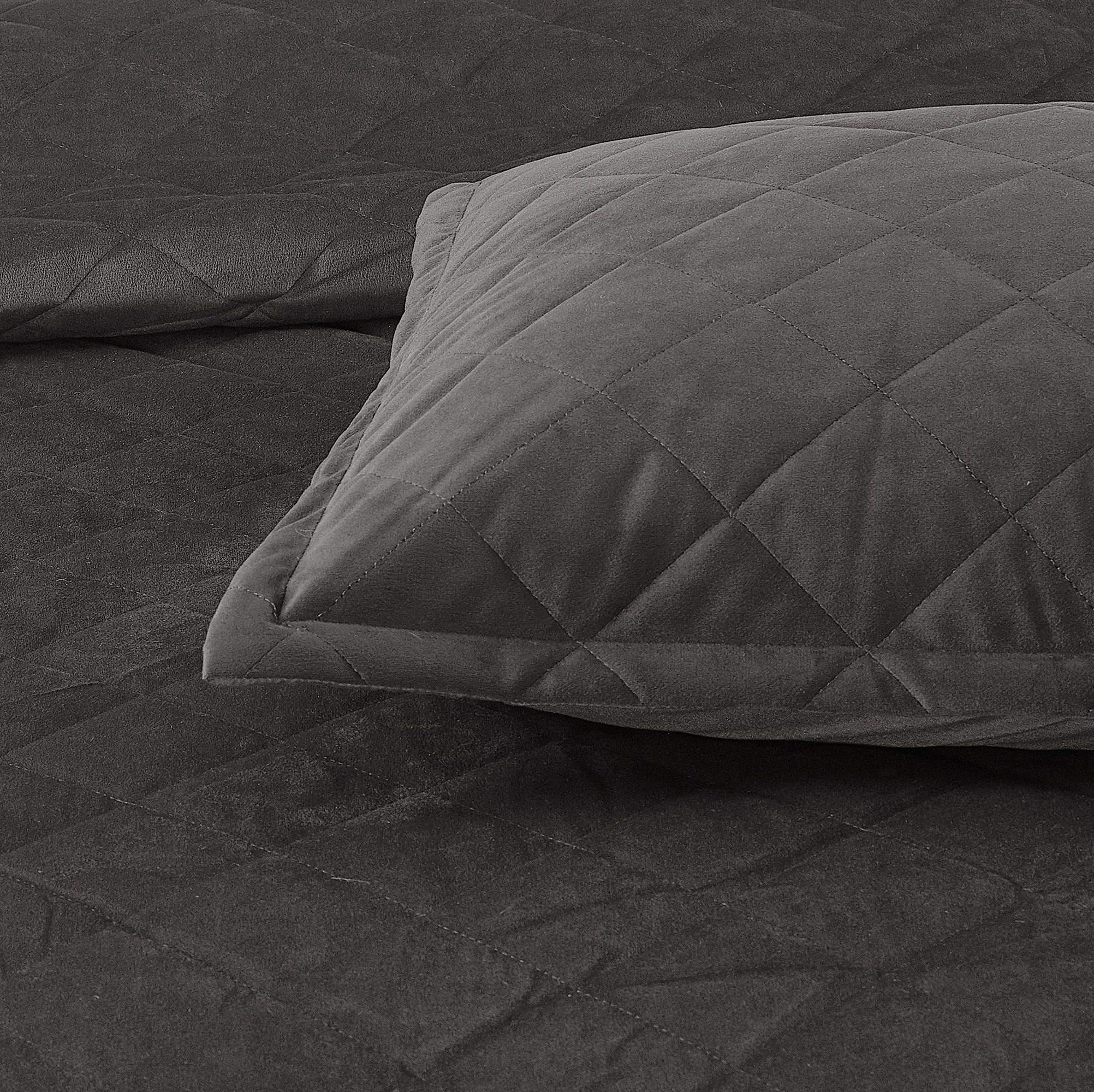 Super Soft Flannel Microfiber Velvet 5-Piece bedspread sets are designed for comfort, warmth, and class. The highly detailed diamond pattern quilting provides an elegant ambiance to your bedroom. A set includes 1 – Oversized Bedspread 122 inches x 106 inches, 2 - Shams 20 inches x 26 inches and 2 -Shams 20 inches x 36 inches. Simply machine wash, separately, using cold water on a gentle cycle. Tumble dry on lowest heat setting to avoid heat damage to your set.