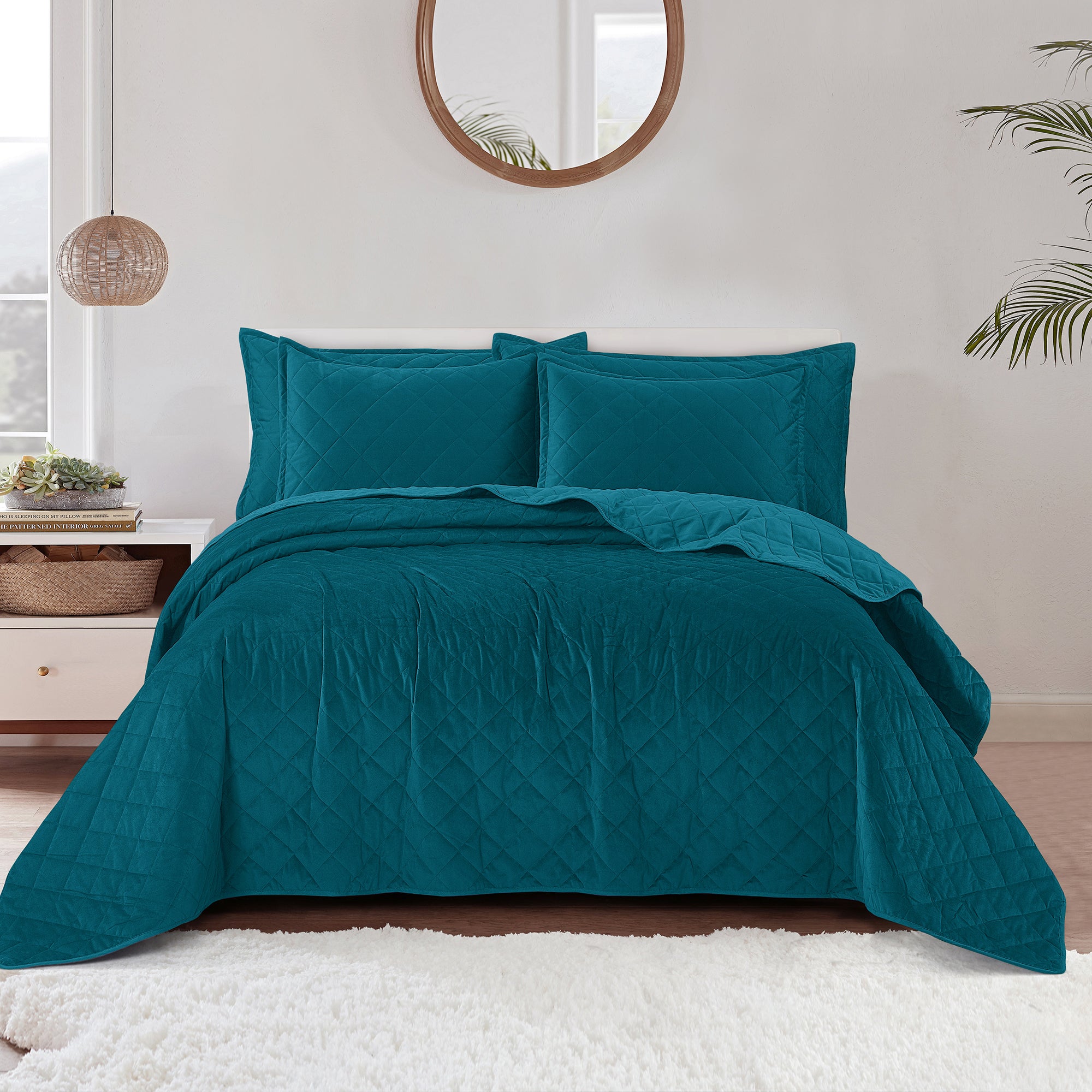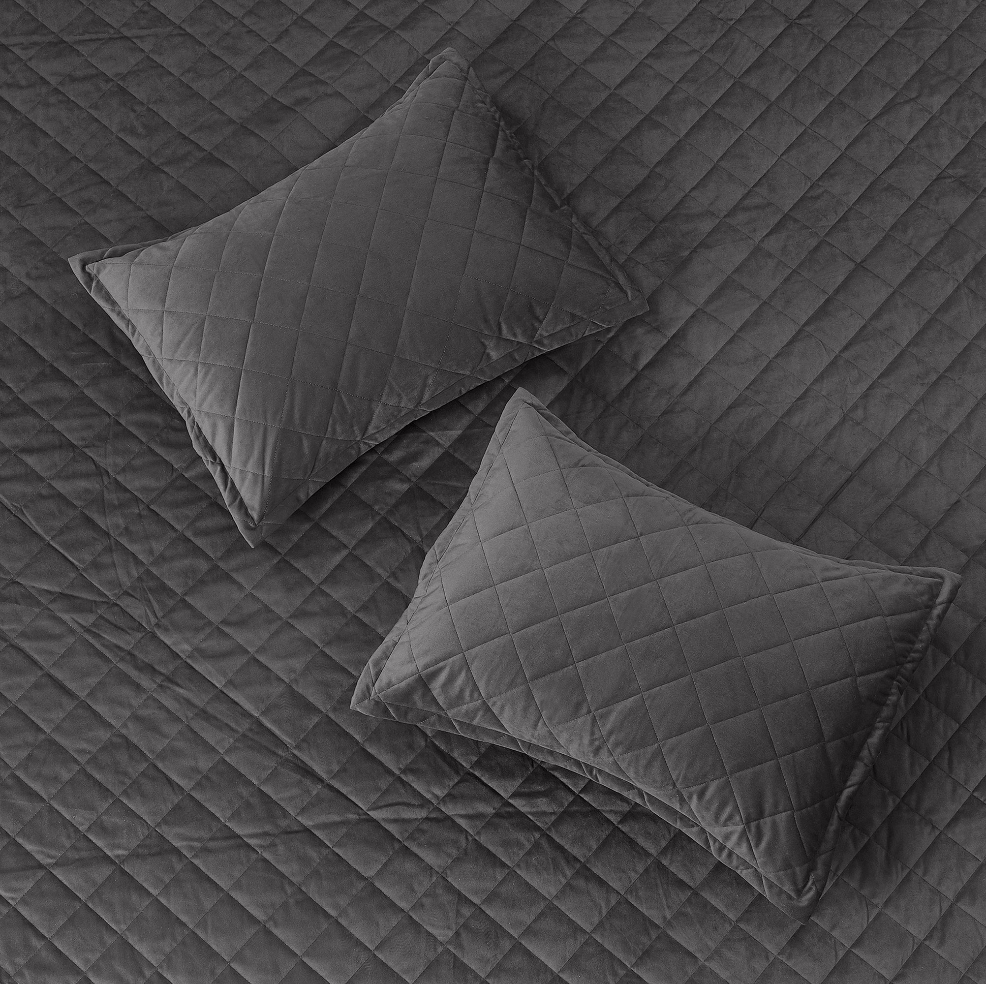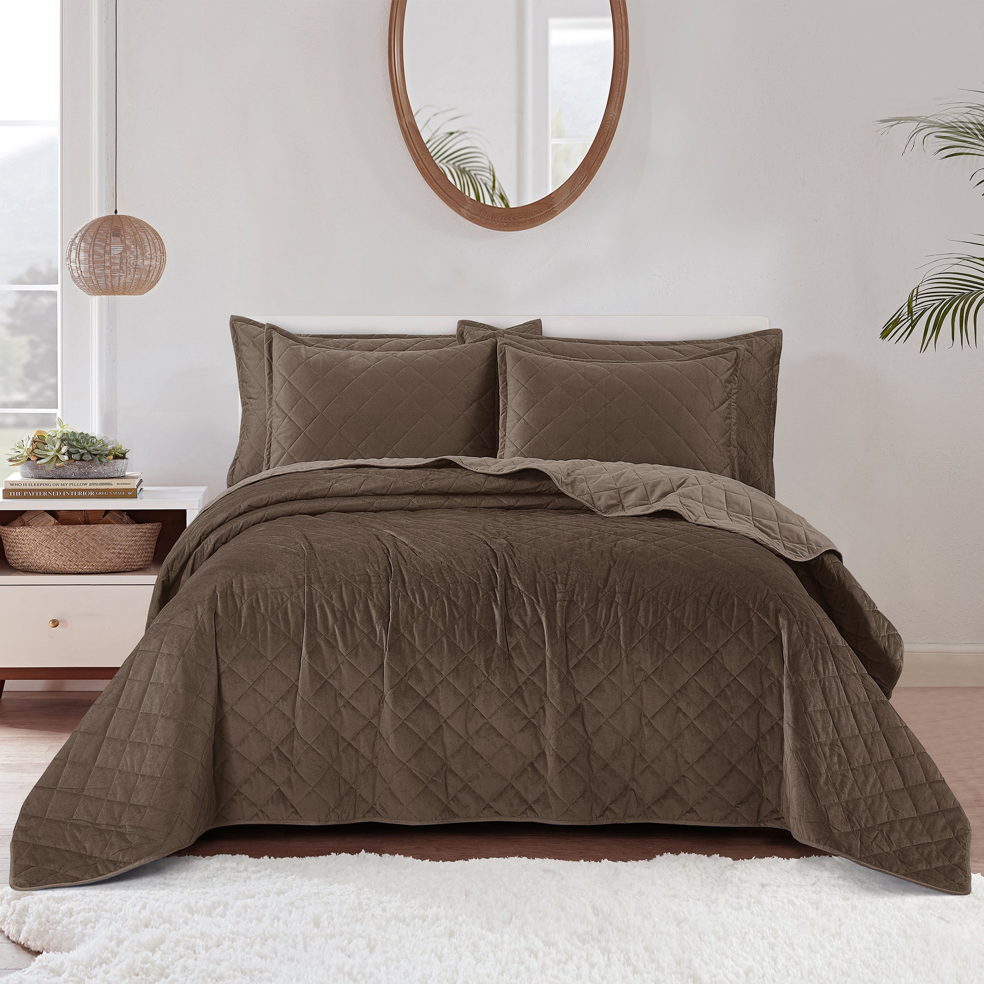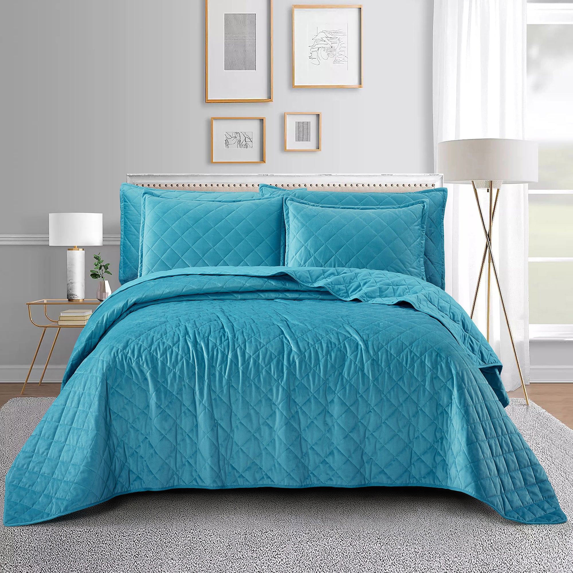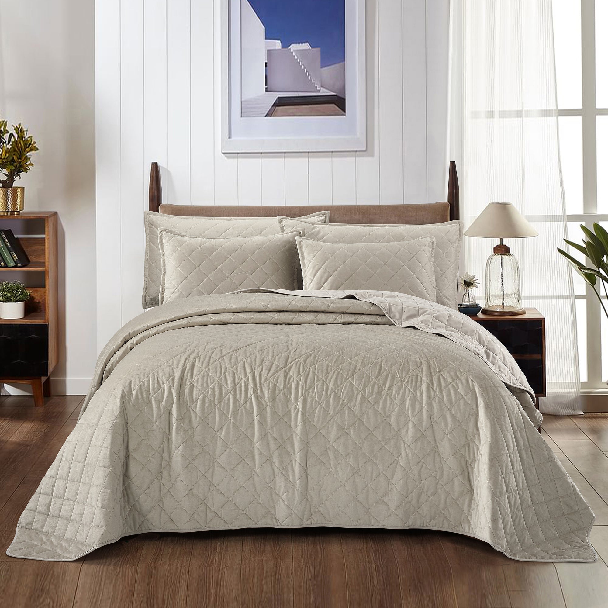 Super Soft Flannel Microfiber Velvet 5-Piece bedspread sets are designed for comfort, warmth, and class. The highly detailed diamond pattern quilting provides an elegant ambiance to your bedroom. A set includes 1 – Oversized Bedspread 122 inches x 106 inches, 2 - Shams 20 inches x 26 inches and 2 -Shams 20 inches x 36 inches. Simply machine wash, separately, using cold water on a gentle cycle. Tumble dry on lowest heat setting to avoid heat damage to your set.