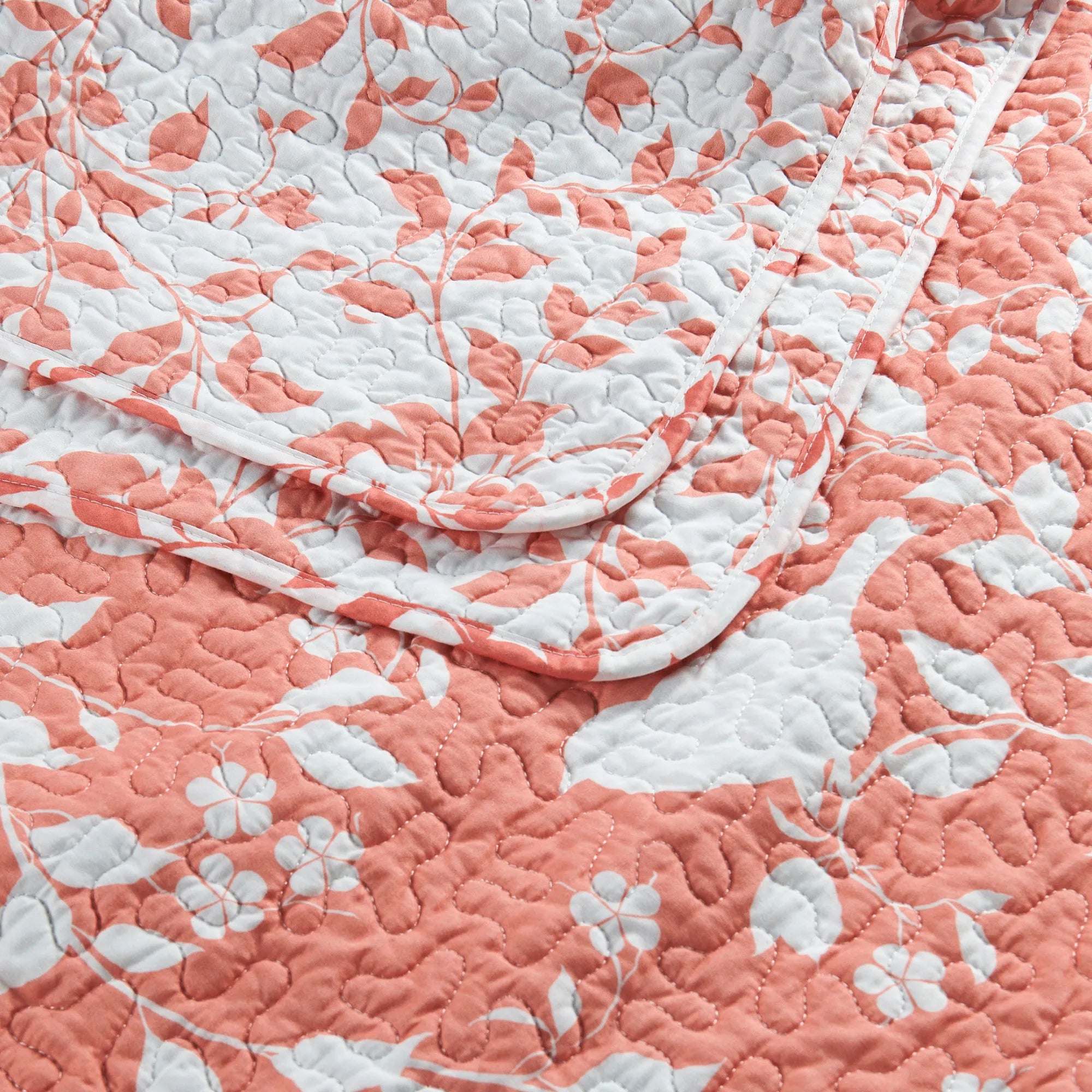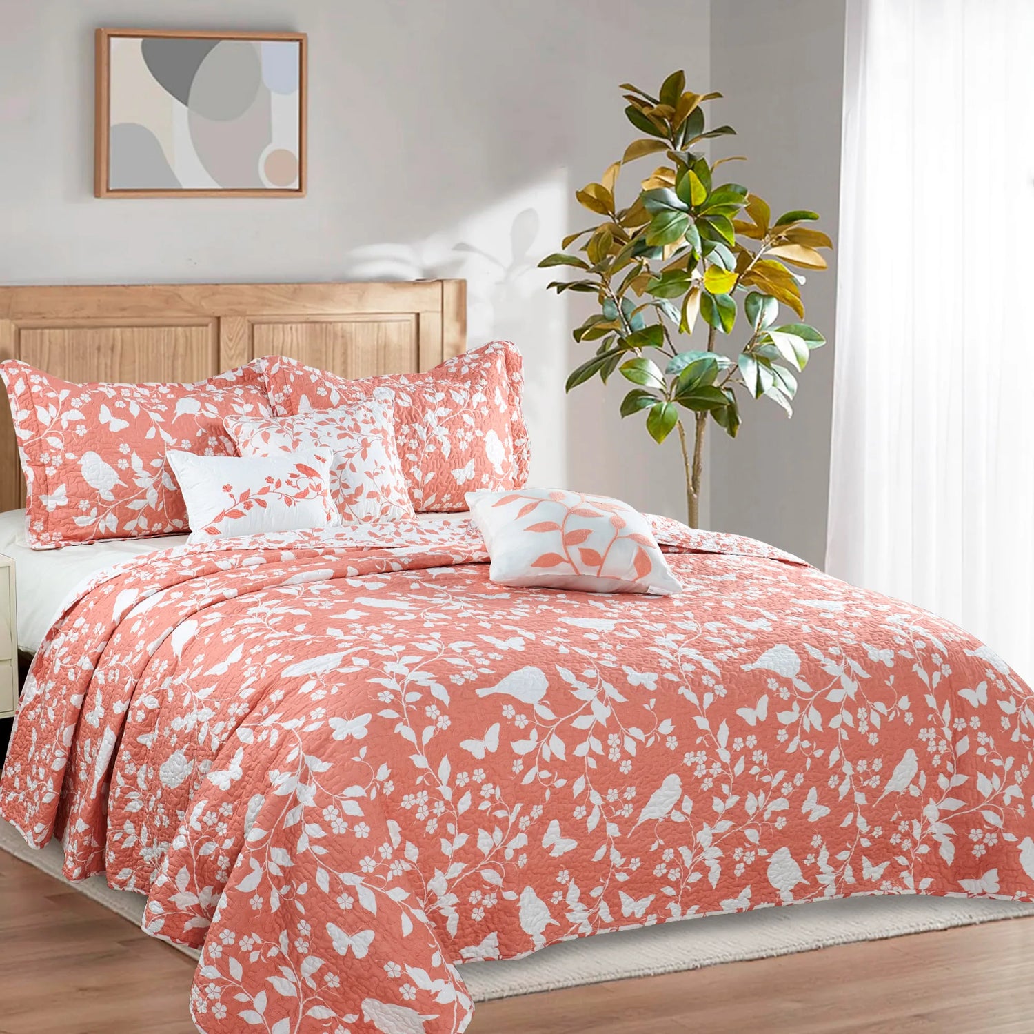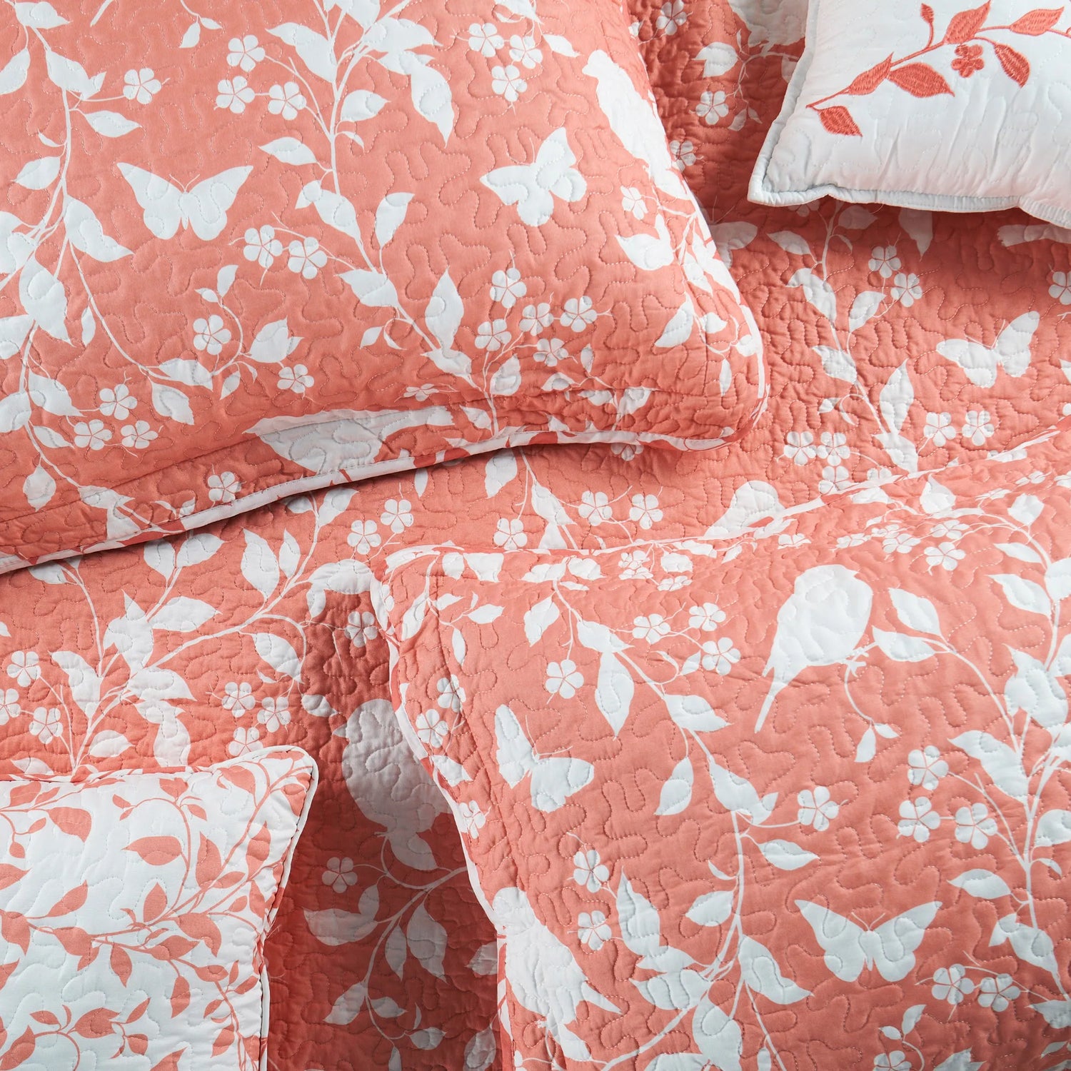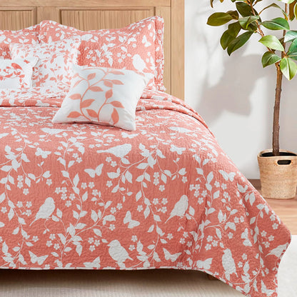 • COVER YOURSELF IN CREATIVITY - Be Swept Off Your Feet And Into Bed With This Impressively Light Weight Quilted Coverlet Set. Birdsong pattern includes white silhouettes of birds, butterflies, flowers and leaf vines on a soft coral background. Pre-washed and quilted for a wrinkle finish that provides an ultra-soft, textured sensation.