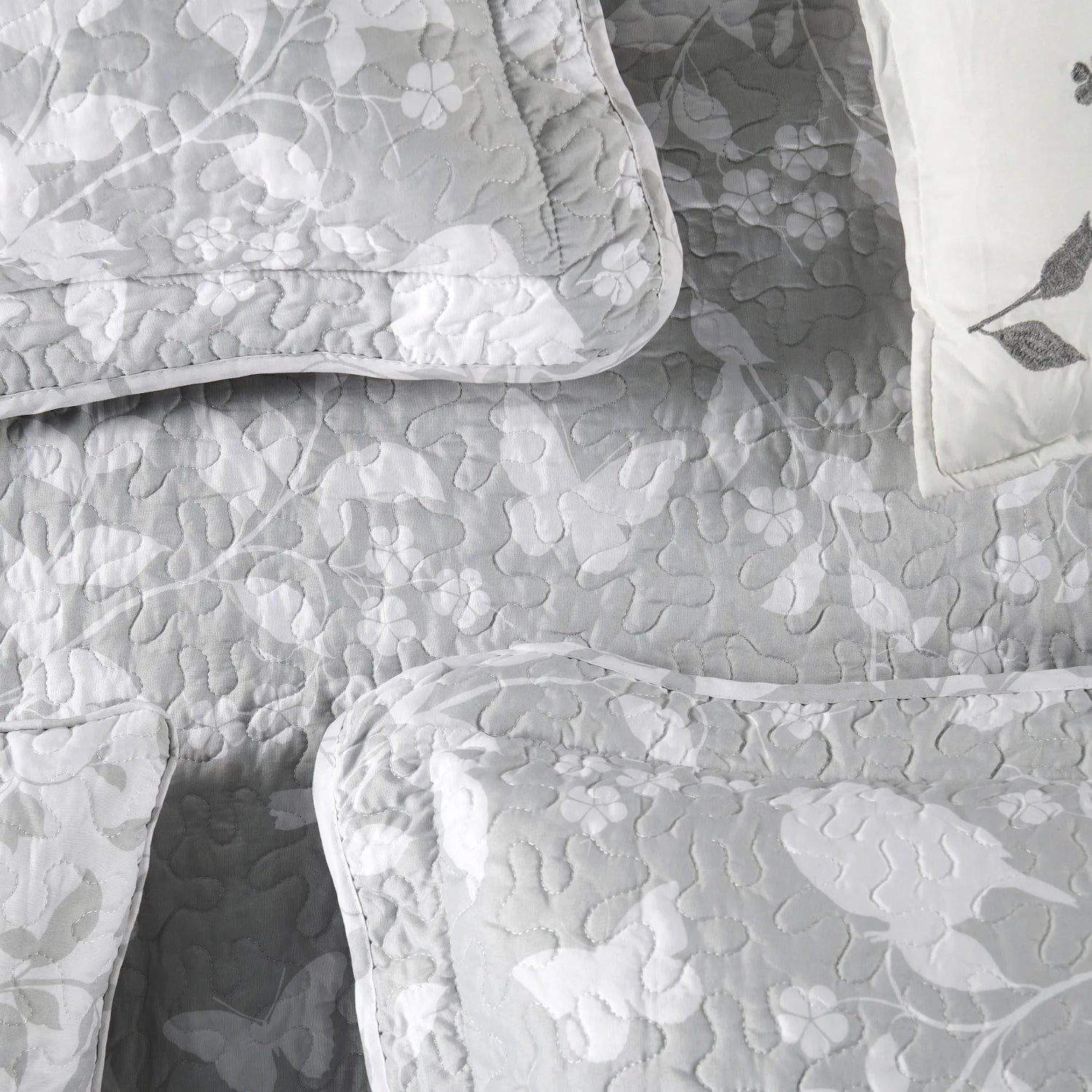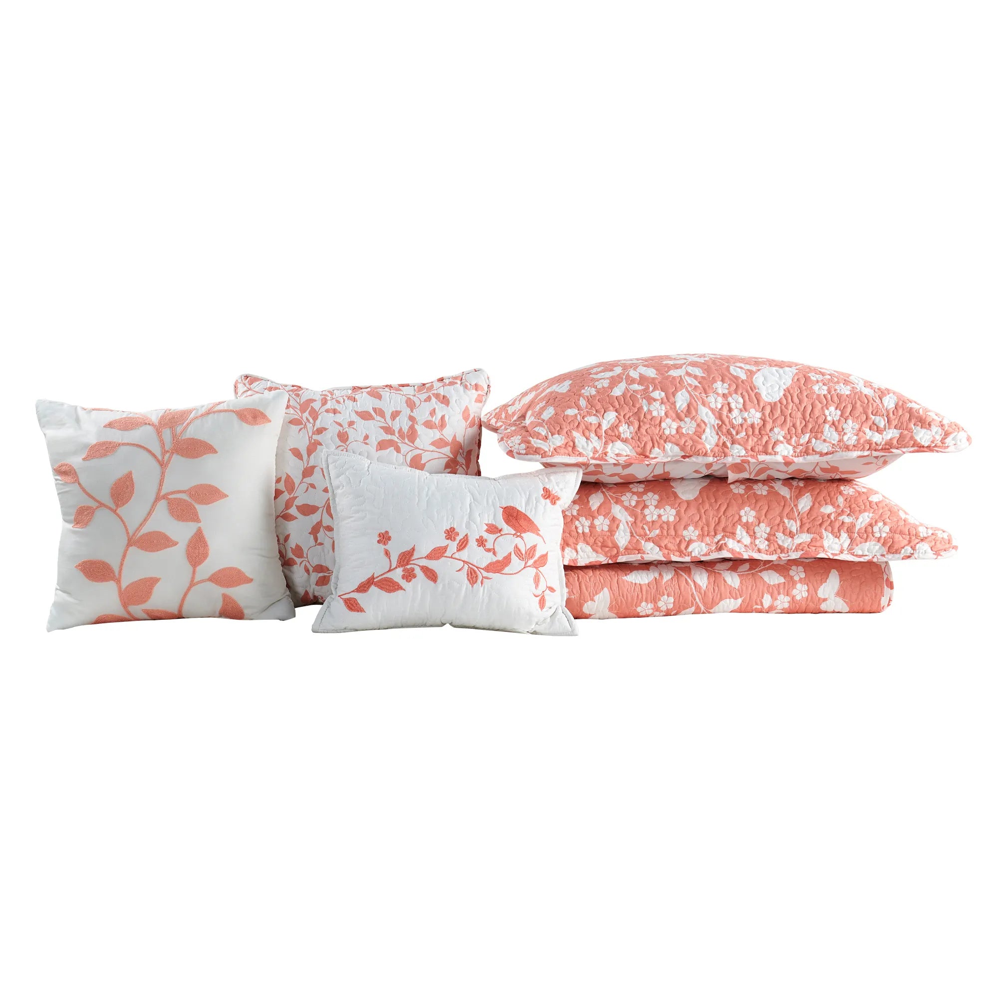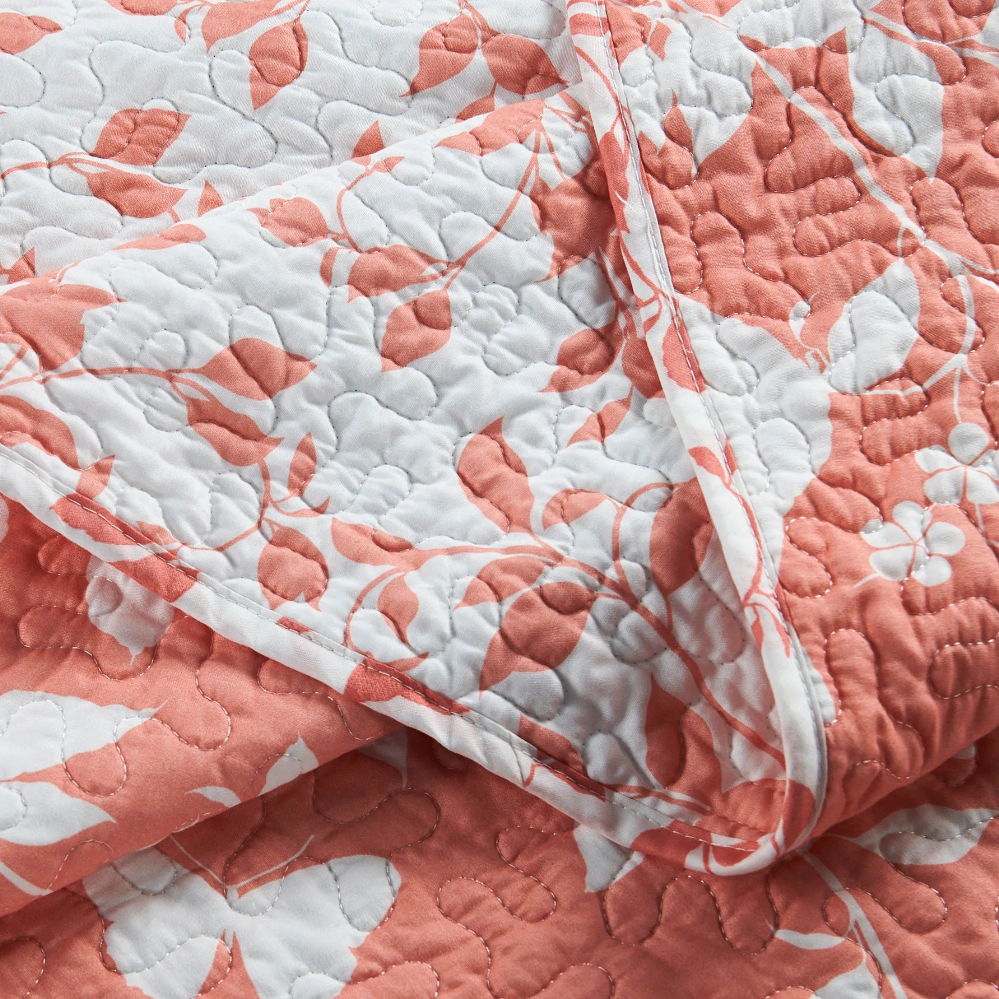 • COVER YOURSELF IN CREATIVITY - Be Swept Off Your Feet And Into Bed With This Impressively Light Weight Quilted Coverlet Set. Birdsong pattern includes white silhouettes of birds, butterflies, flowers and leaf vines on a soft coral background. Pre-washed and quilted for a wrinkle finish that provides an ultra-soft, textured sensation.