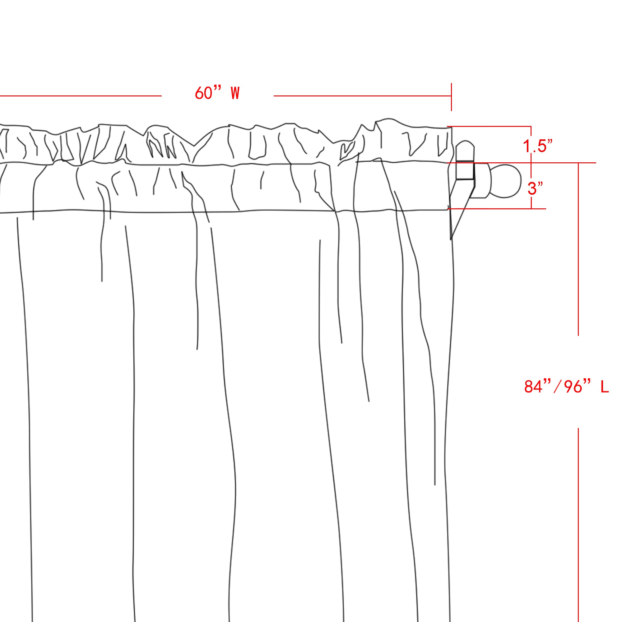 - Each curtain set includes 2 panels each measuring 60W x 84L inches plus 1.5" header. Hang your curtains on your favorite curtain rod up to 2” diameter. We recommend obtaining your window’s exact measurements prior to purchase to ensure size accommodates your needs.