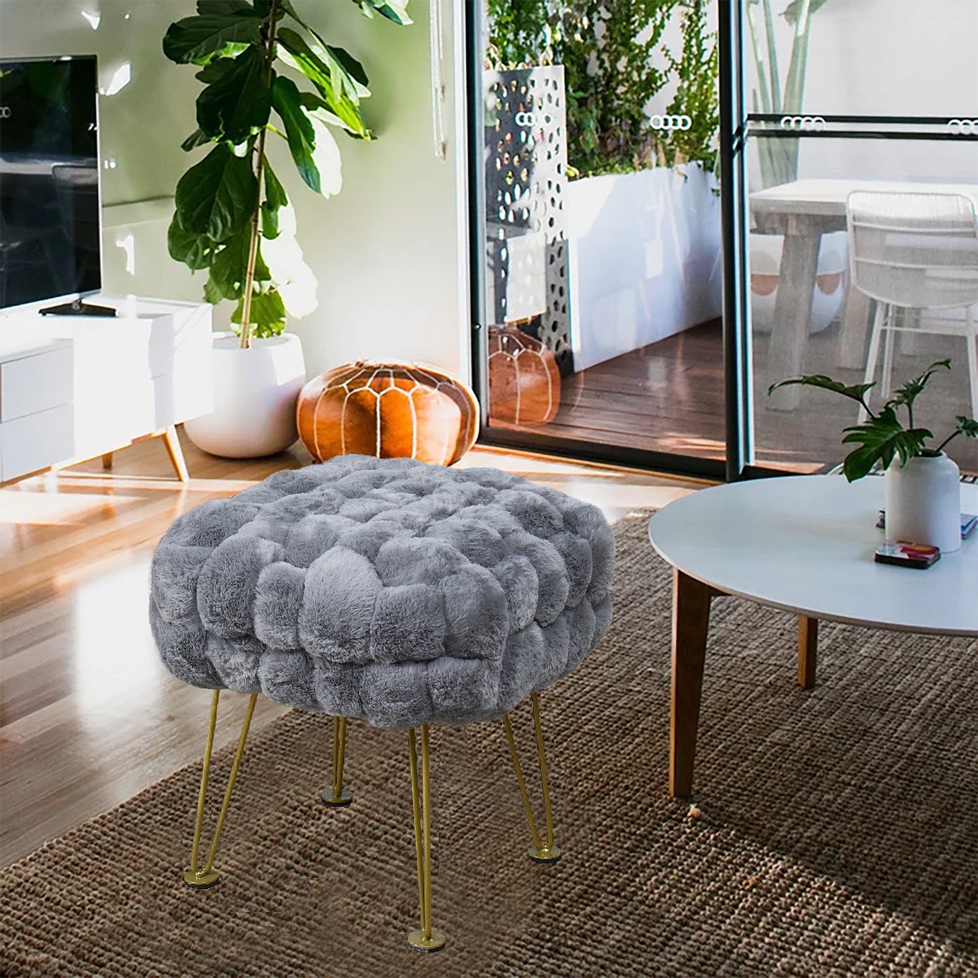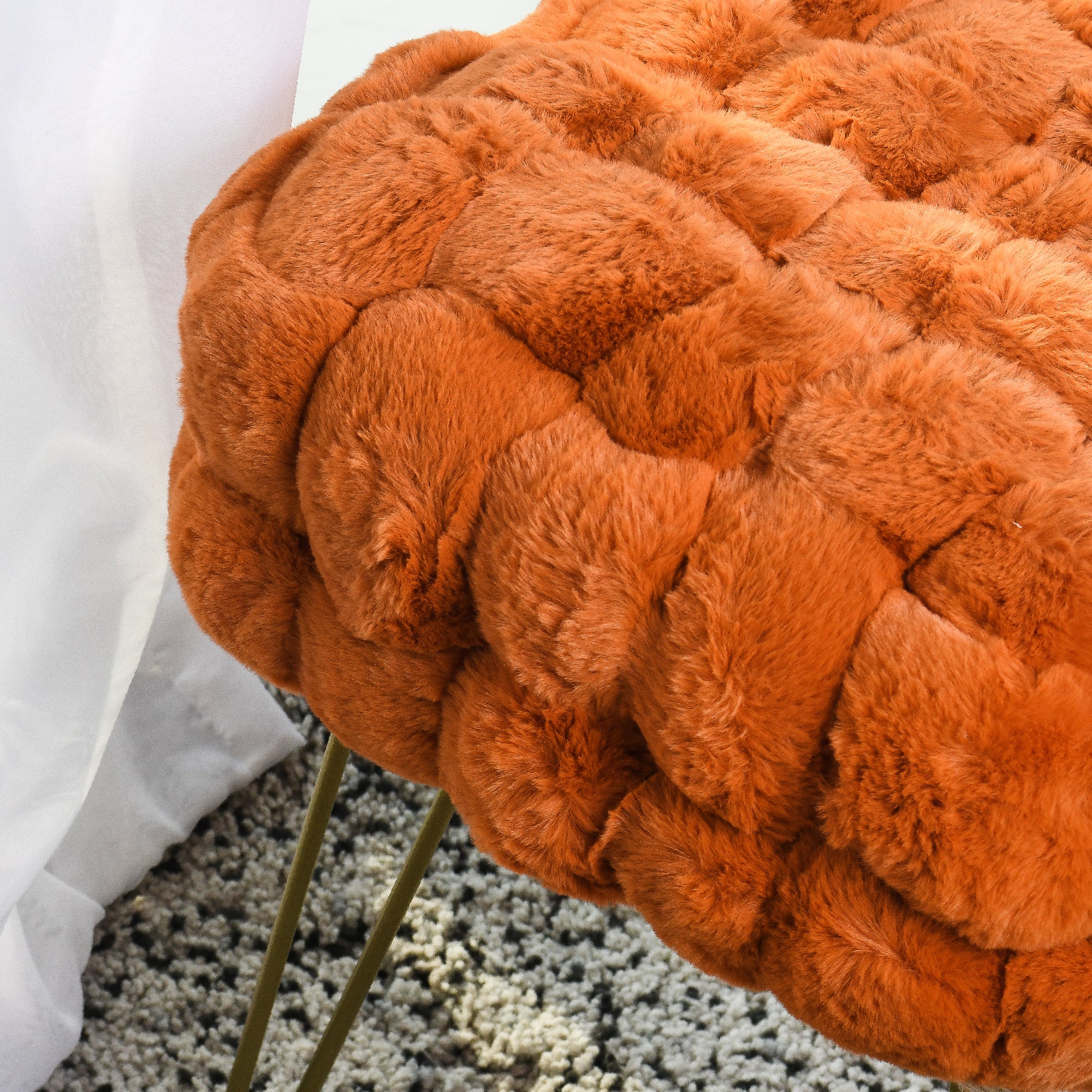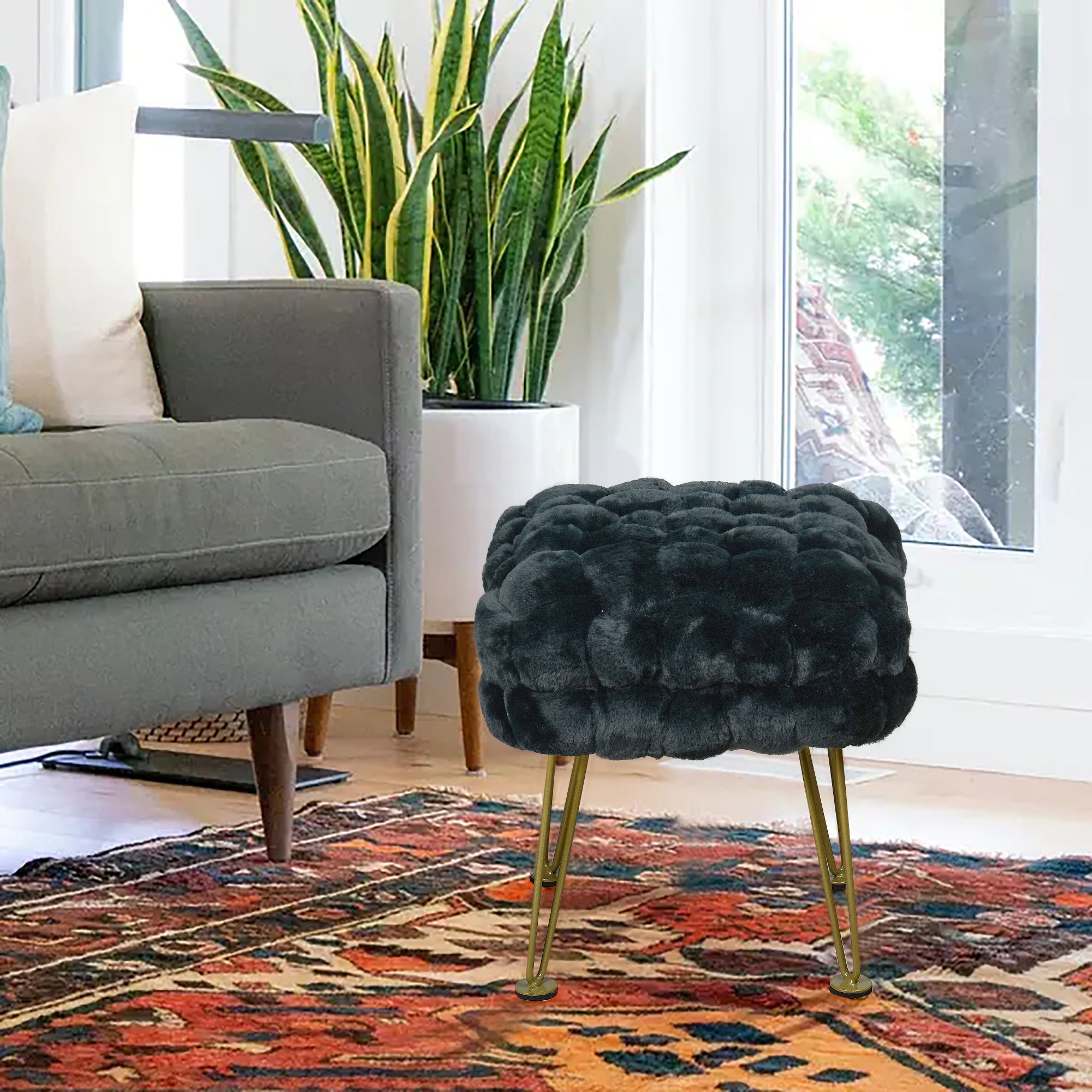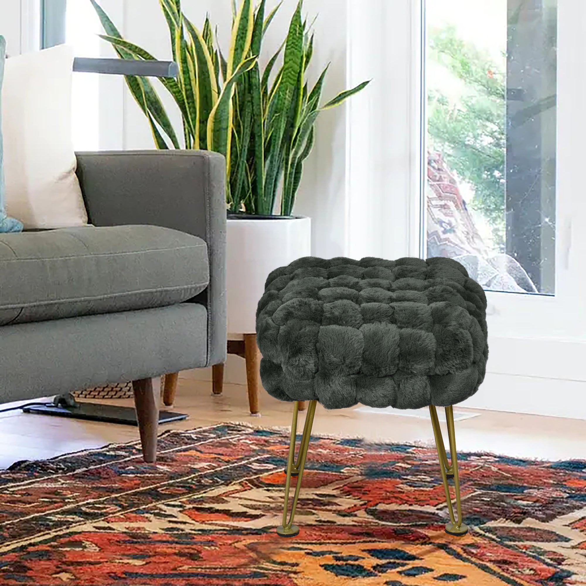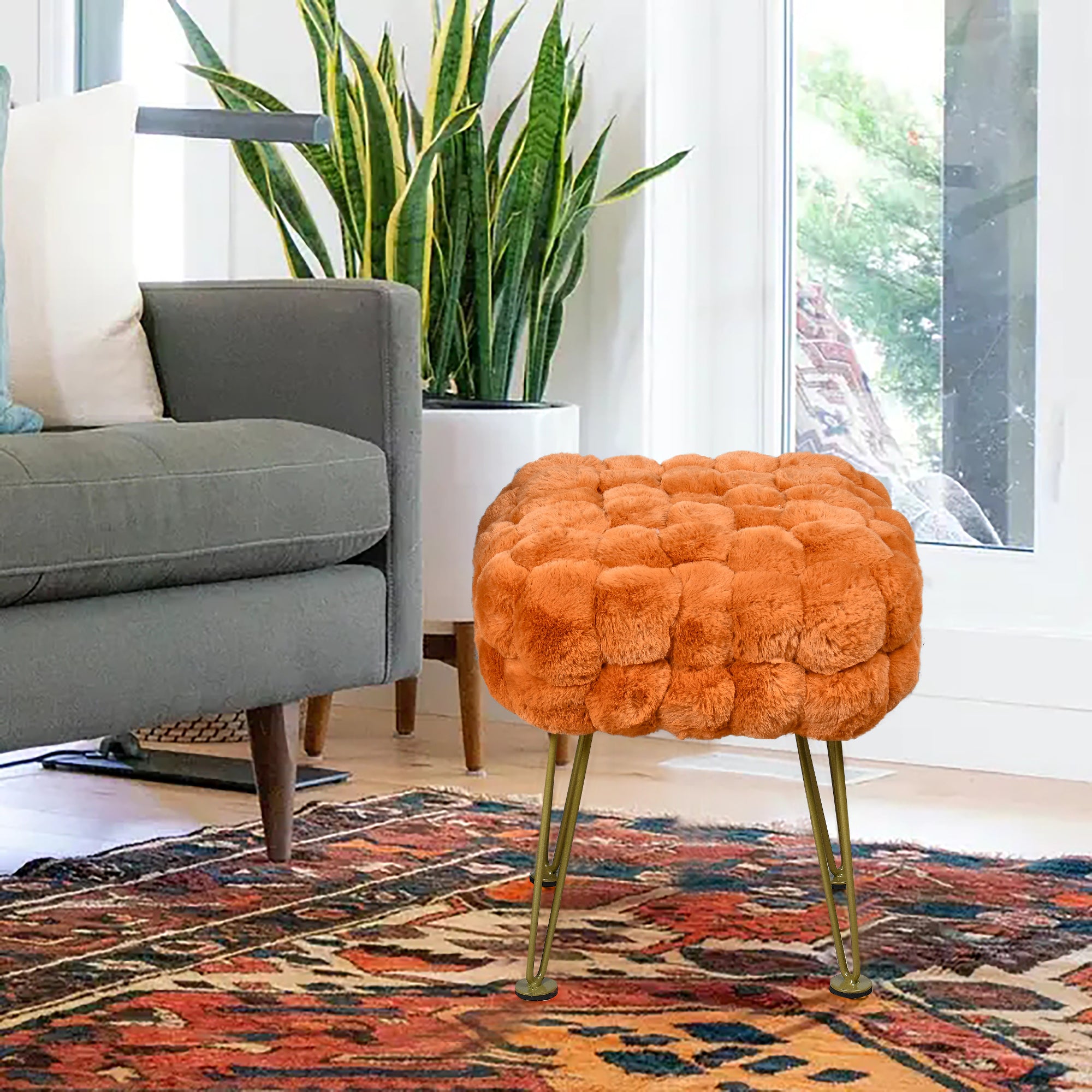 • This Fox Faux Fur Ottoman, featuring gold metal legs, provides the perfect balance of comfort and style. Its durable upholstery is designed to be both classic and long-lasting, while its small footprint makes it perfect for any living space.