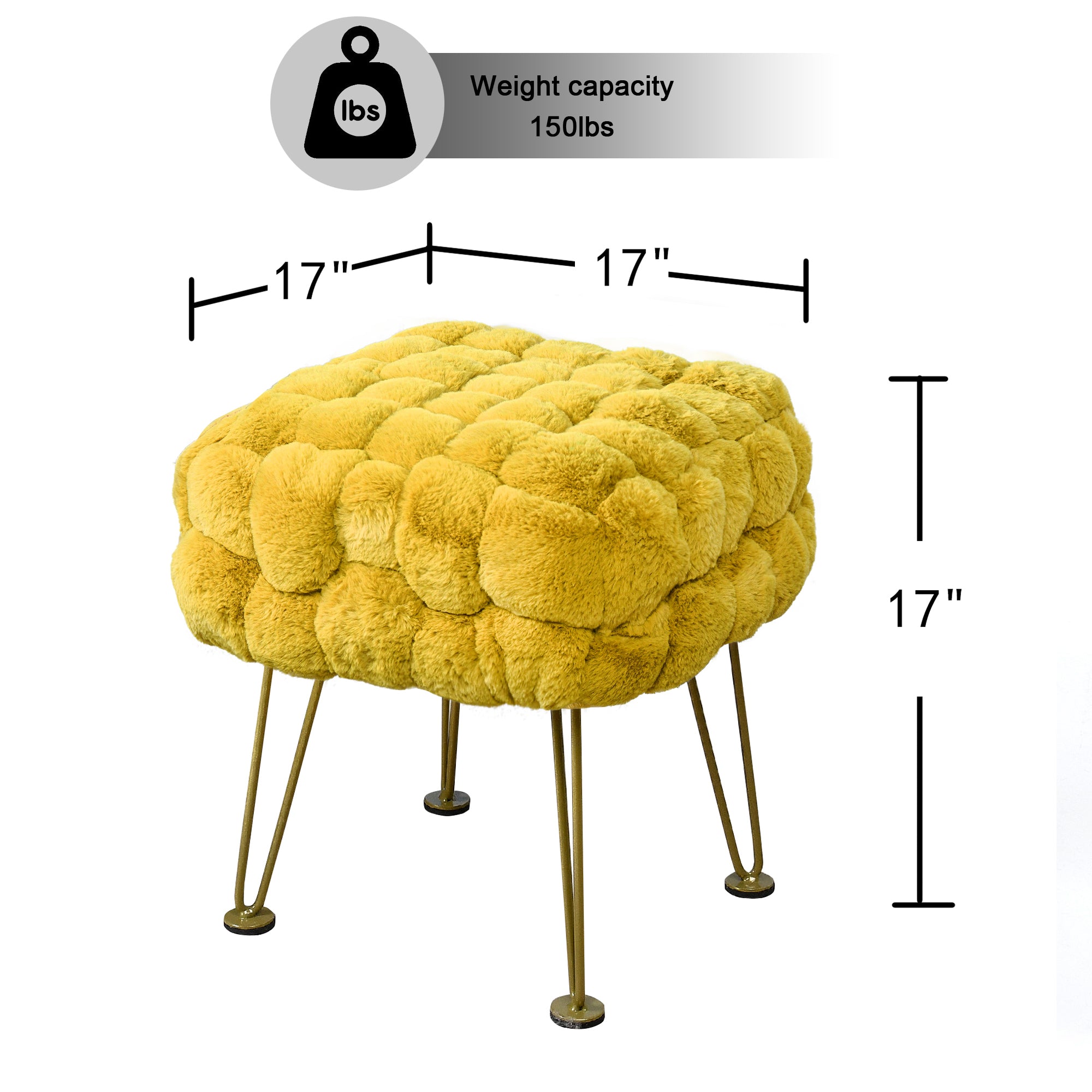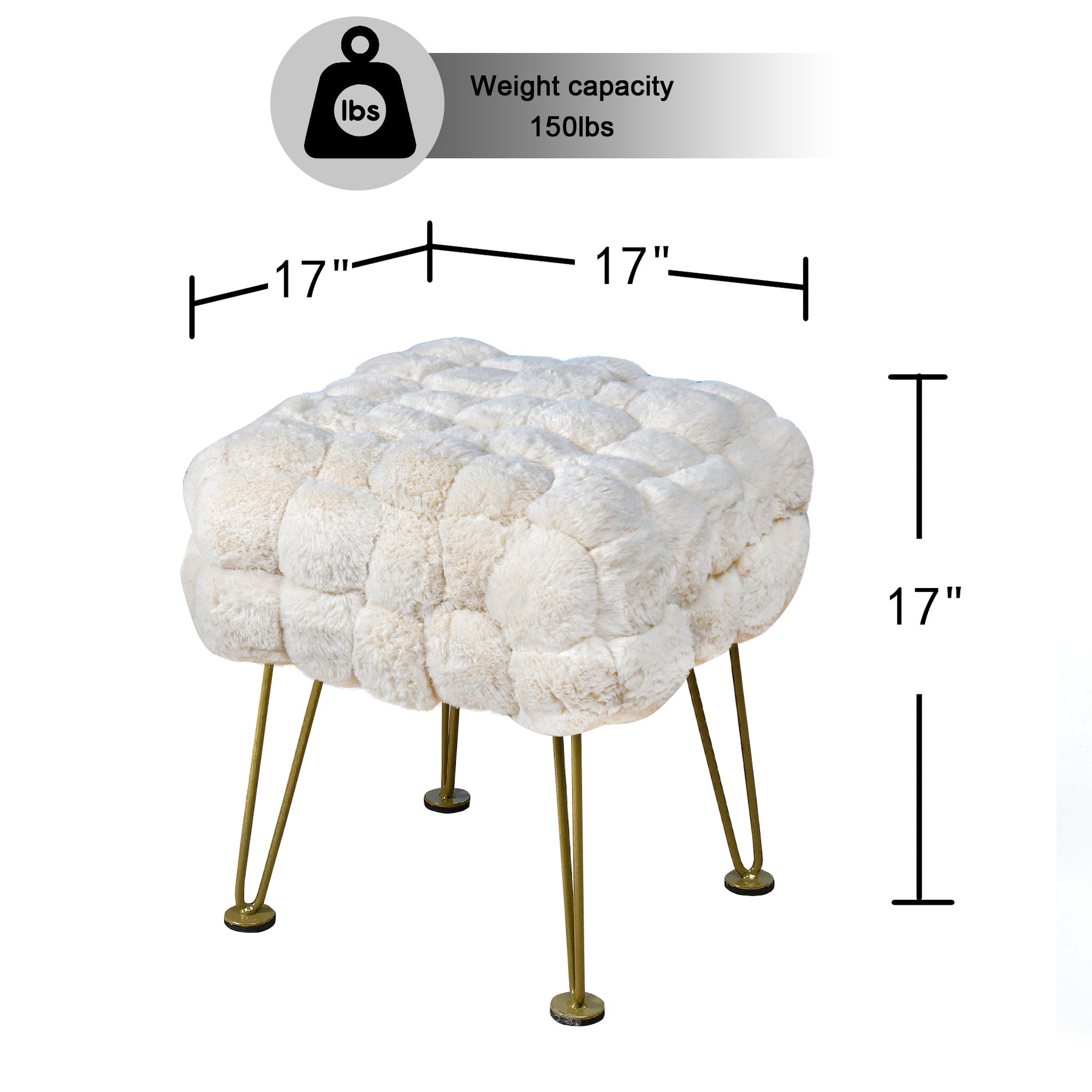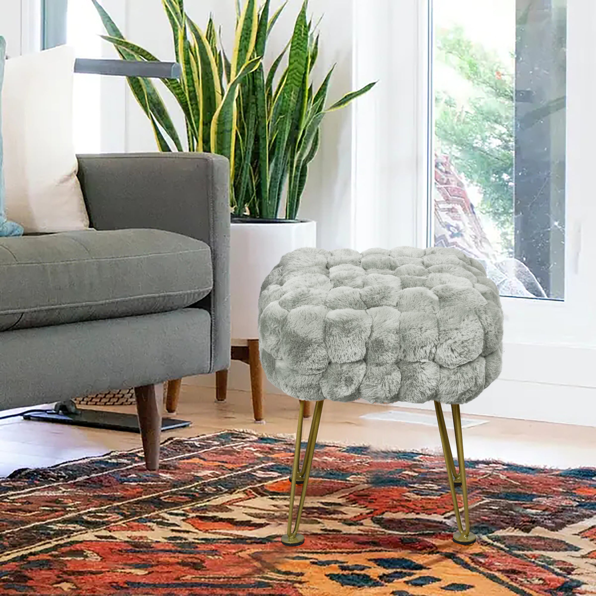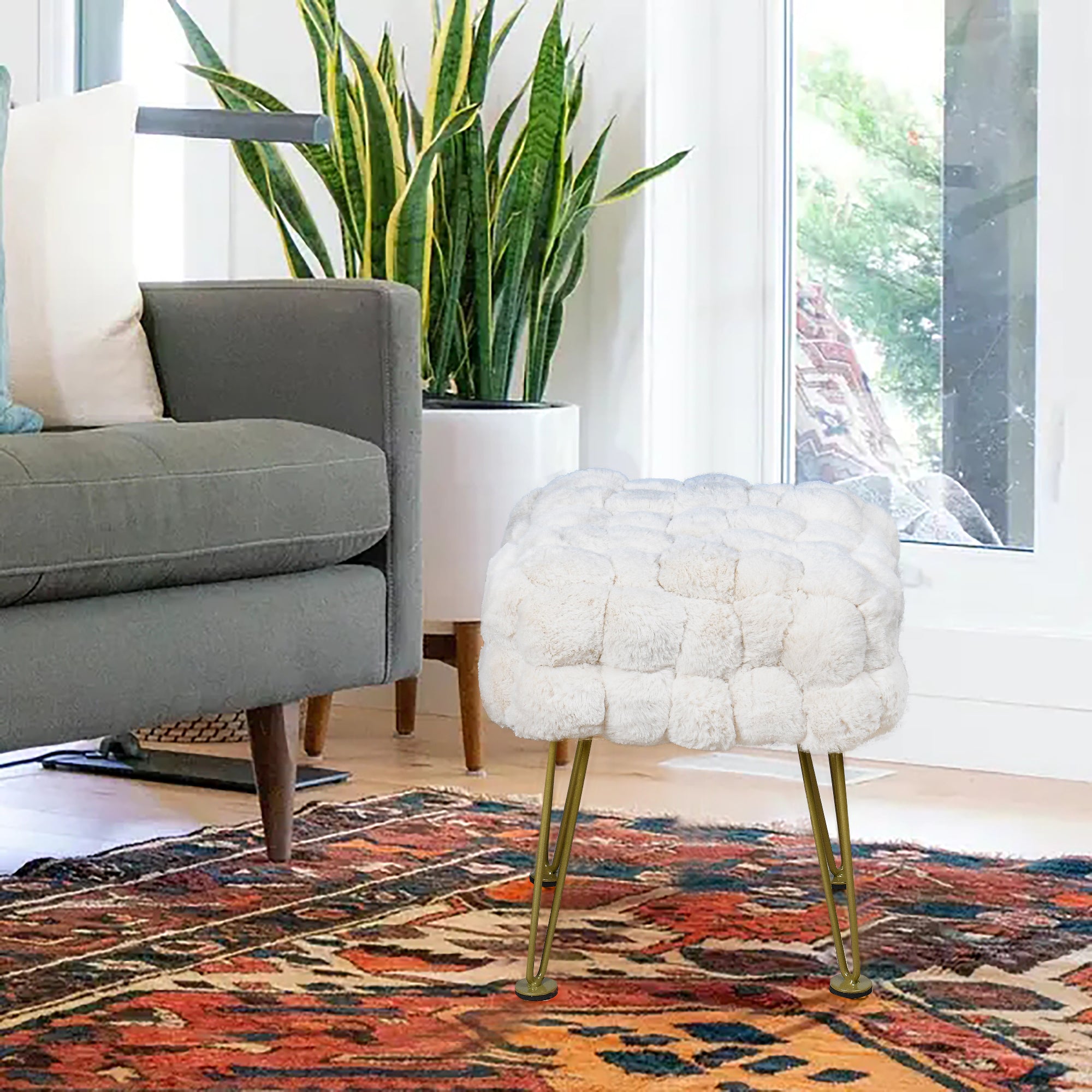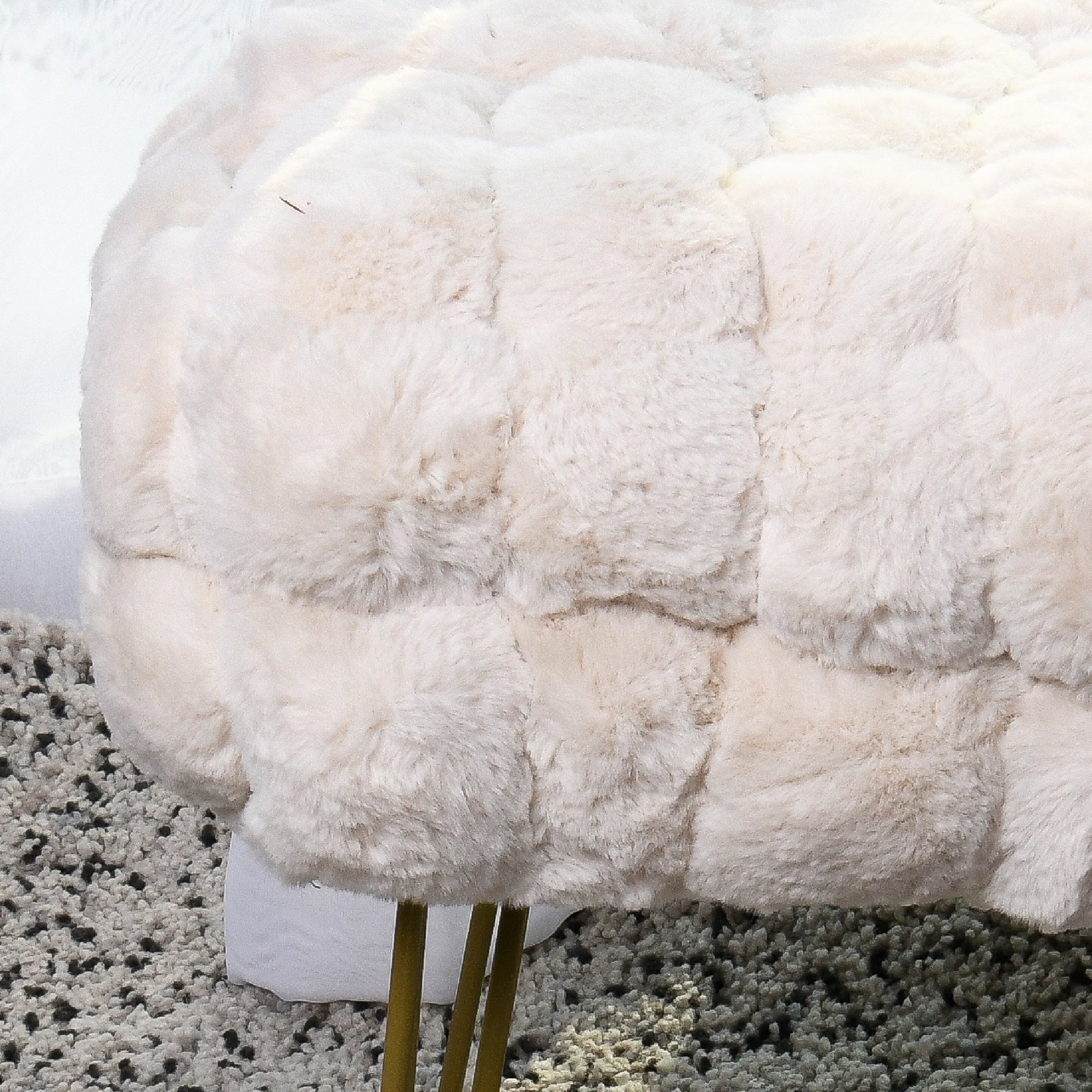 • This stylish ottoman provides a cozy, comfortable seat with its luxurious fauxfur upholstery. Its gold metal legs give the ottoman an elegant, dynamic look that is perfect for any room needing extra seating or a place to rest one's feet. Enjoy the plush, inviting feel of this accent piece.