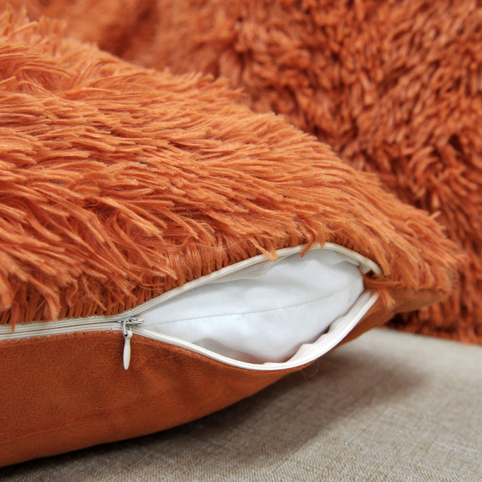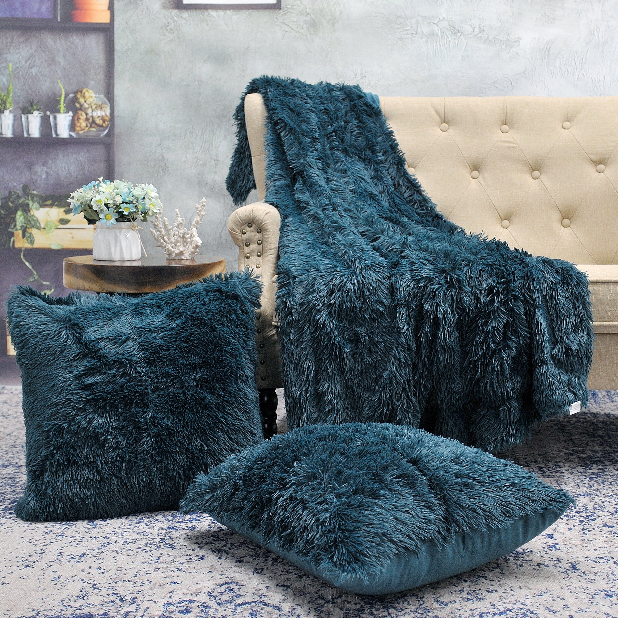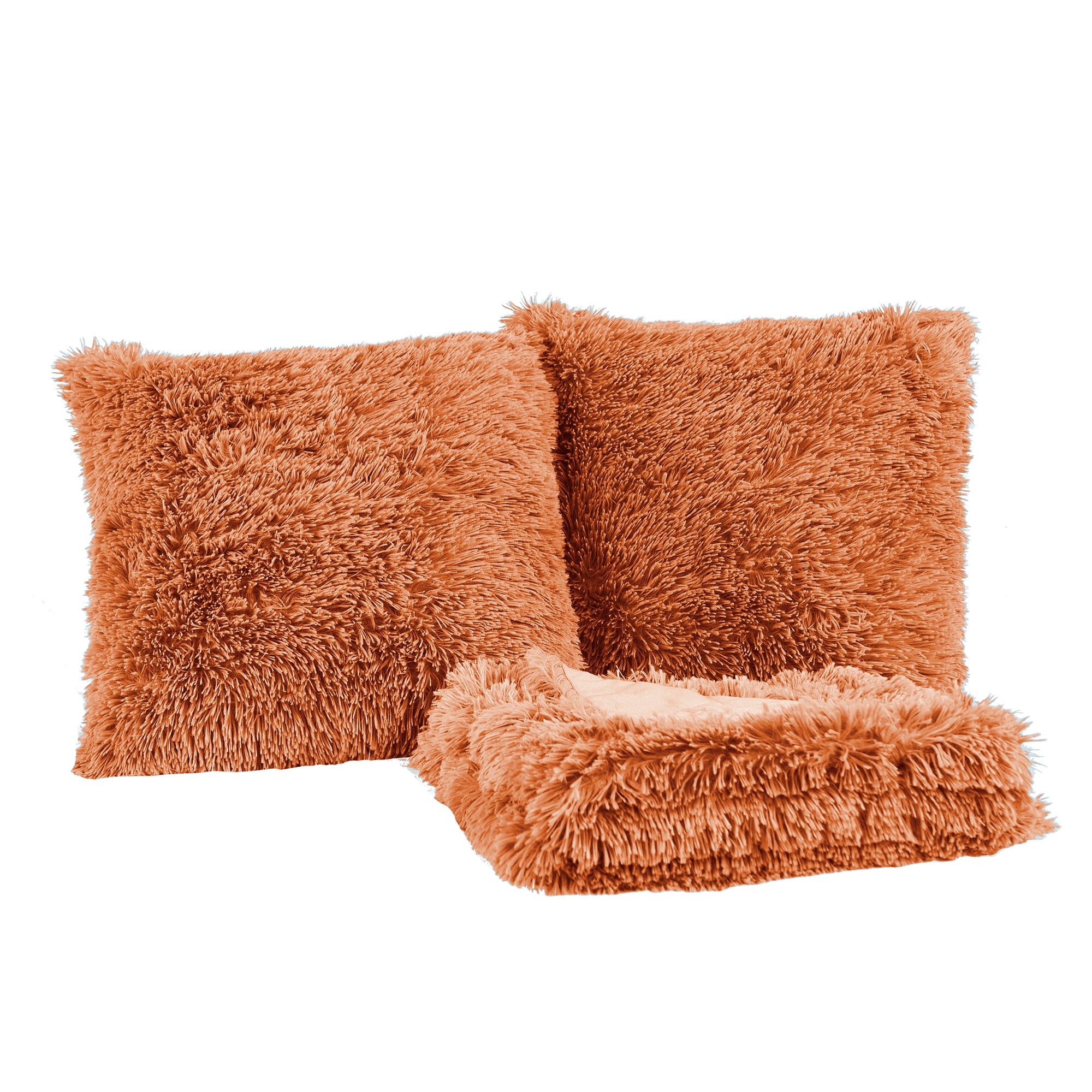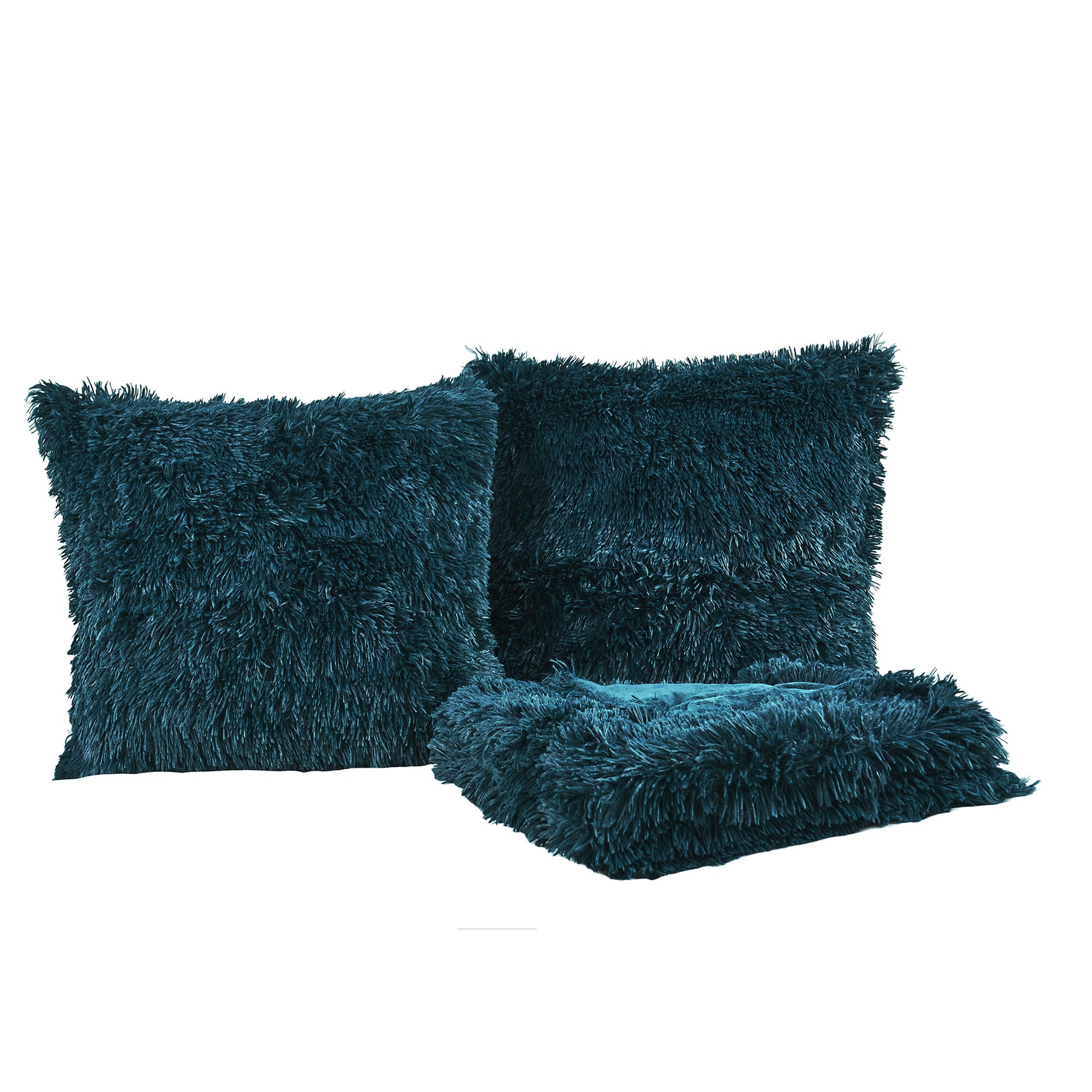 Add cozy flair to your living space with this Halsted 3-piece throw and pillow shell set. Ideal for a bed or your favorite armchair, the set includes one throw blanket and two square pillow shells, crafted from microfiber polyester with shaggy fauxfur fronts for a snuggly, warm texture. The machine washable set is available in your choice of burnt orange, ivory, silver blue, or teal.