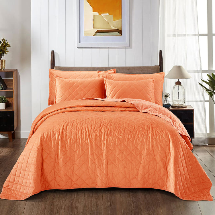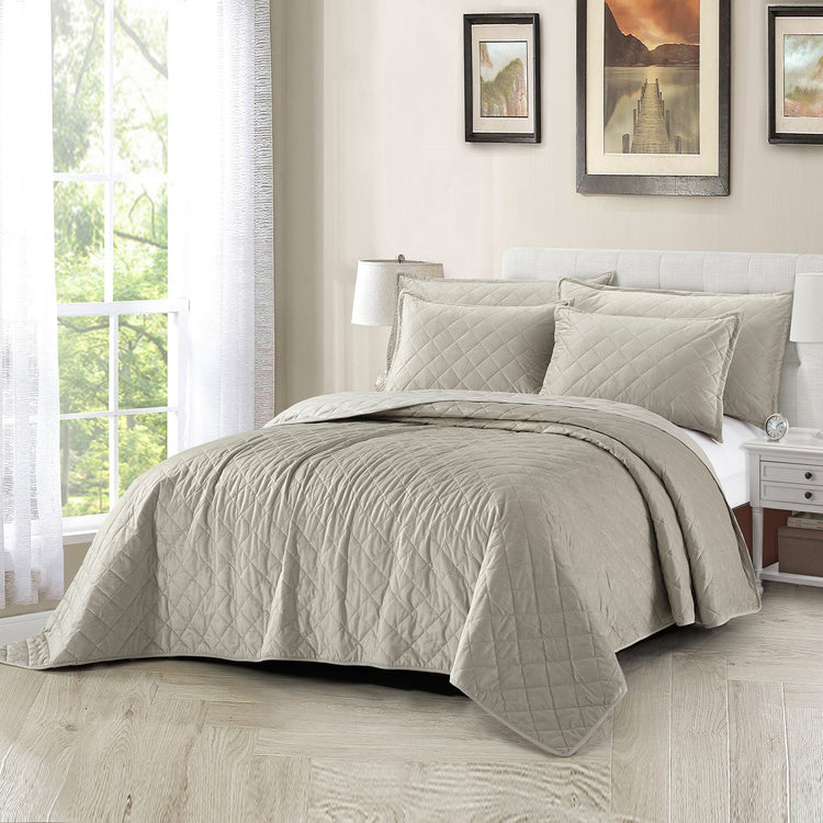 Super Soft Flannel Microfiber Velvet 5-Piece bedspread sets are designed for comfort, warmth, and class. The highly detailed diamond pattern quilting provides an elegant ambiance to your bedroom. A set includes 1 – Oversized Bedspread 122 inches x 106 inches, 2 - Shams 20 inches x 26 inches and 2 -Shams 20 inches x 36 inches. Simply machine wash, separately, using cold water on a gentle cycle. Tumble dry on lowest heat setting to avoid heat damage to your set.